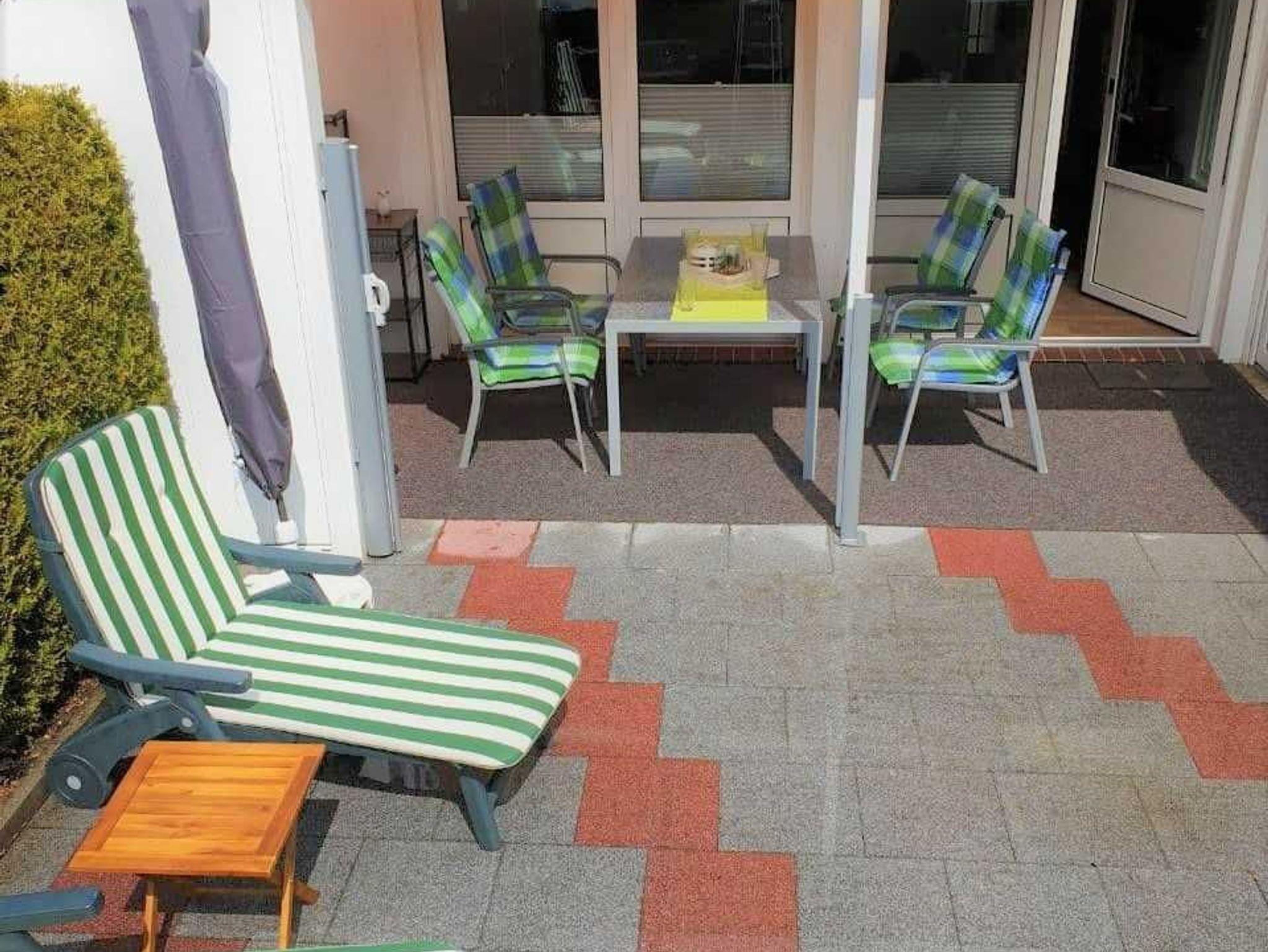 • Die Terrasse mit Innenhofcharakter, überdachte Sitzecke, Liegestühle, Grill ist durch eine Hecke und einen kleinen Zaun geschützt.