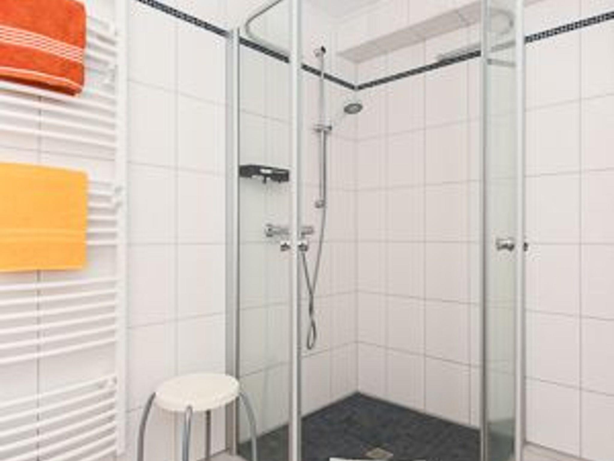 Badezimmer mit Dusche, Waschtisch und WC