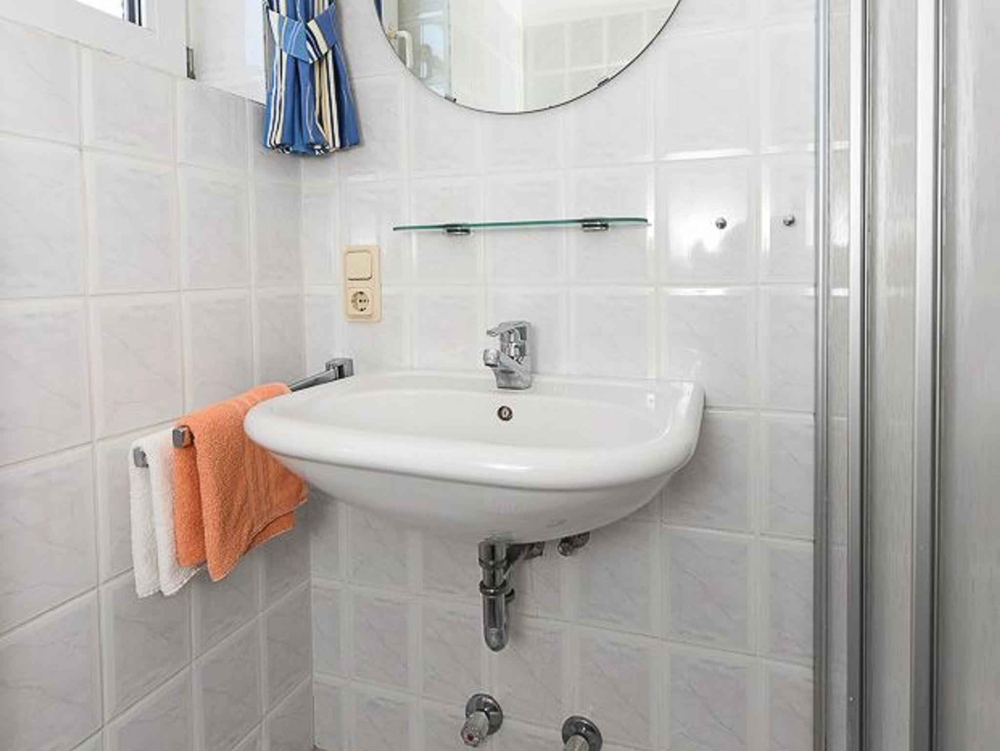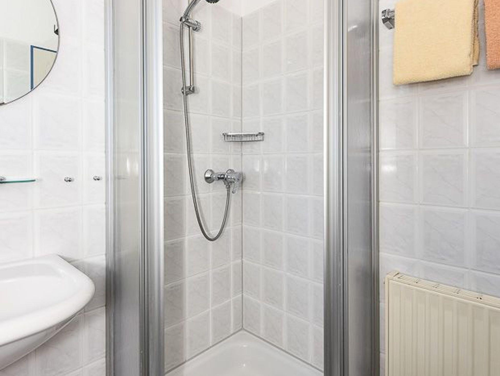 Badezimmer mit Dusche, Waschtisch und WC