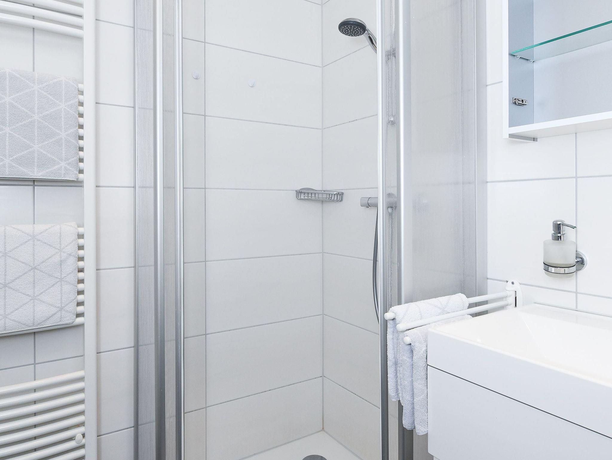 Badezimmer mit Dusche, Waschtisch und WC