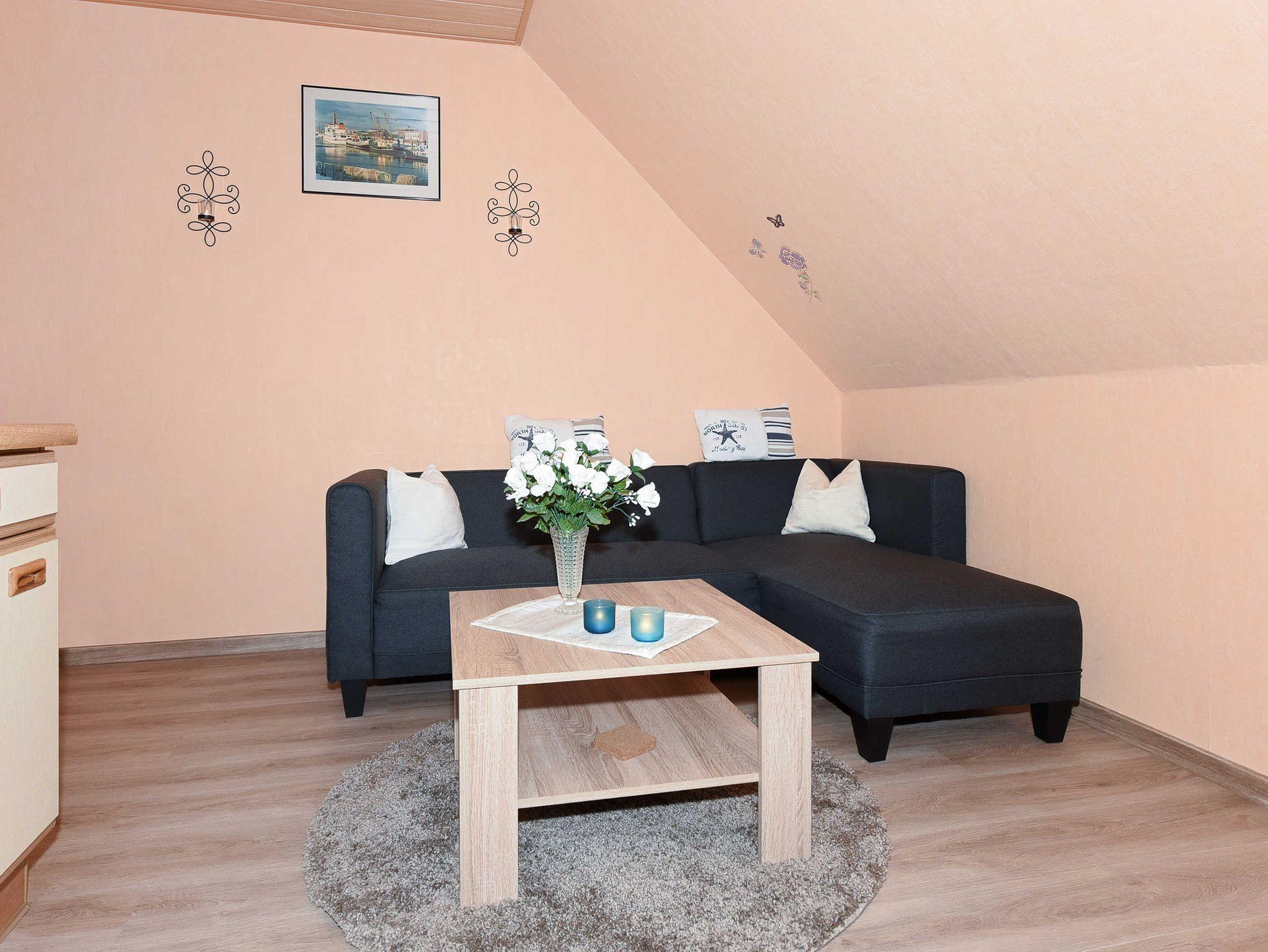 Größe ca. 45 Quadratmeter, Wohnraum mit integrierter Küche, Schlafzimmer, zweites separates Schlafzimmer/Kinderzimmer, Badezimmer mit Dusche, Waschtisch und WC, Obergeschoss, optimal für 2 bis 3 Personen.