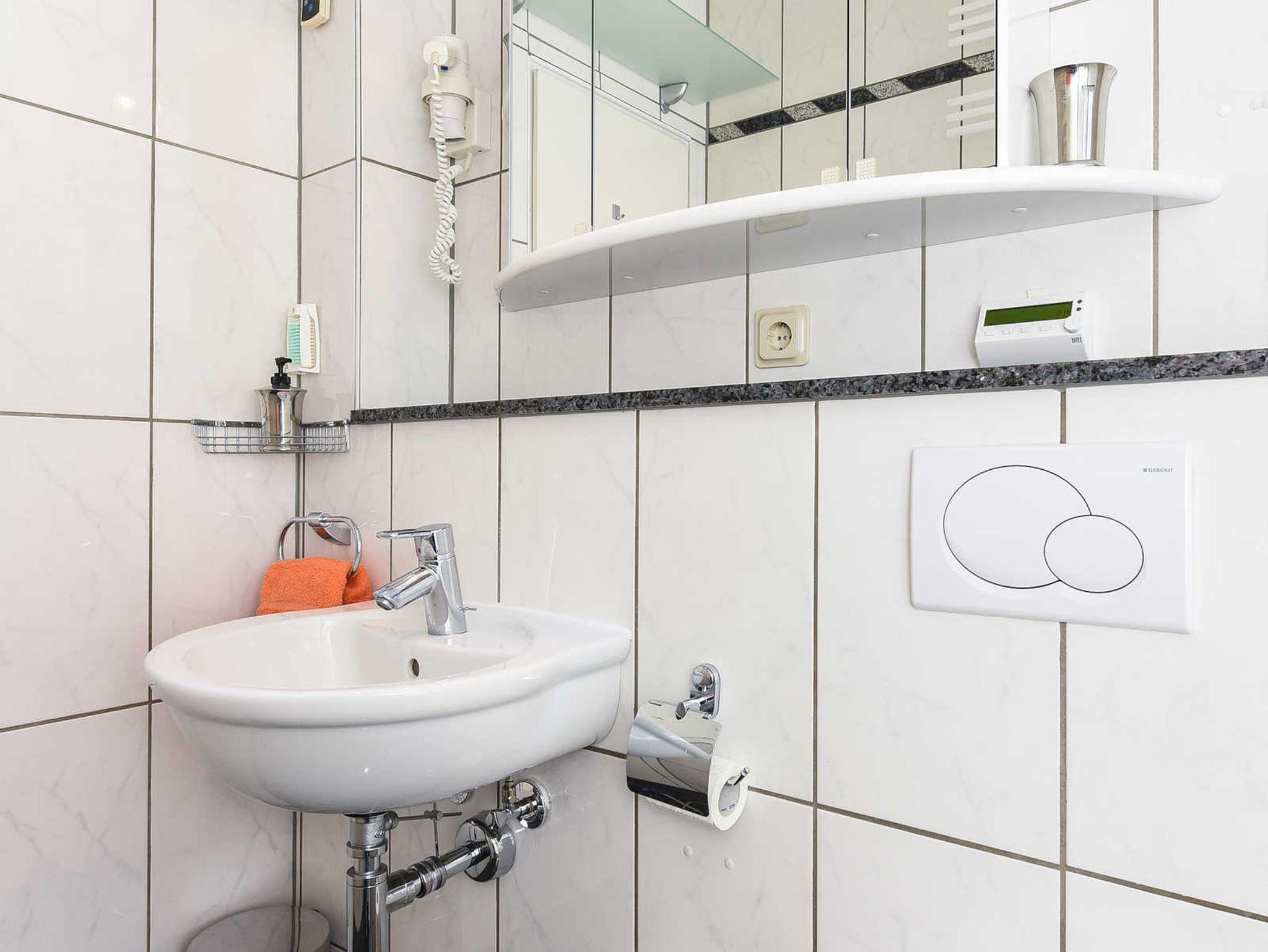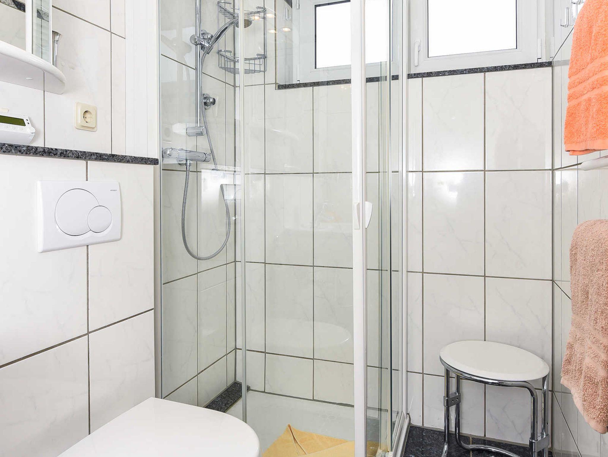 Badezimmer mit Dusche, Waschtisch und WC