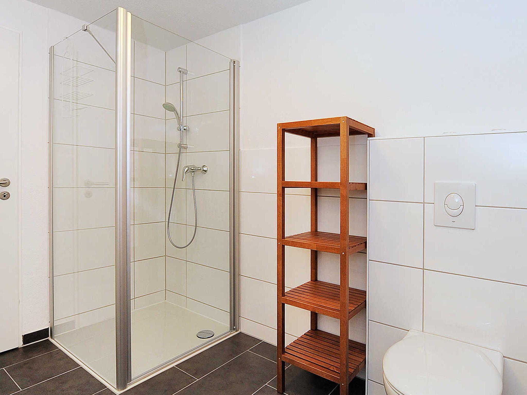 Badezimmer mit Dusche, Waschtisch und WC