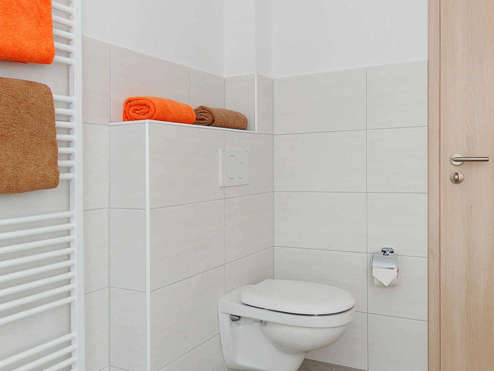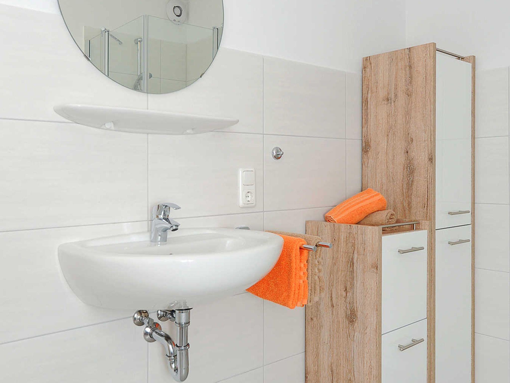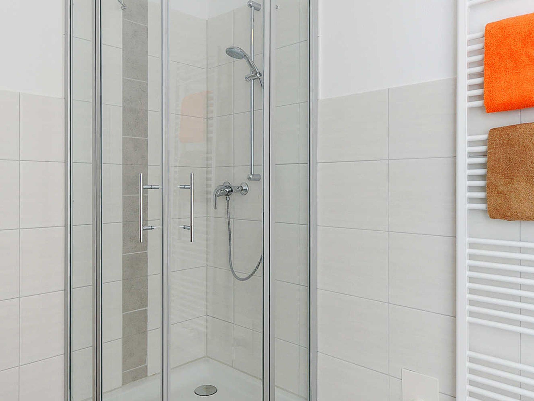 Badezimmer mit Dusche, Waschtisch und WC