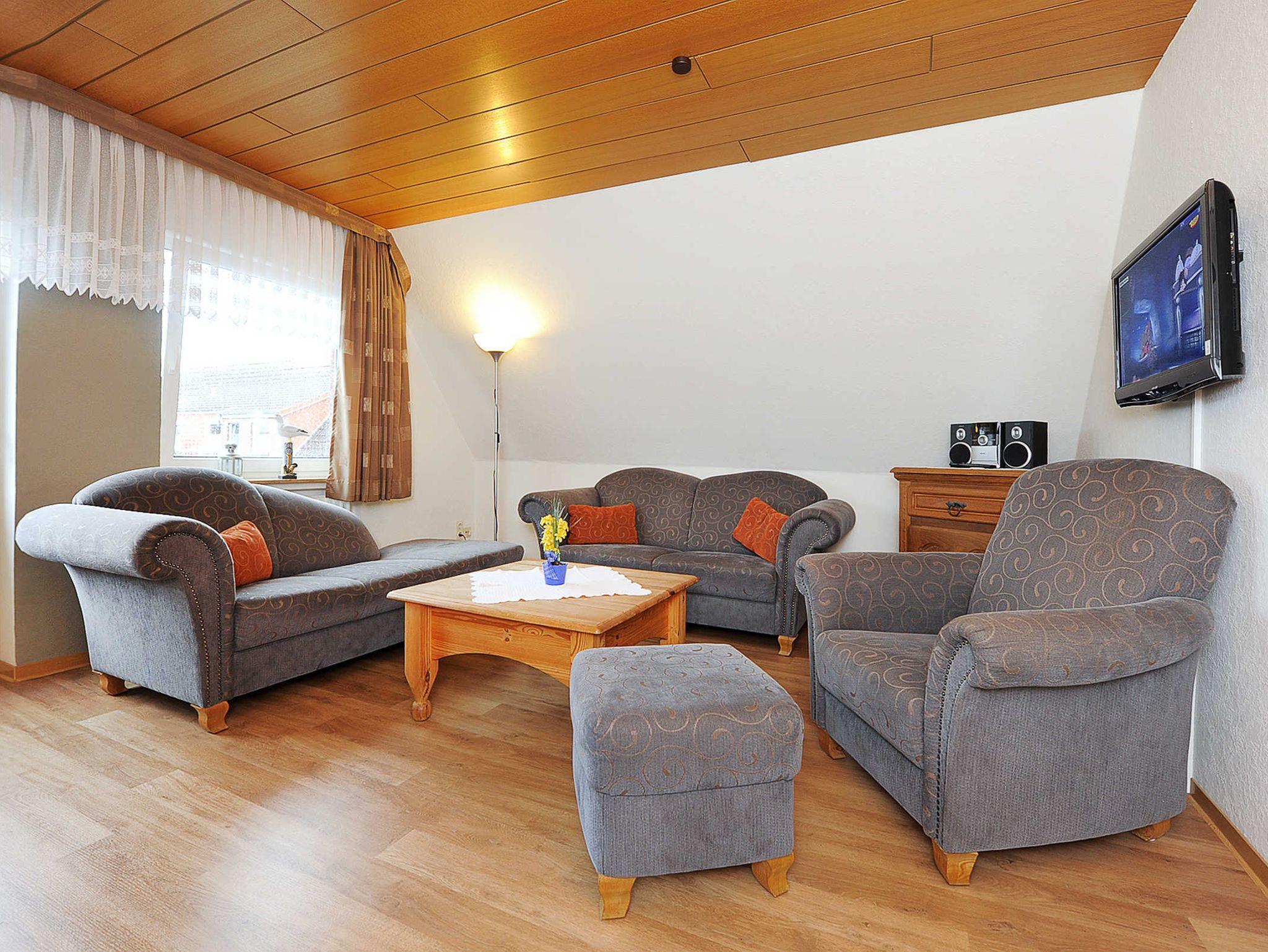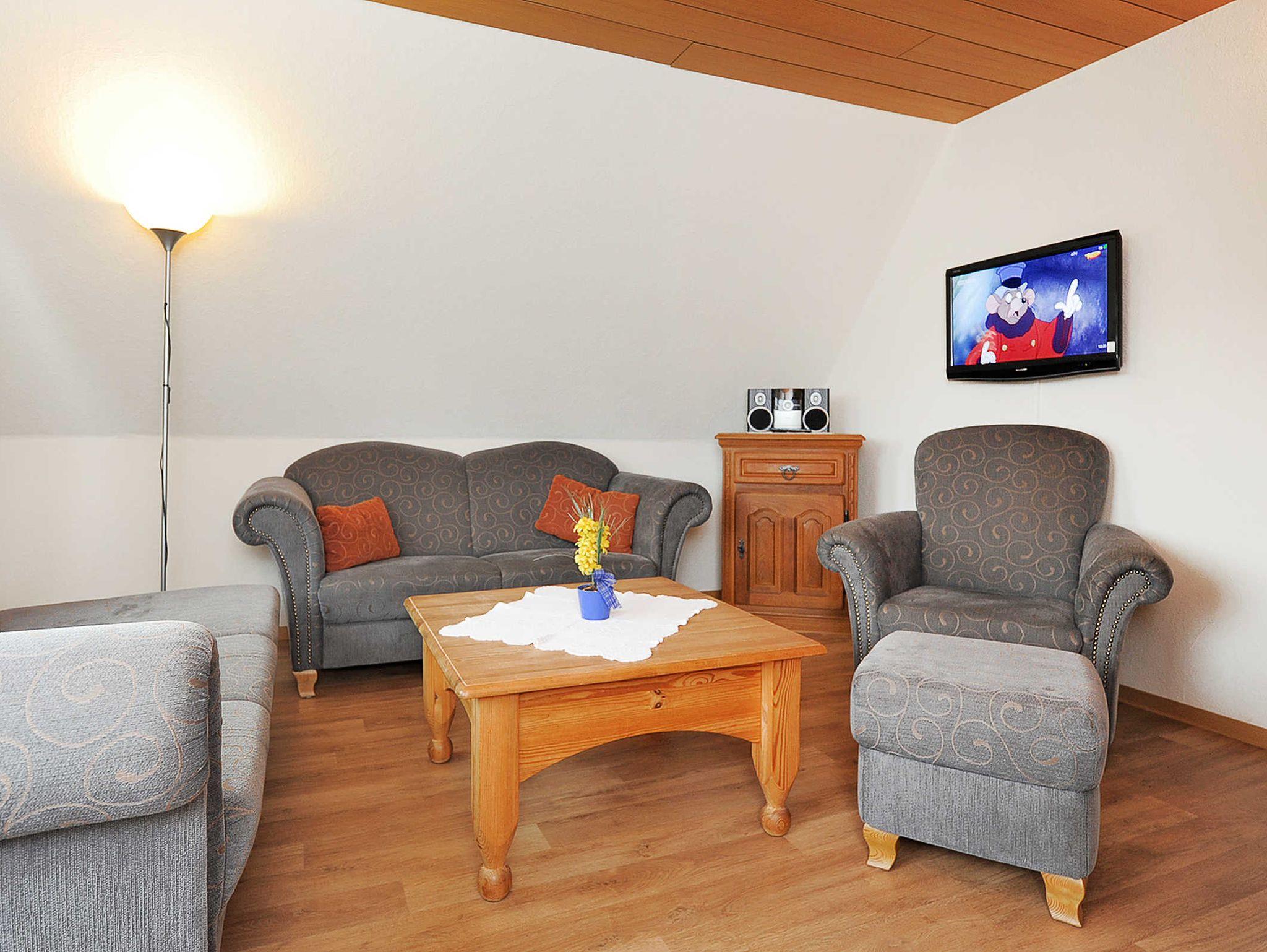 Größe ca. 85 Quadratmeter, Wohnzimmer, Küche, Schlafzimmer, zweites separates Schlafzimmer/Kinderzimmer, drittes separates Schlafzimmer/Kinderzimmer, Badezimmer mit Dusche, Waschtisch und WC, Obergeschoss, Balkon, optimal für 2 bis 6 Personen.
