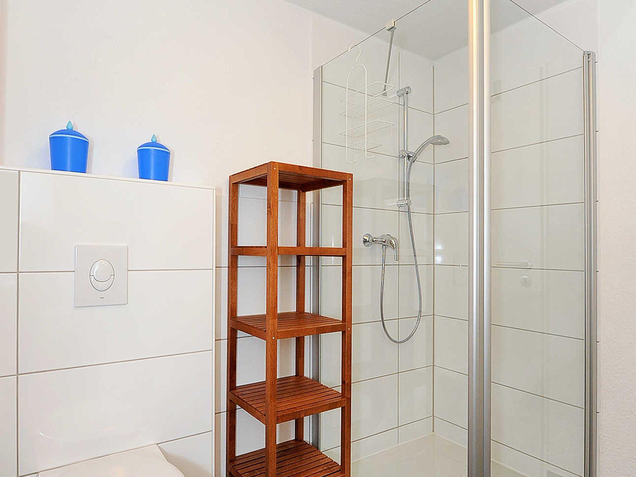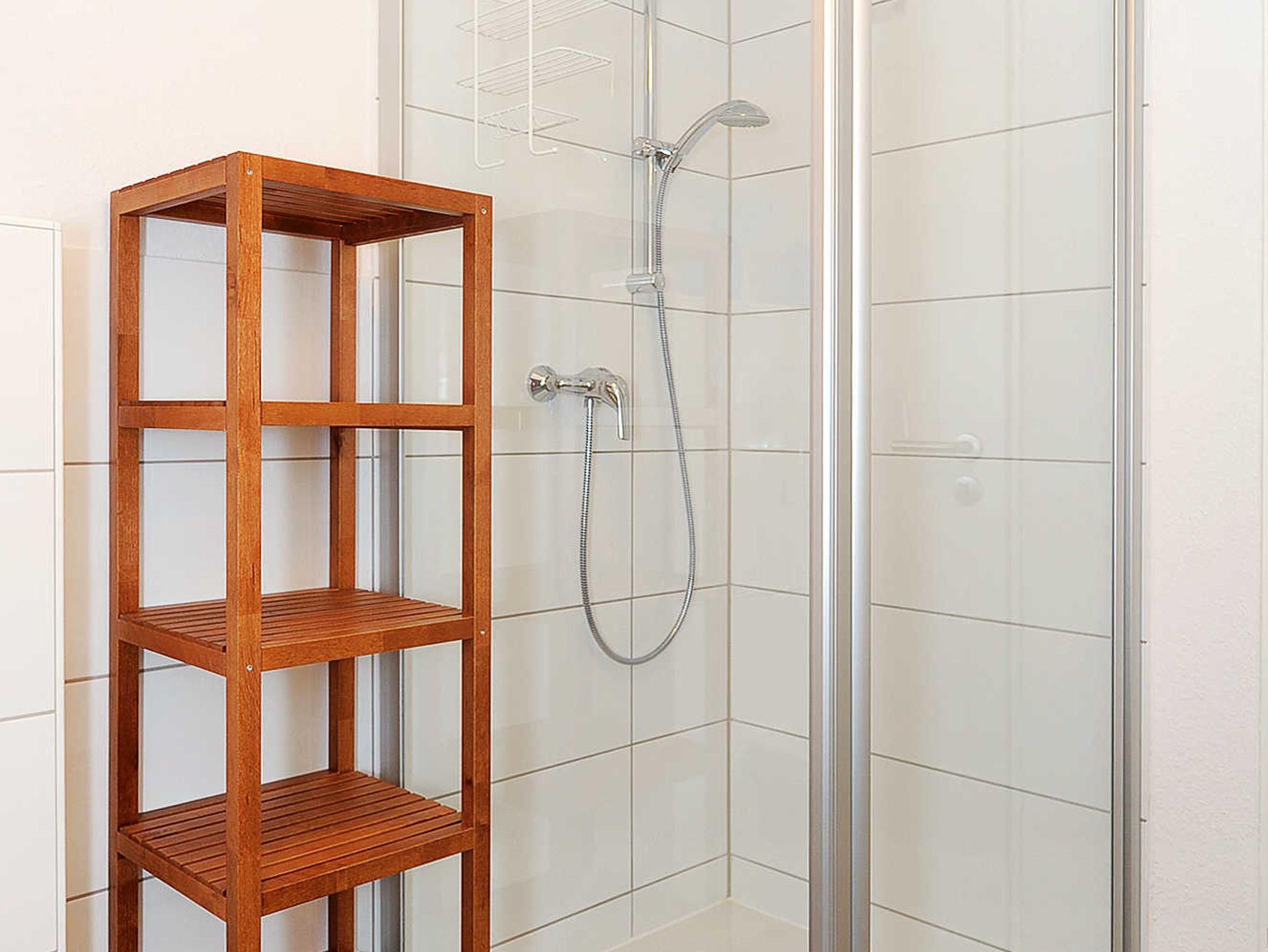 Badezimmer mit Dusche, Waschtisch und WC
