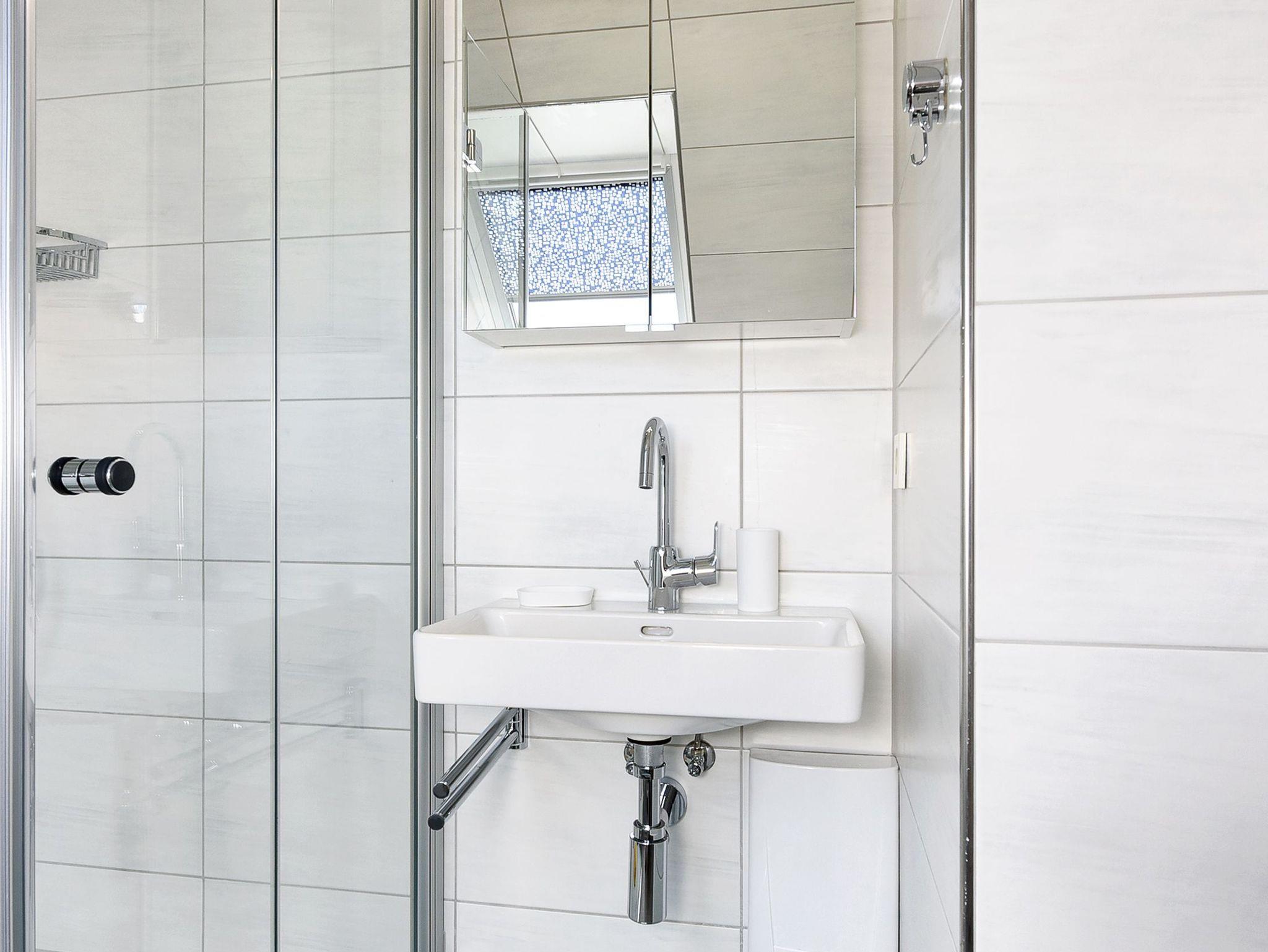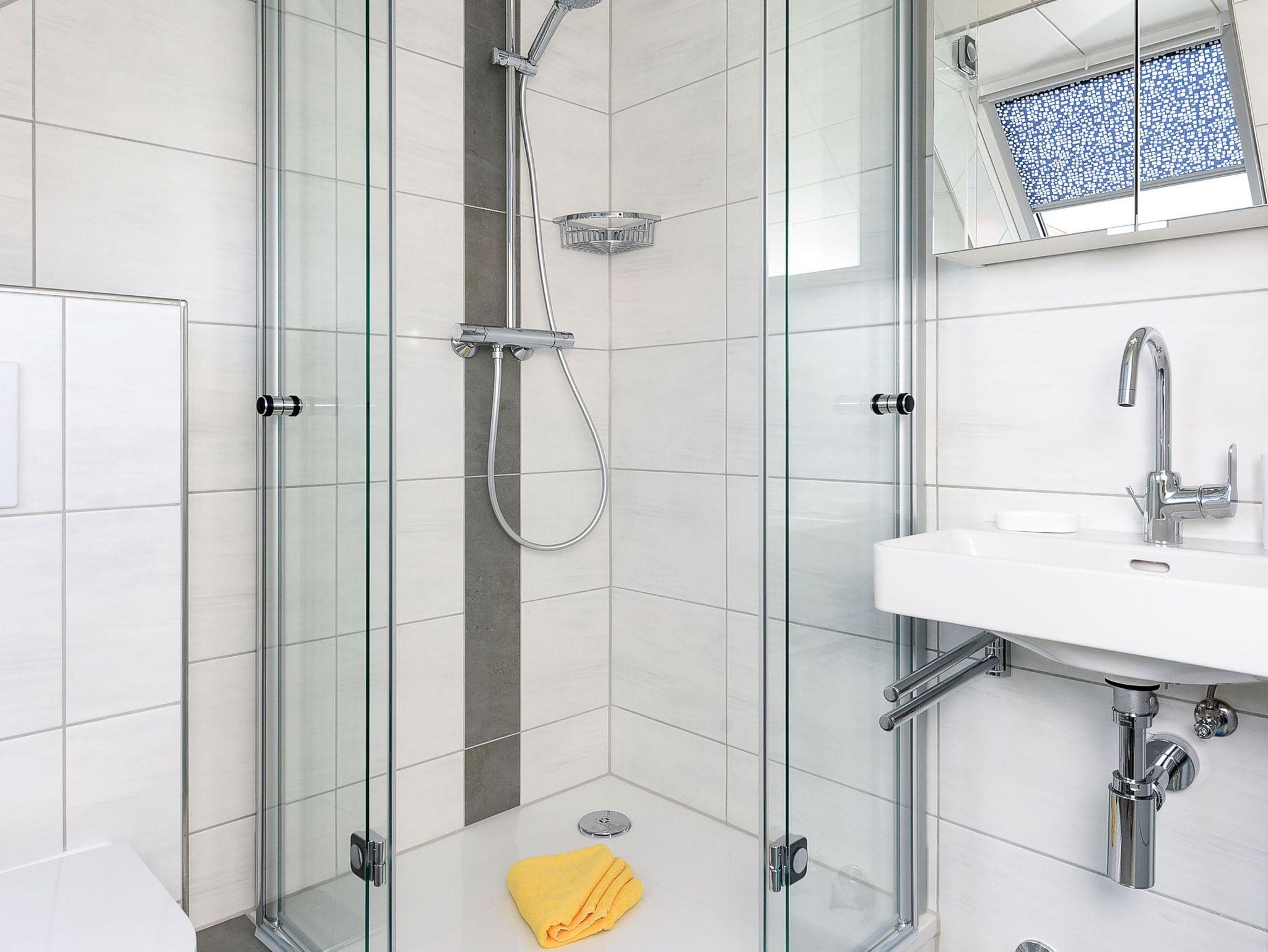 Badezimmer mit Dusche, Waschtisch und WC,