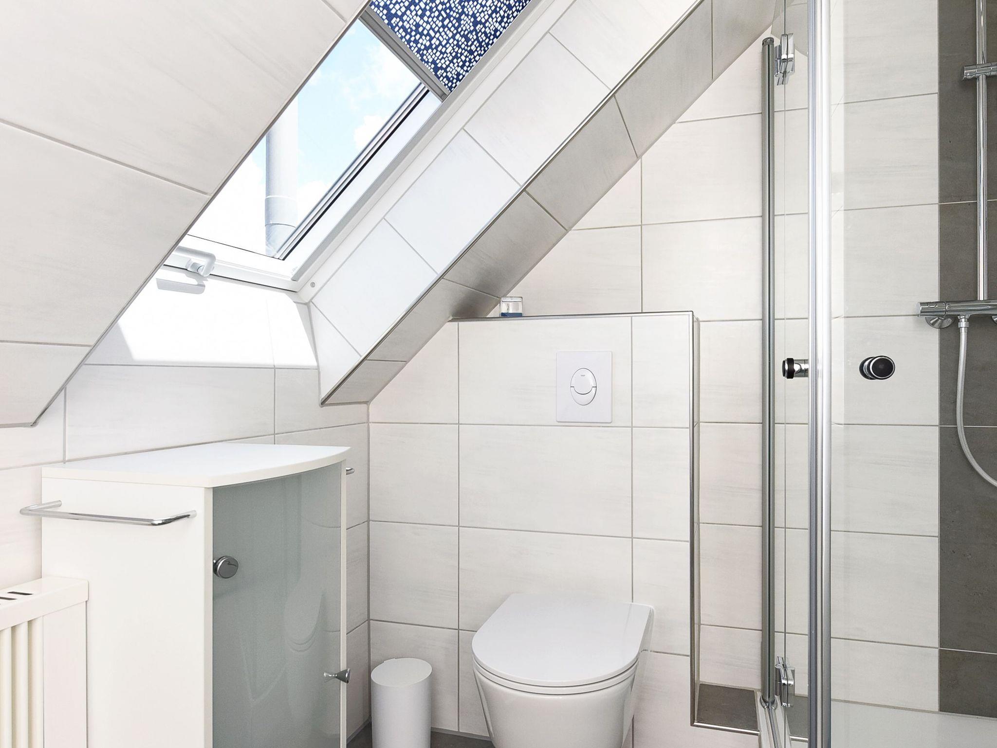 Badezimmer mit Dusche, Waschtisch und WC