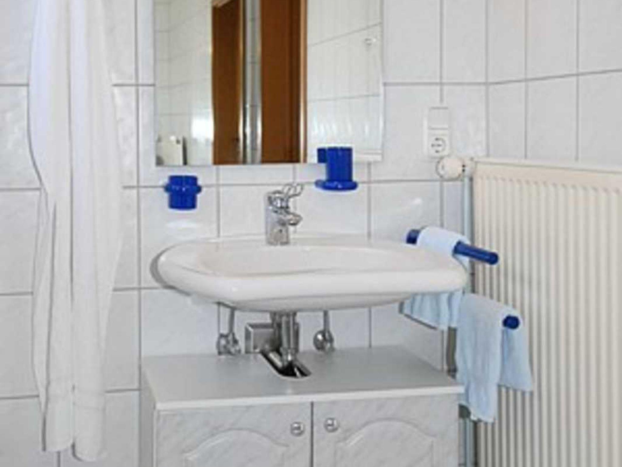 Badezimmer mit Dusche, Waschtisch und WC