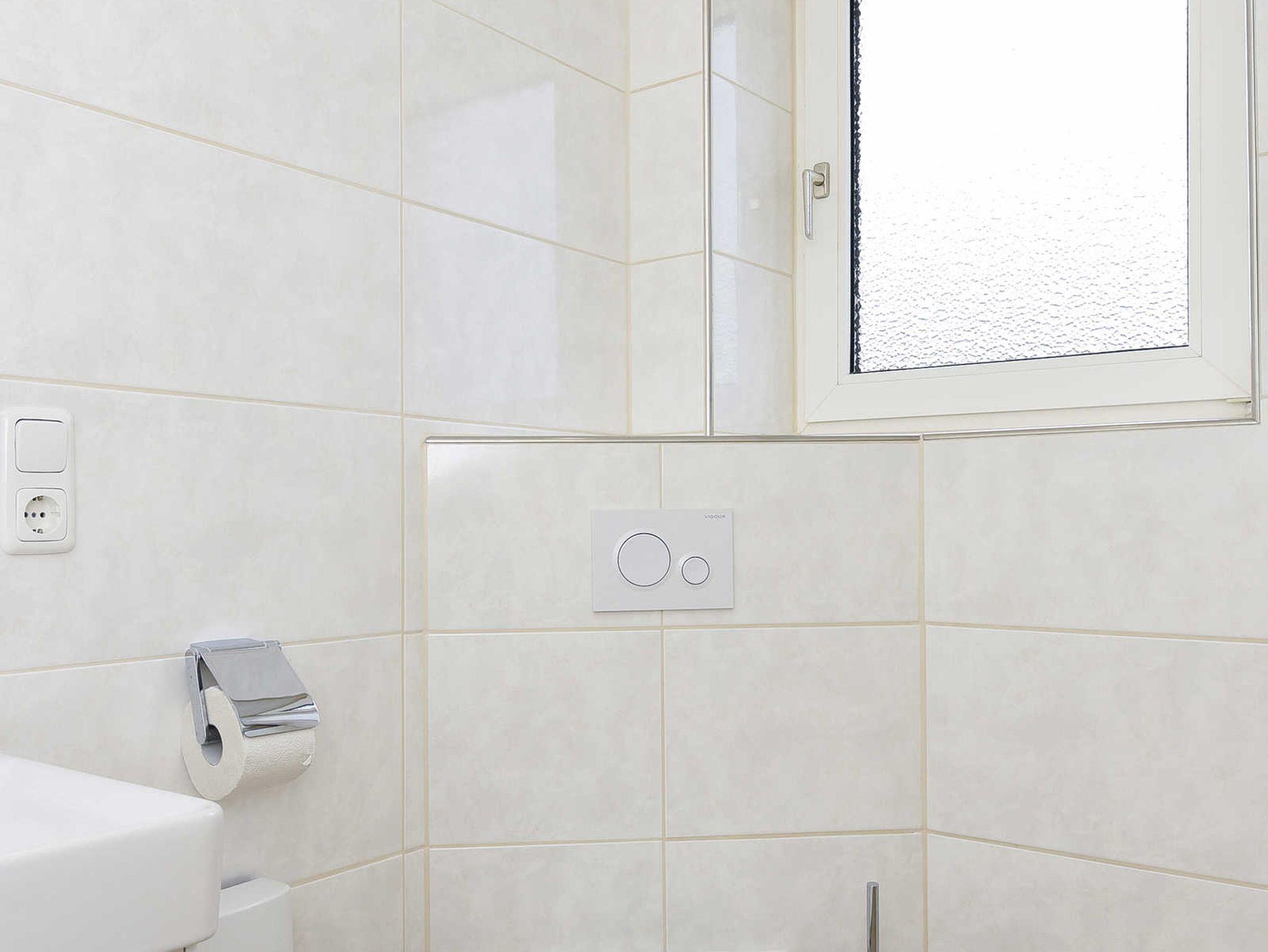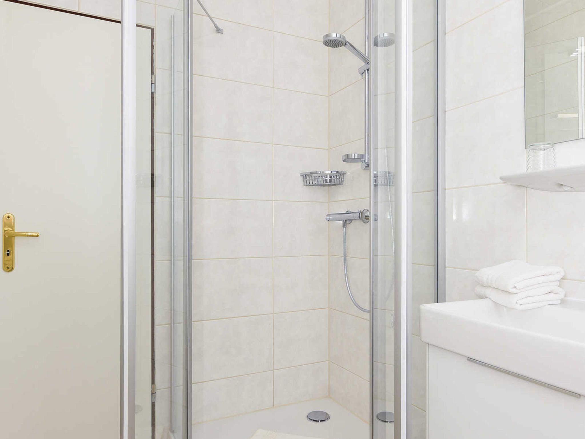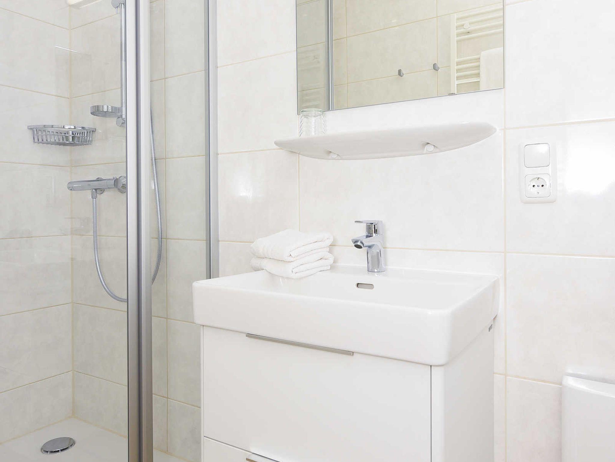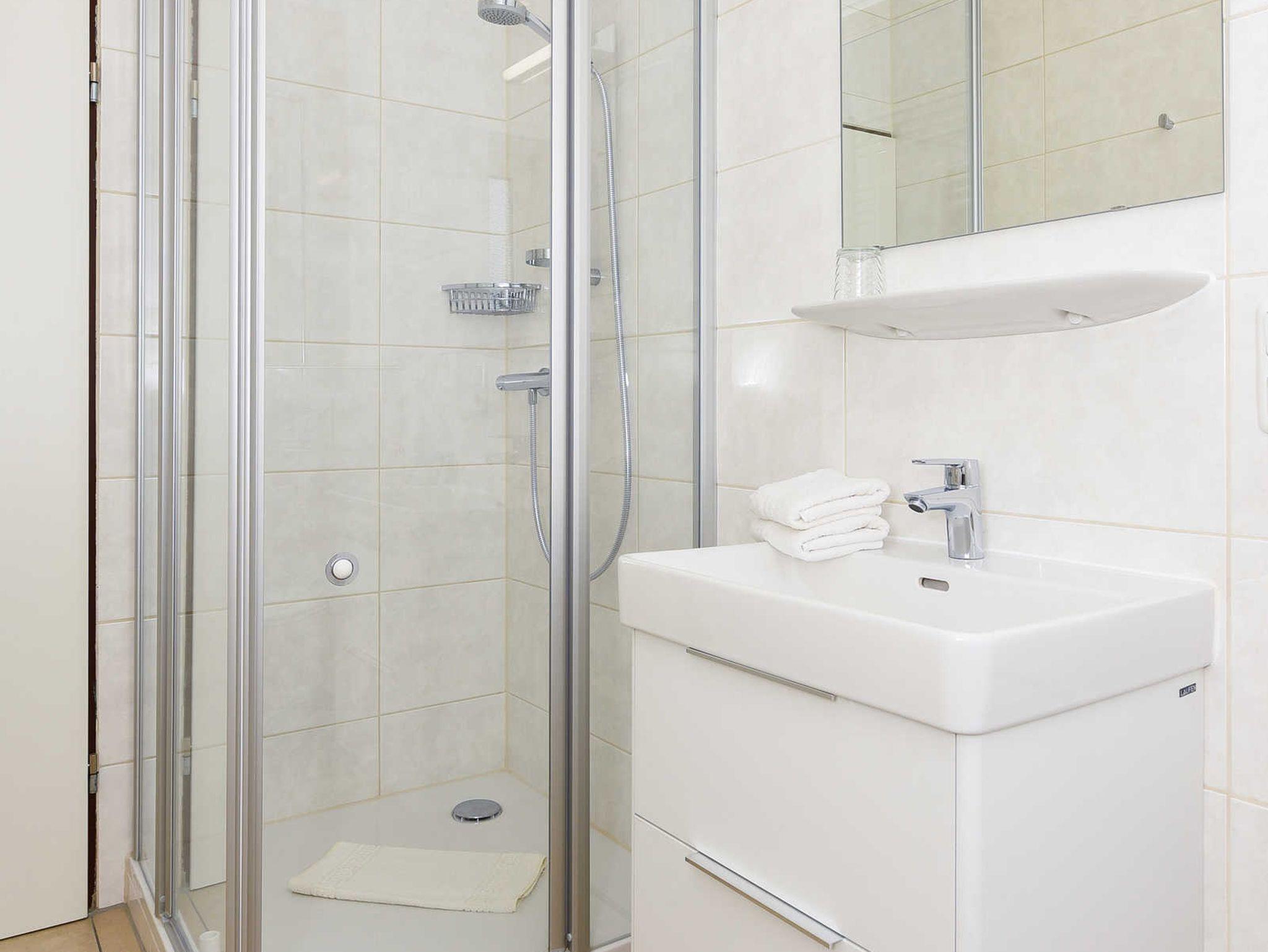 Badezimmer mit Dusche, Waschtisch und WC