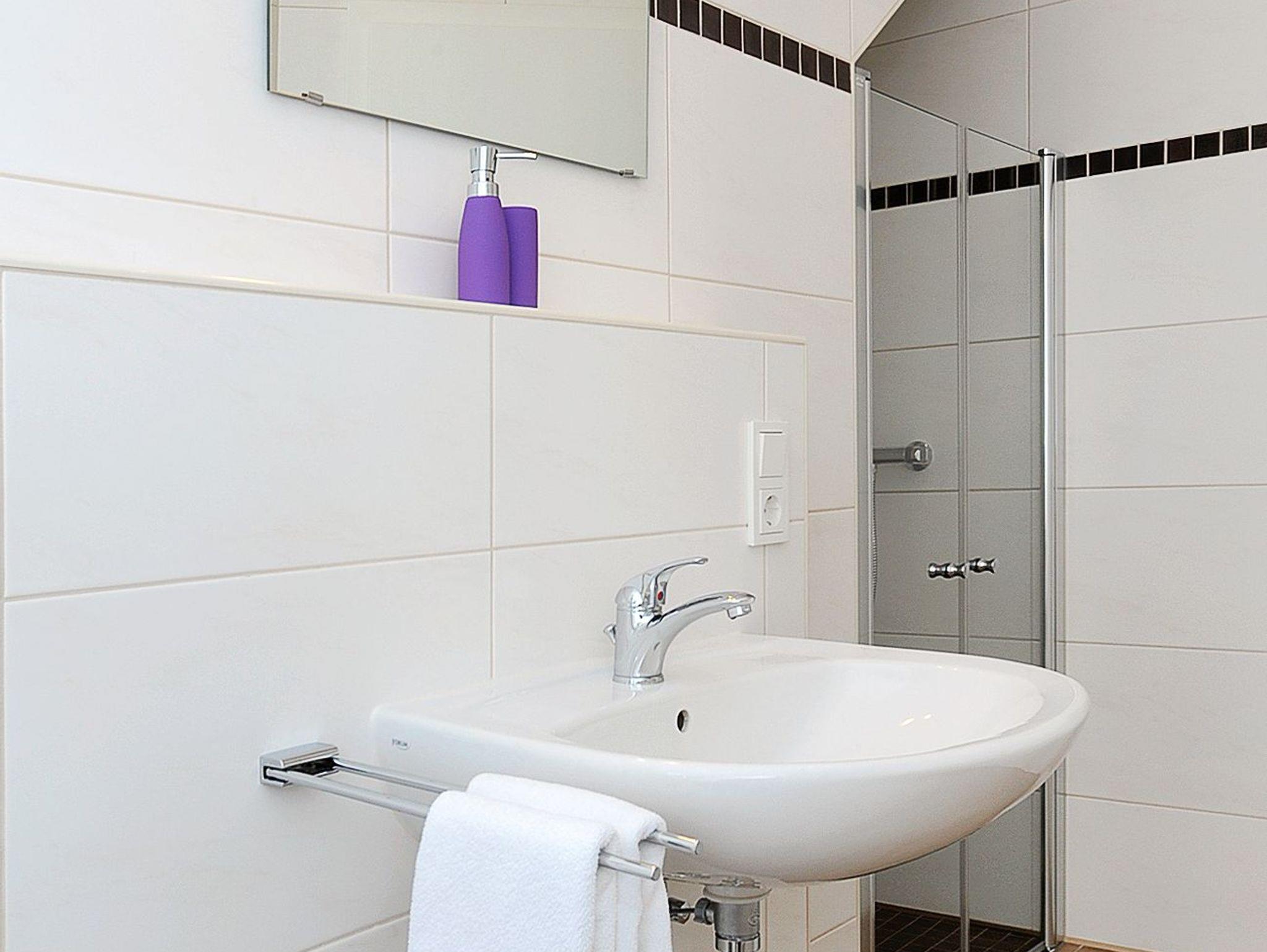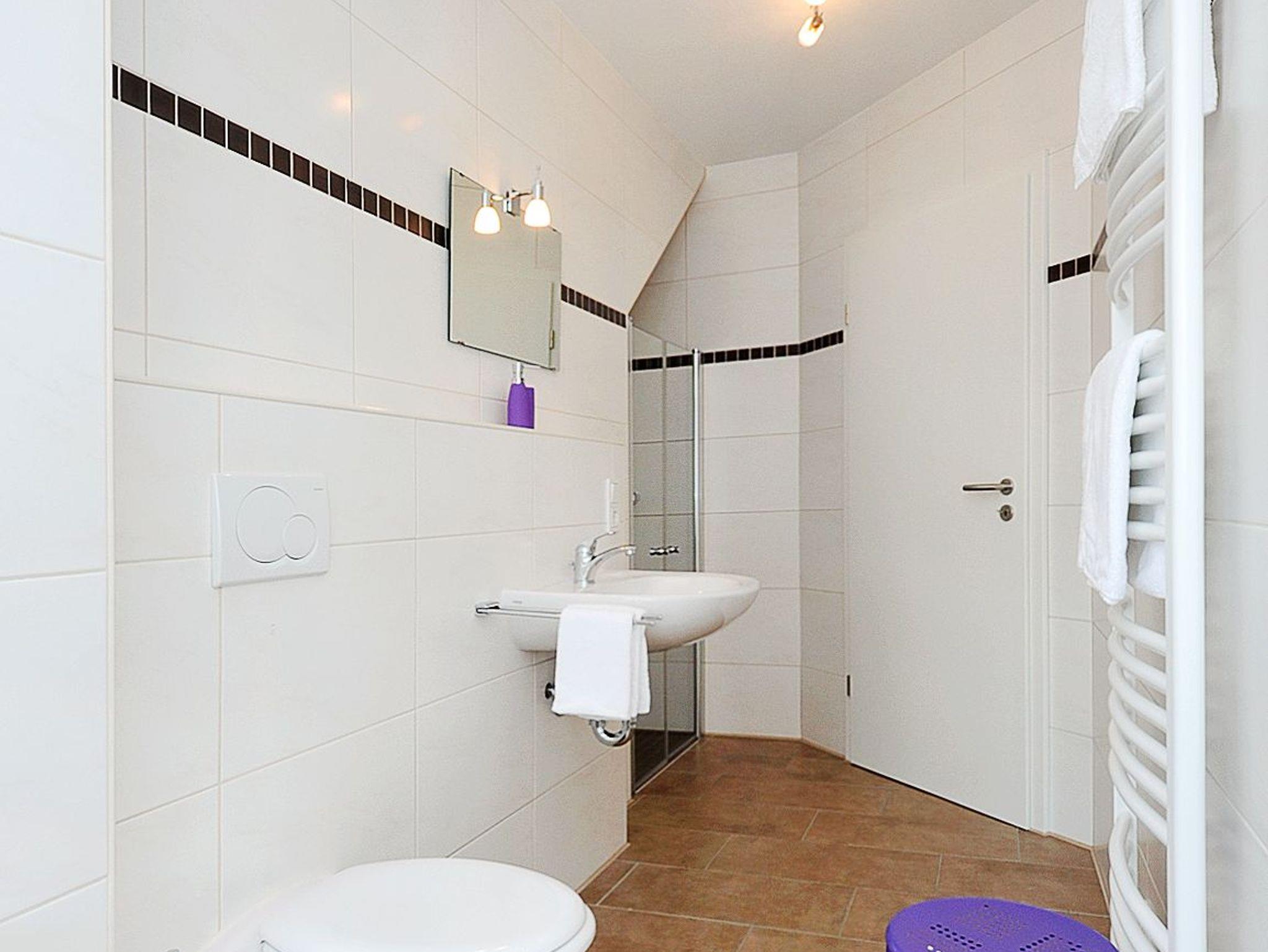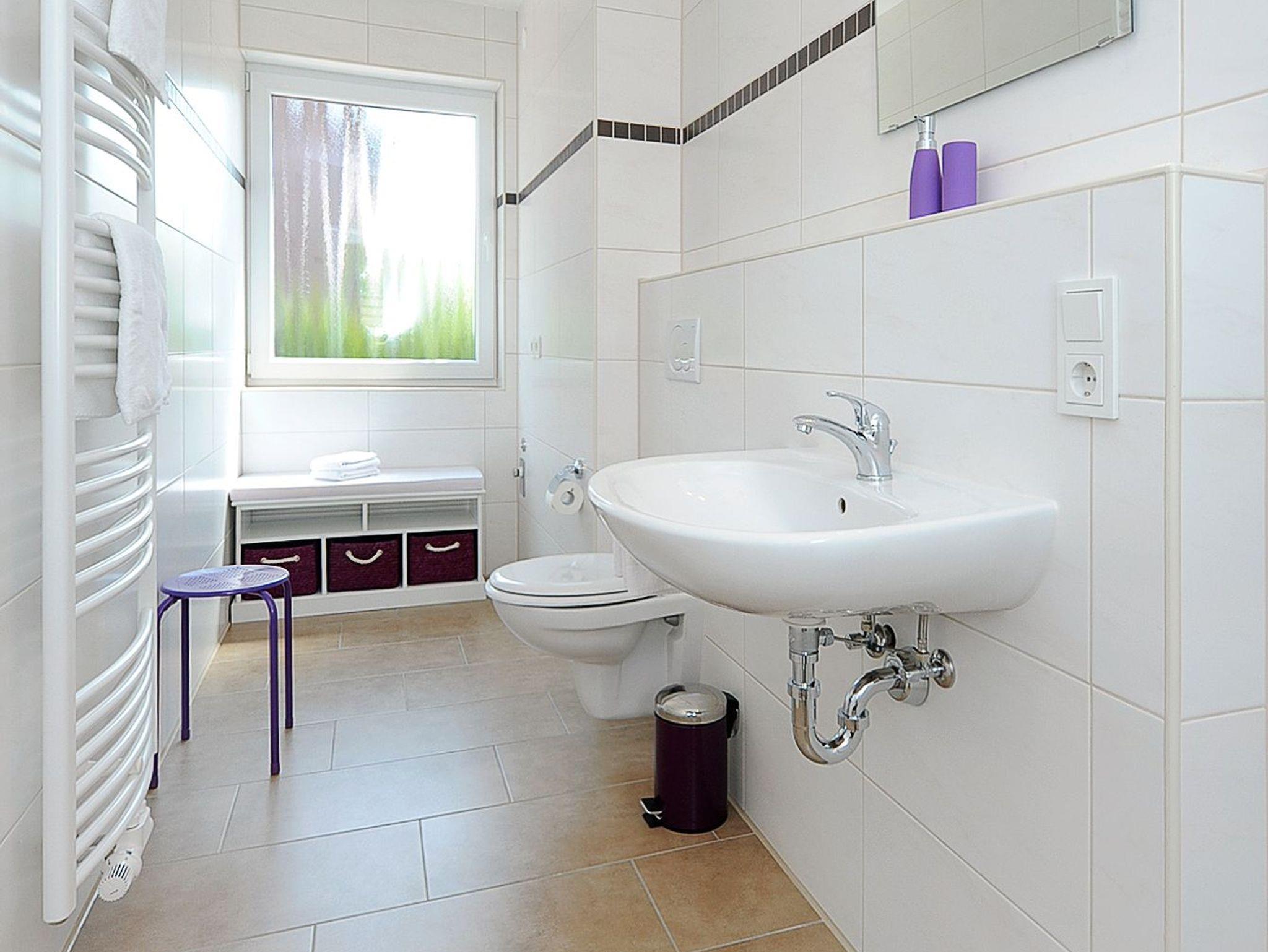 Badezimmer mit Dusche, Waschtisch und WC