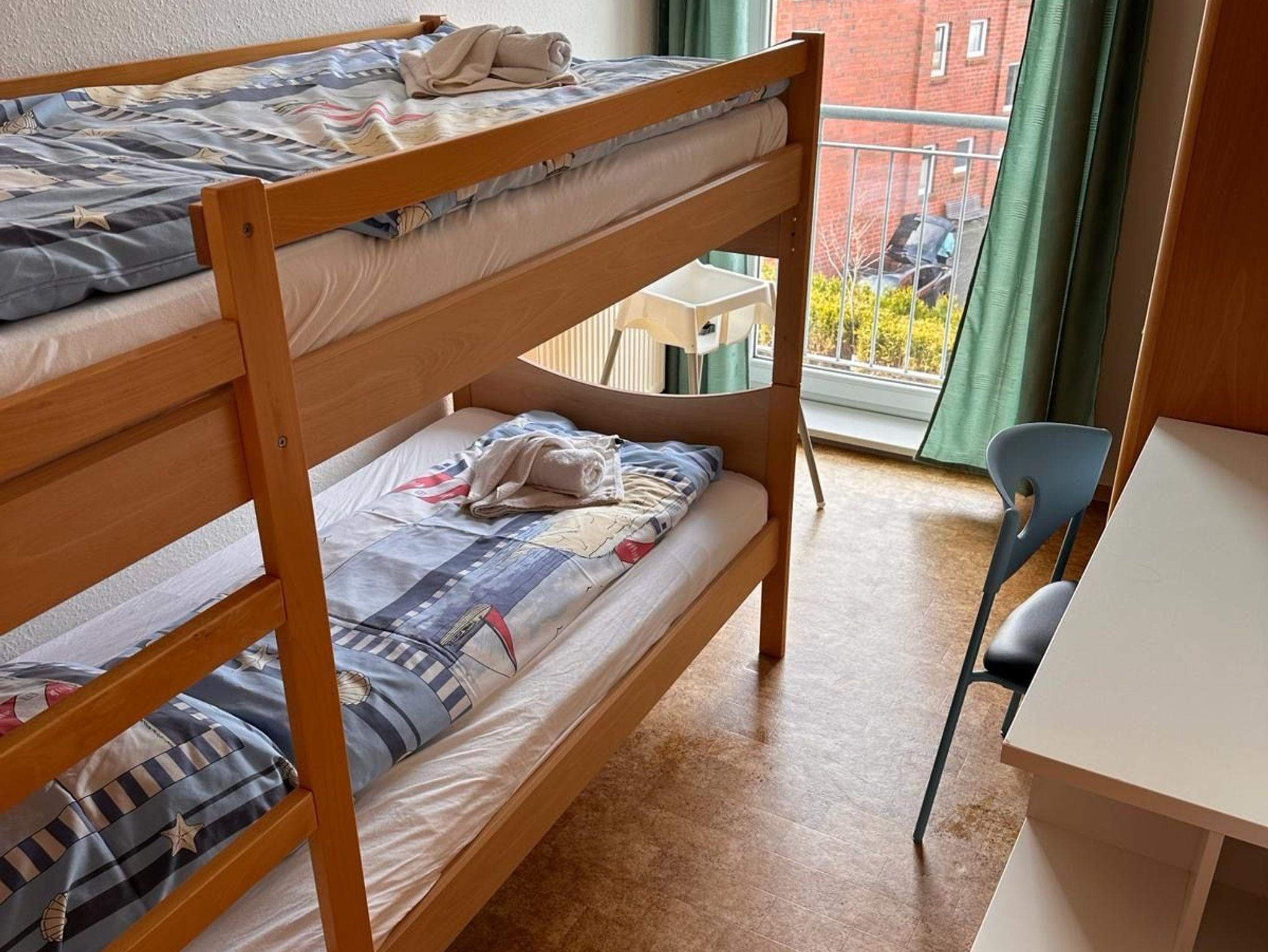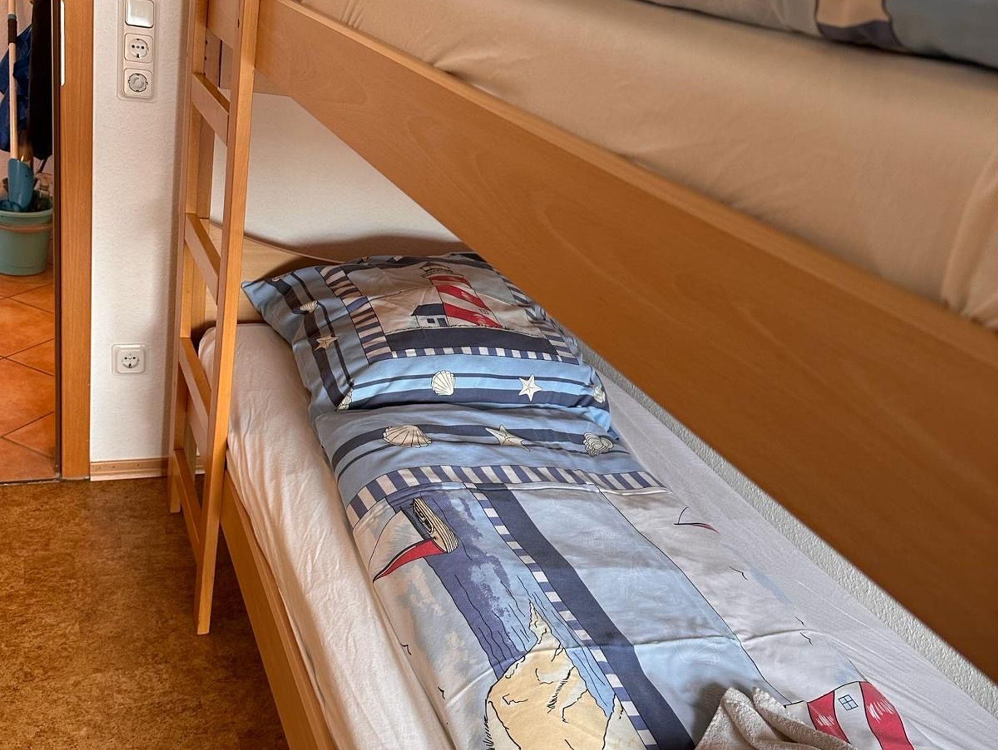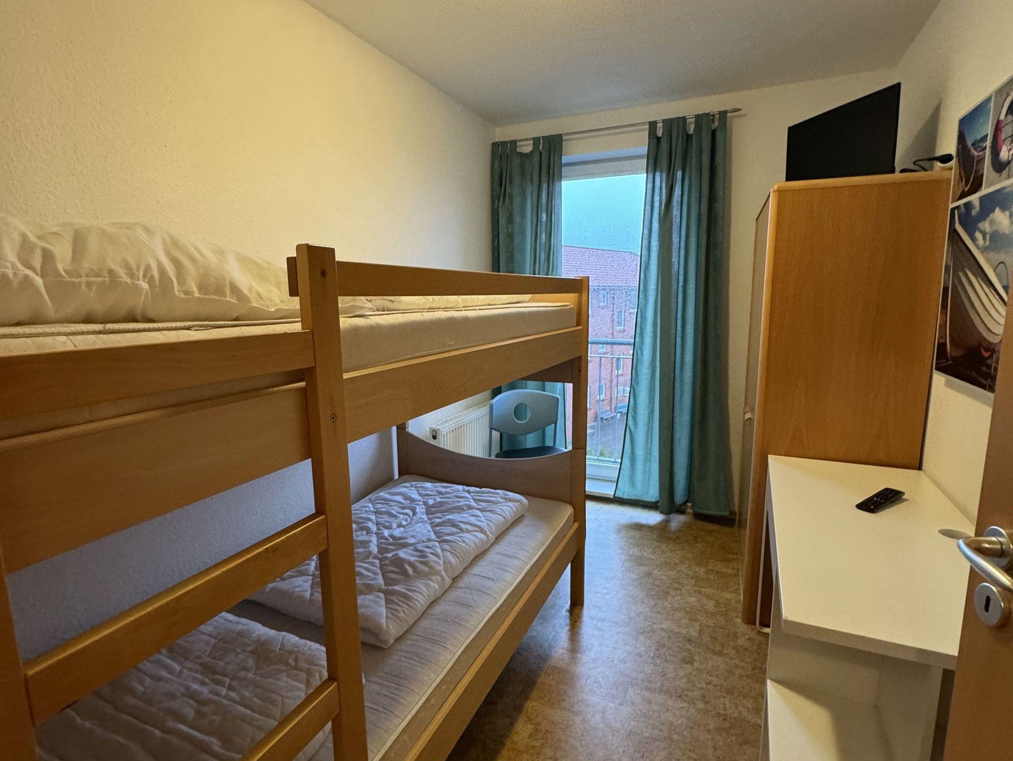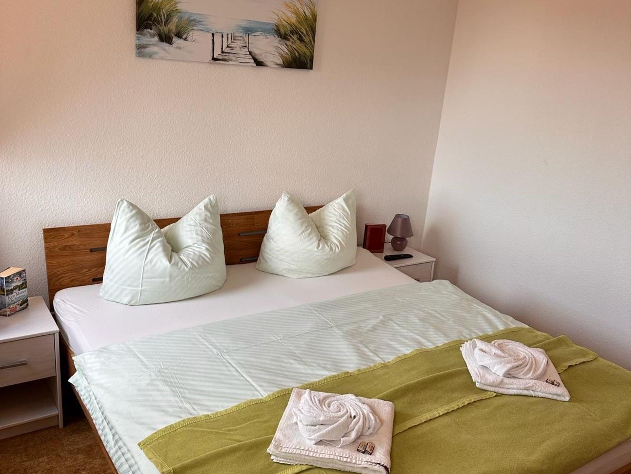Ferienwohnung Roter Sand, Elternschlafzimmer mit Doppelbett, Kinderschlafzimmer 2 Betten als Hochbett, Badezimmer mit Dusche und WC, Wohnzimmer mit Essbereich und Küche, Balkon
