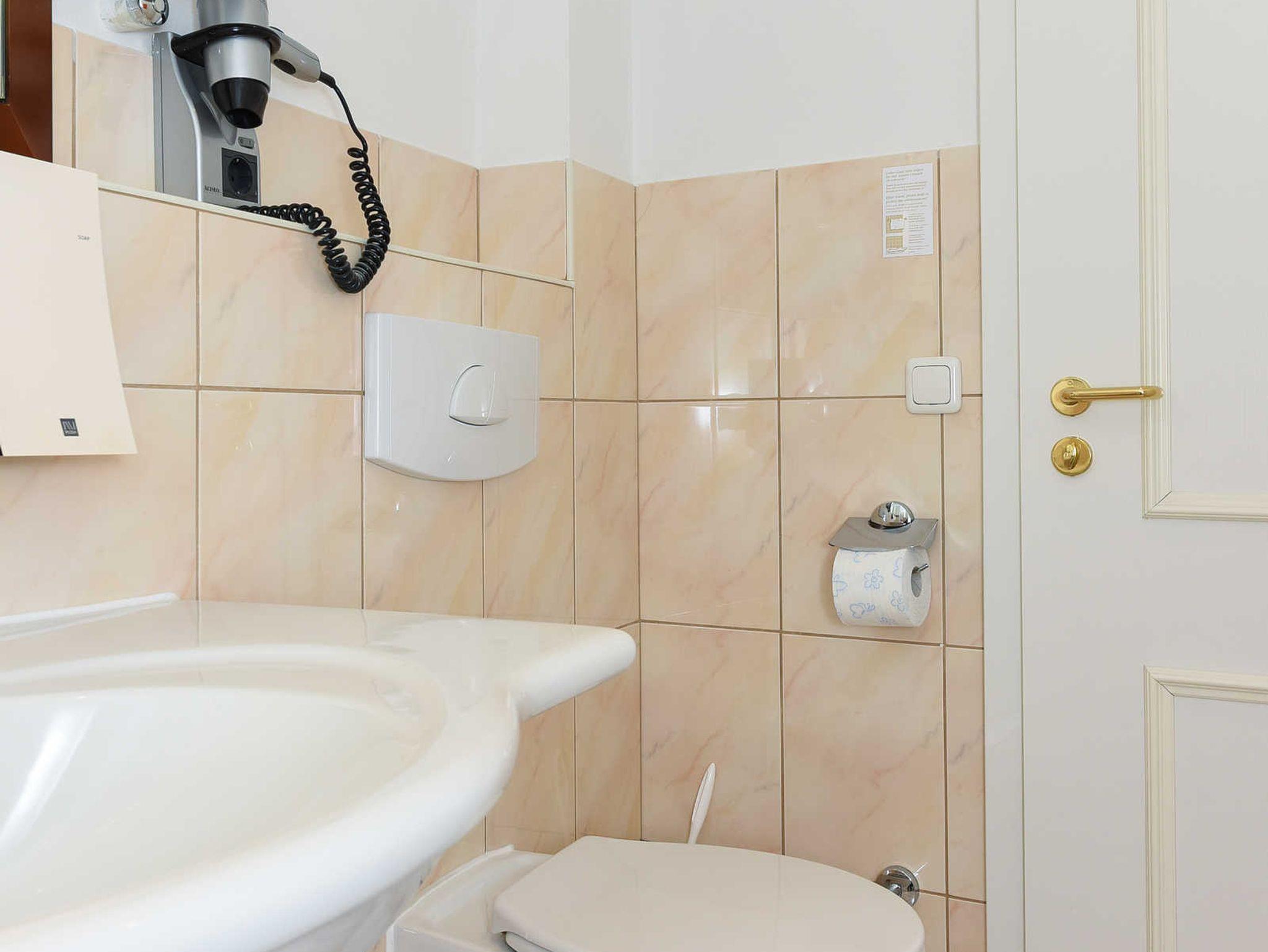 Badezimmer mit Dusche, Waschtisch und WC
