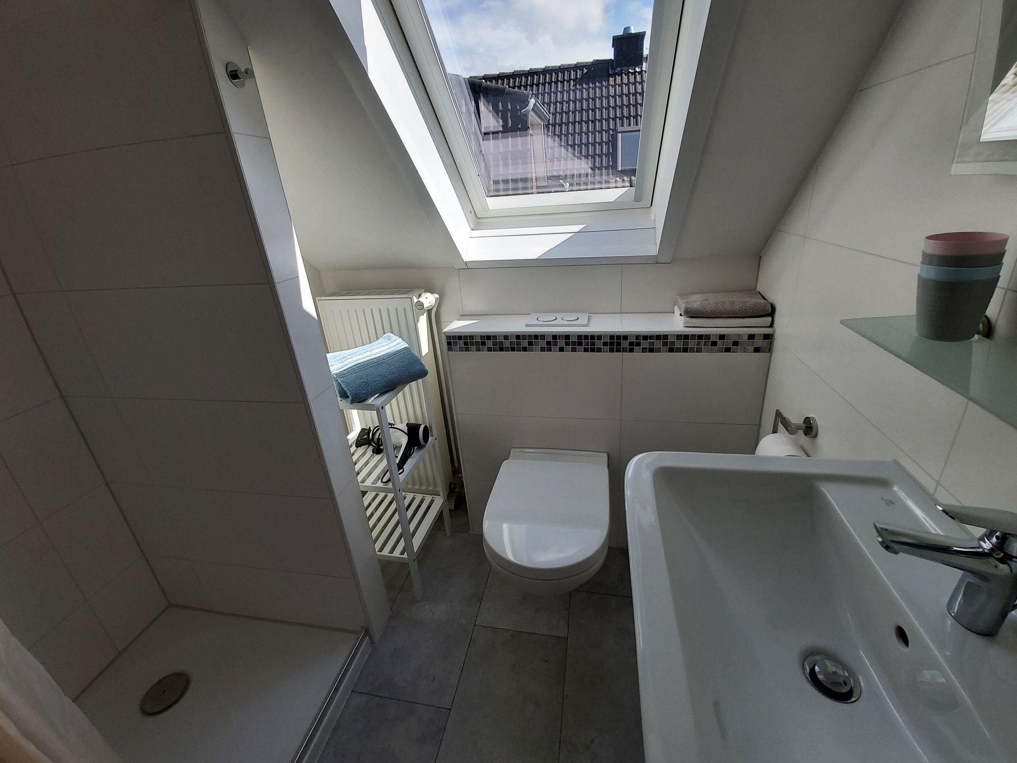 Badezimmer mit Dusche, Waschtisch und WC