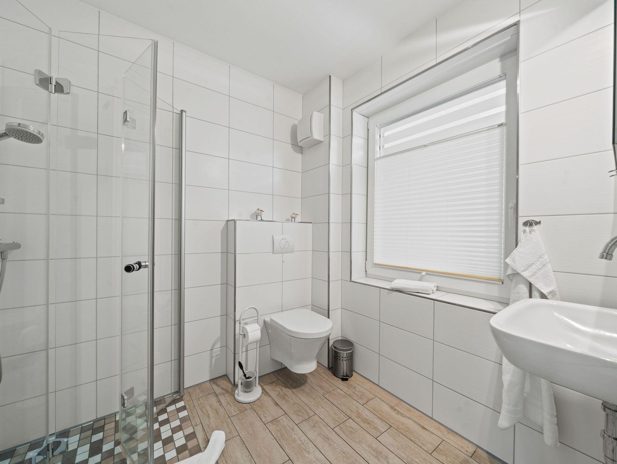 - Badezimmer mit Dusche, Waschtisch und WC