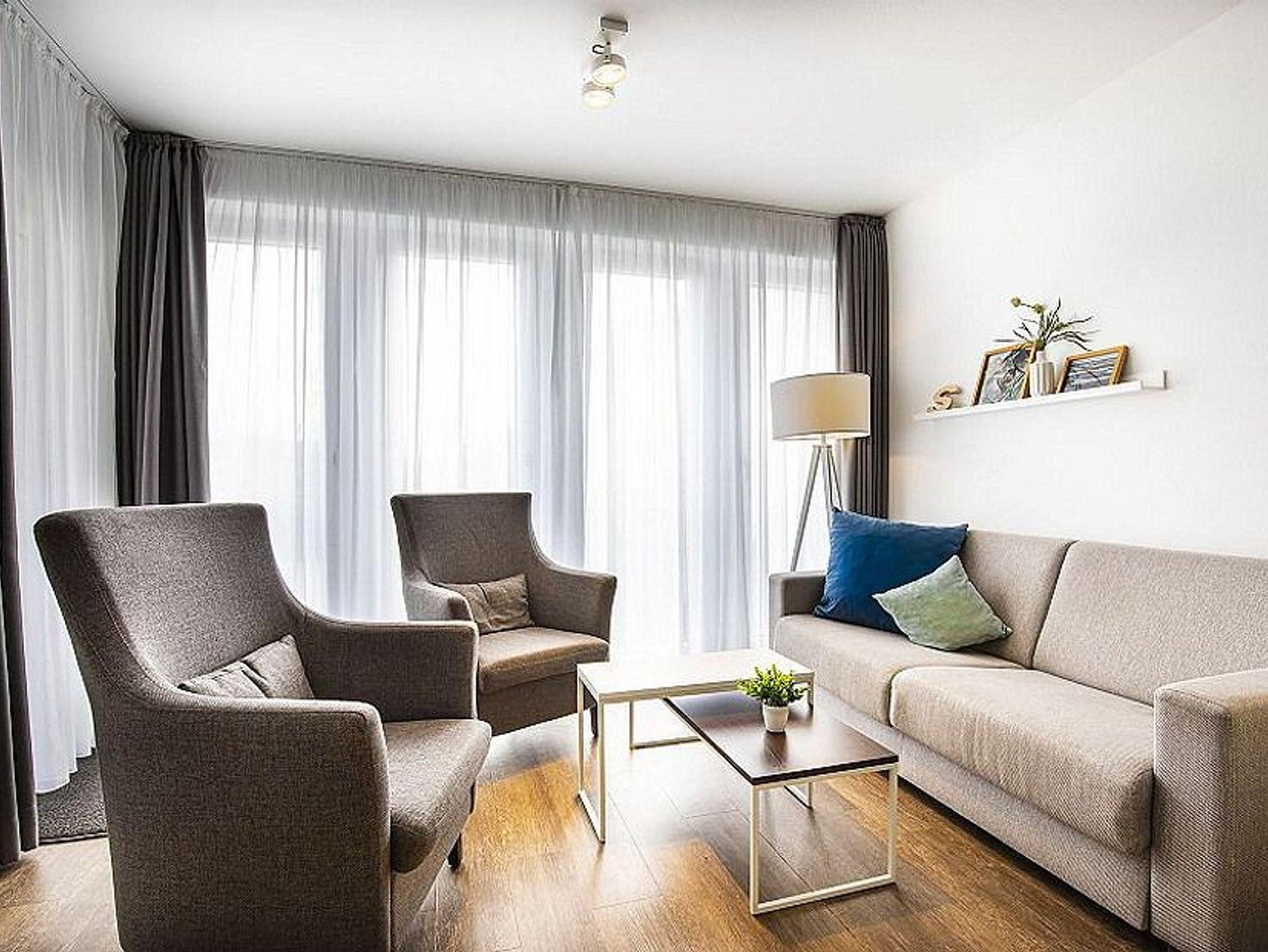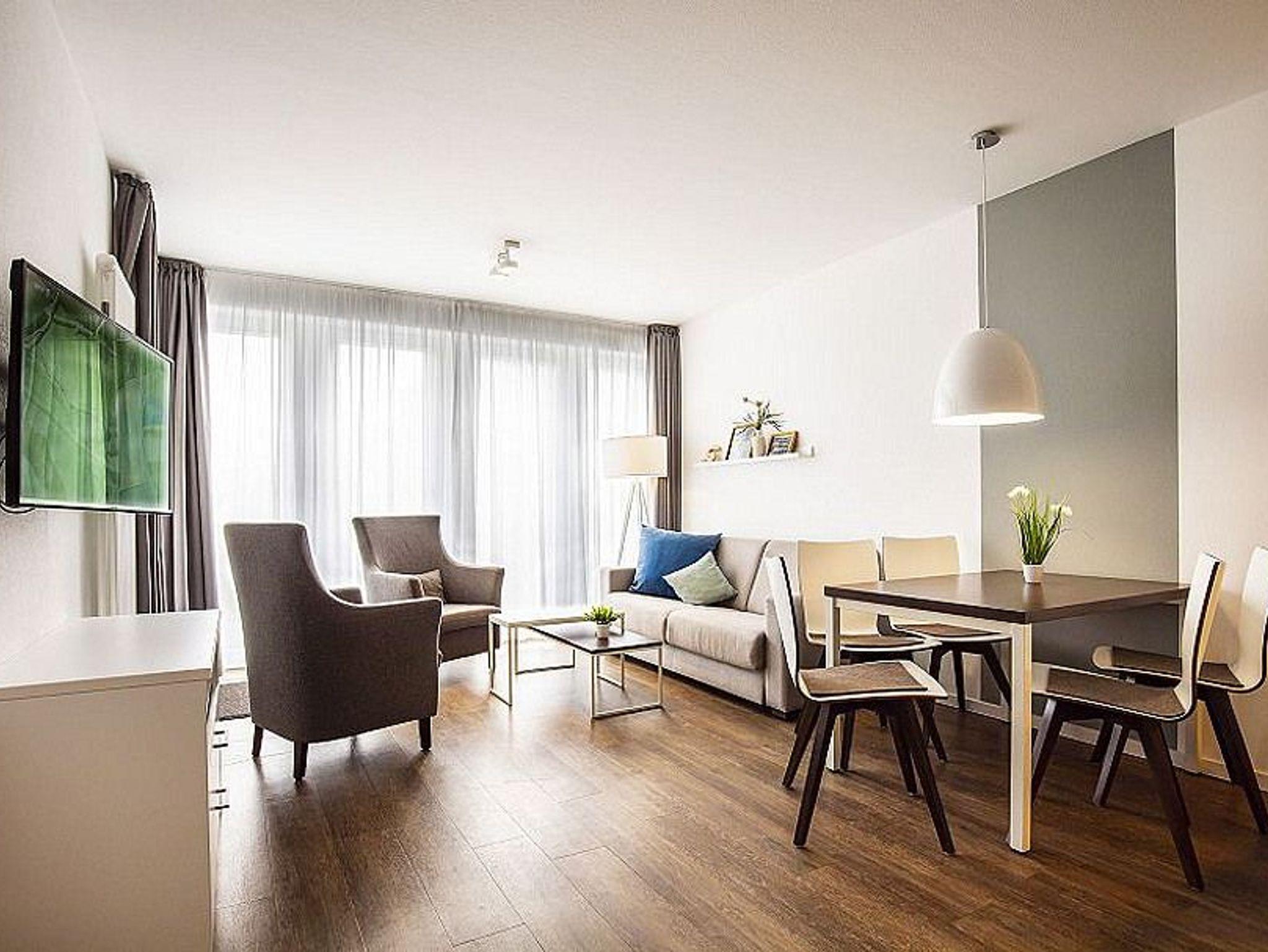 Die 61 m² große moderne 3-Zimmer Ferienwohnung ist für bis zu 5 Personen geeignet. Besonders hervorzuheben ist der überdachte Balkon in Süd-Lage. Hier lässt sich bereits beim Frühstück die Morgensonne genießen.