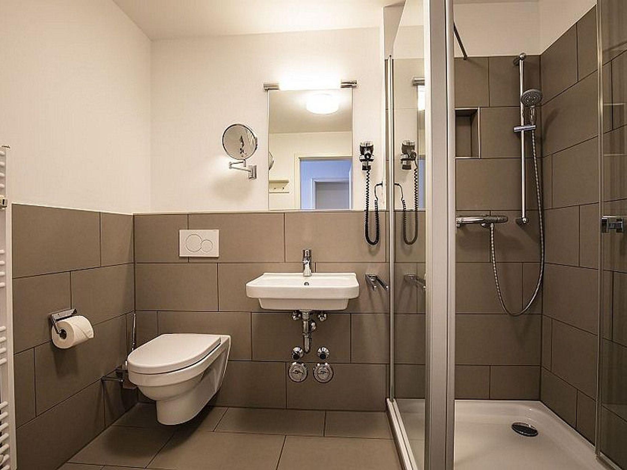 Badezimmer mit Dusche, Waschtisch und WC