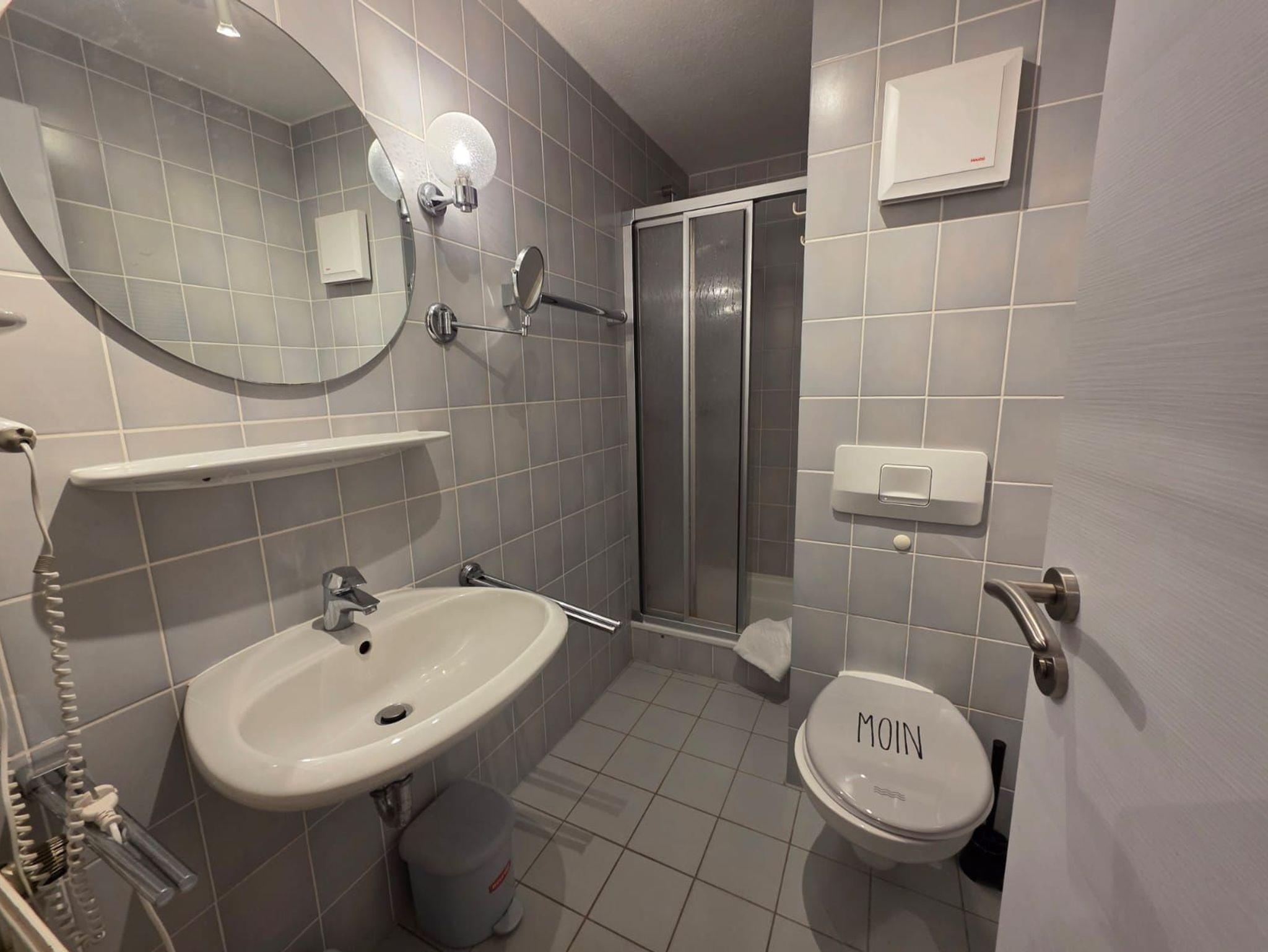 Badezimmer mit Dusche, Waschtisch und WC