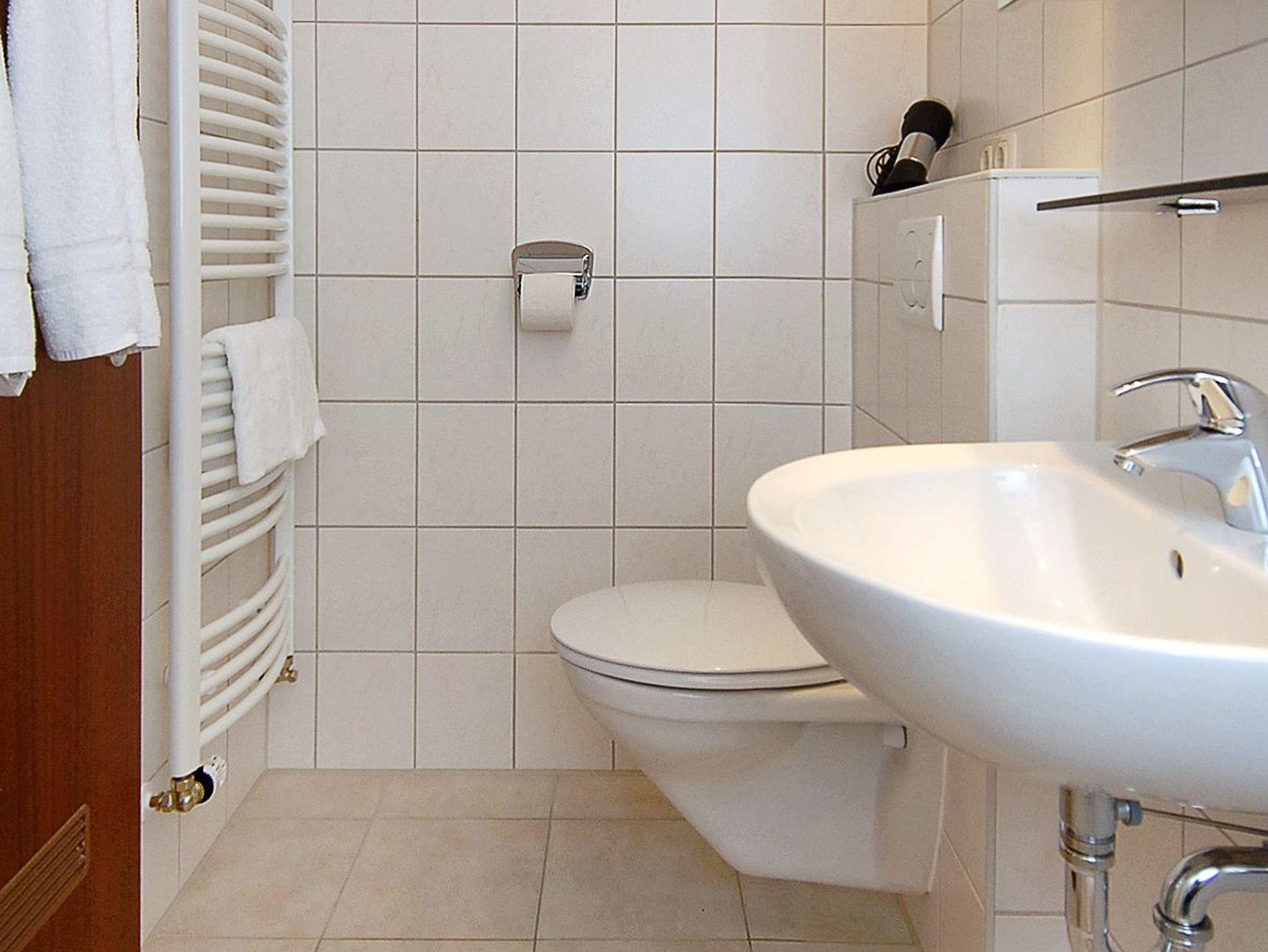 Badezimmer mit Dusche, Waschtisch und WC