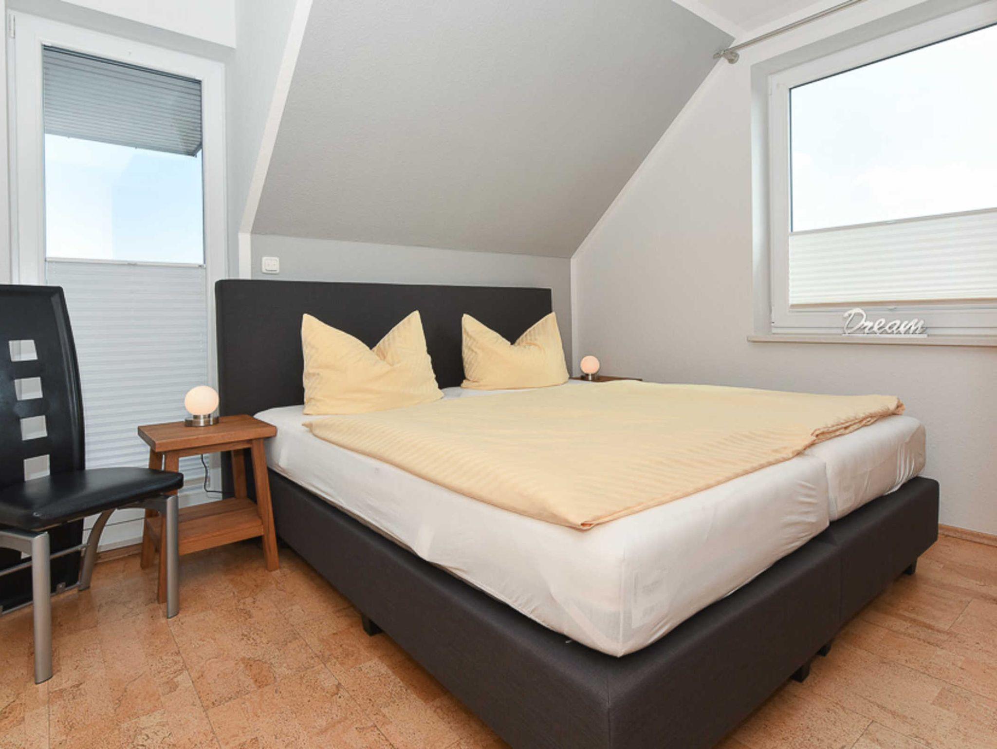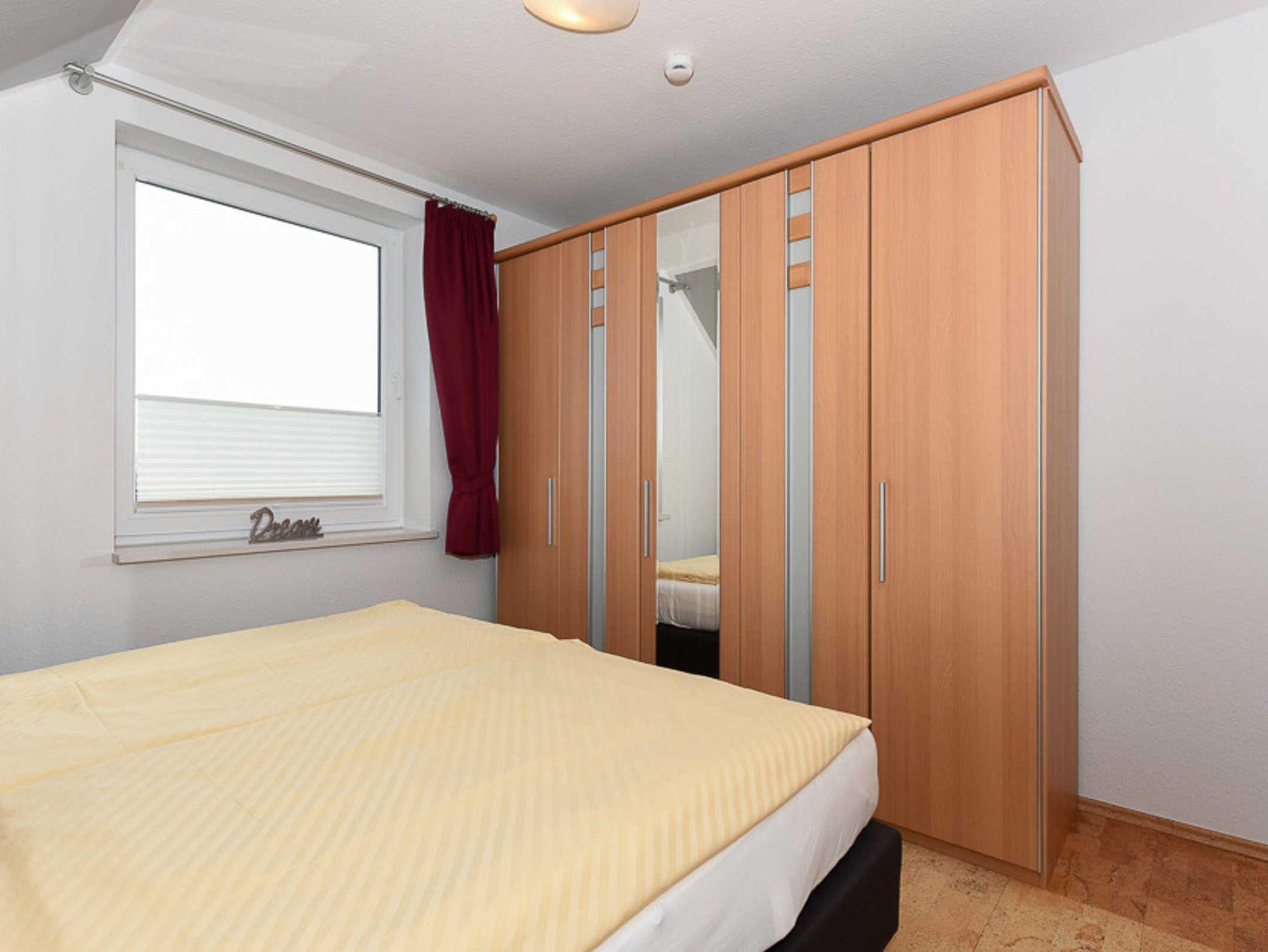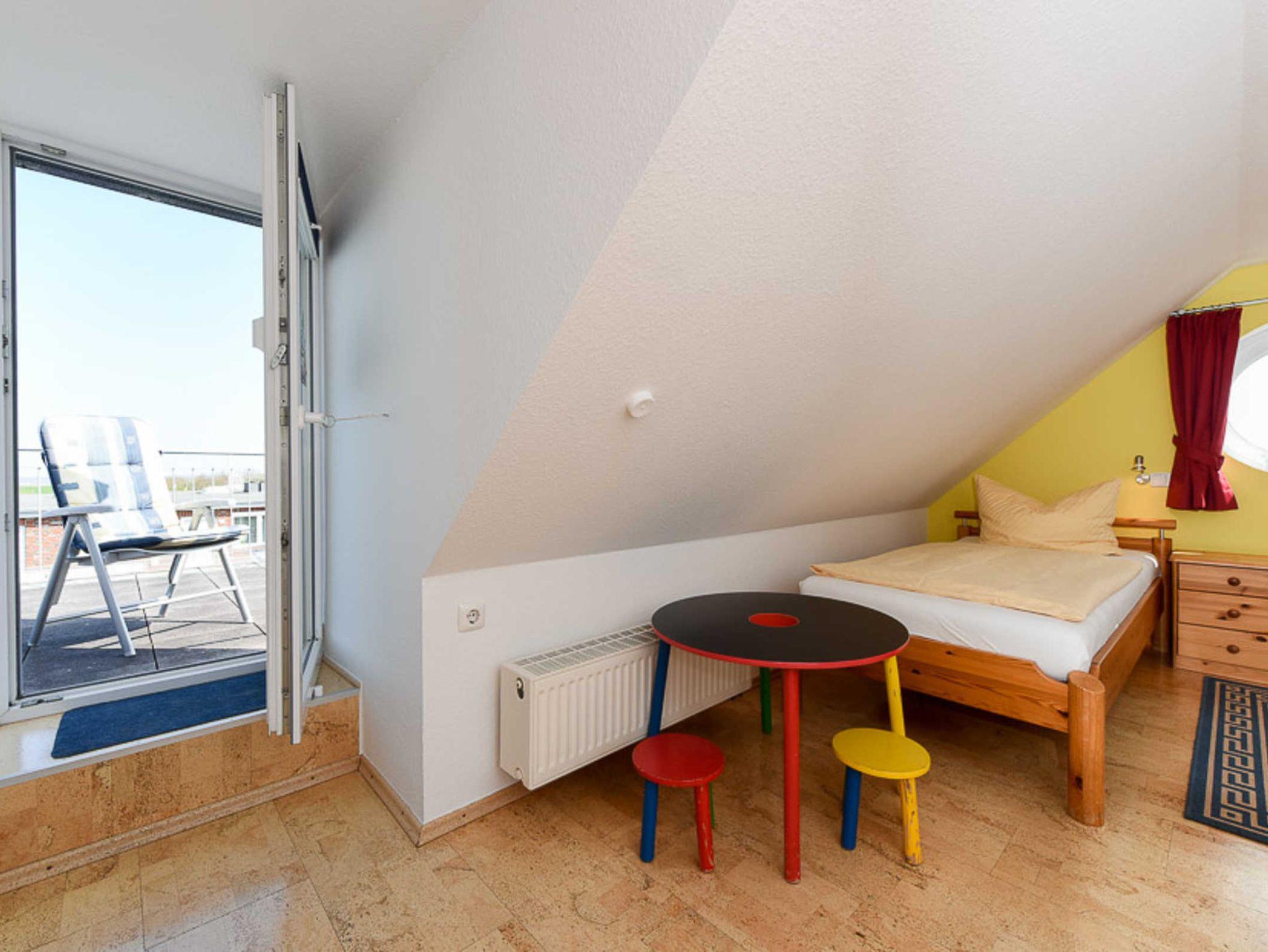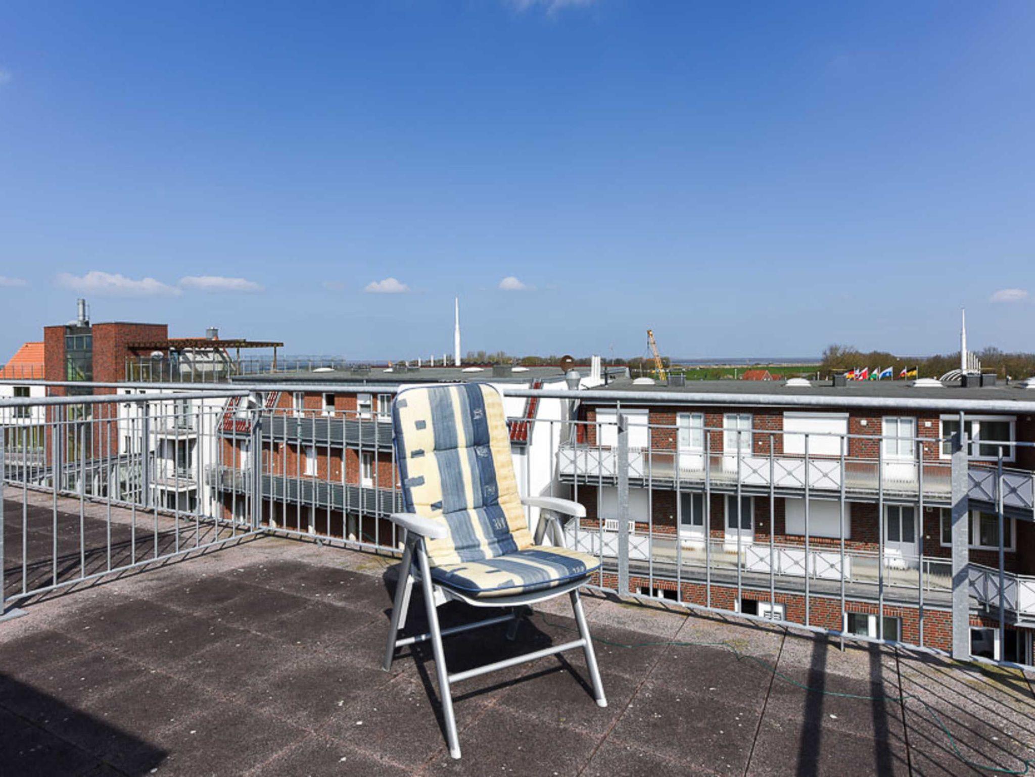 Das erste Schlafzimmer und der Balkon sind ohne Treppe erreichbar. Vom Balkon aus schauen Sie in Richtung Festland. Das zweite Schlafzimmer und die Dachterrasse sind über eine Treppe zu erreichen. Von der Dachterrasse aus haben Sie einen herrlichen Blick auf die Nordsee, den Hafen und die ostfriesischen Inseln.