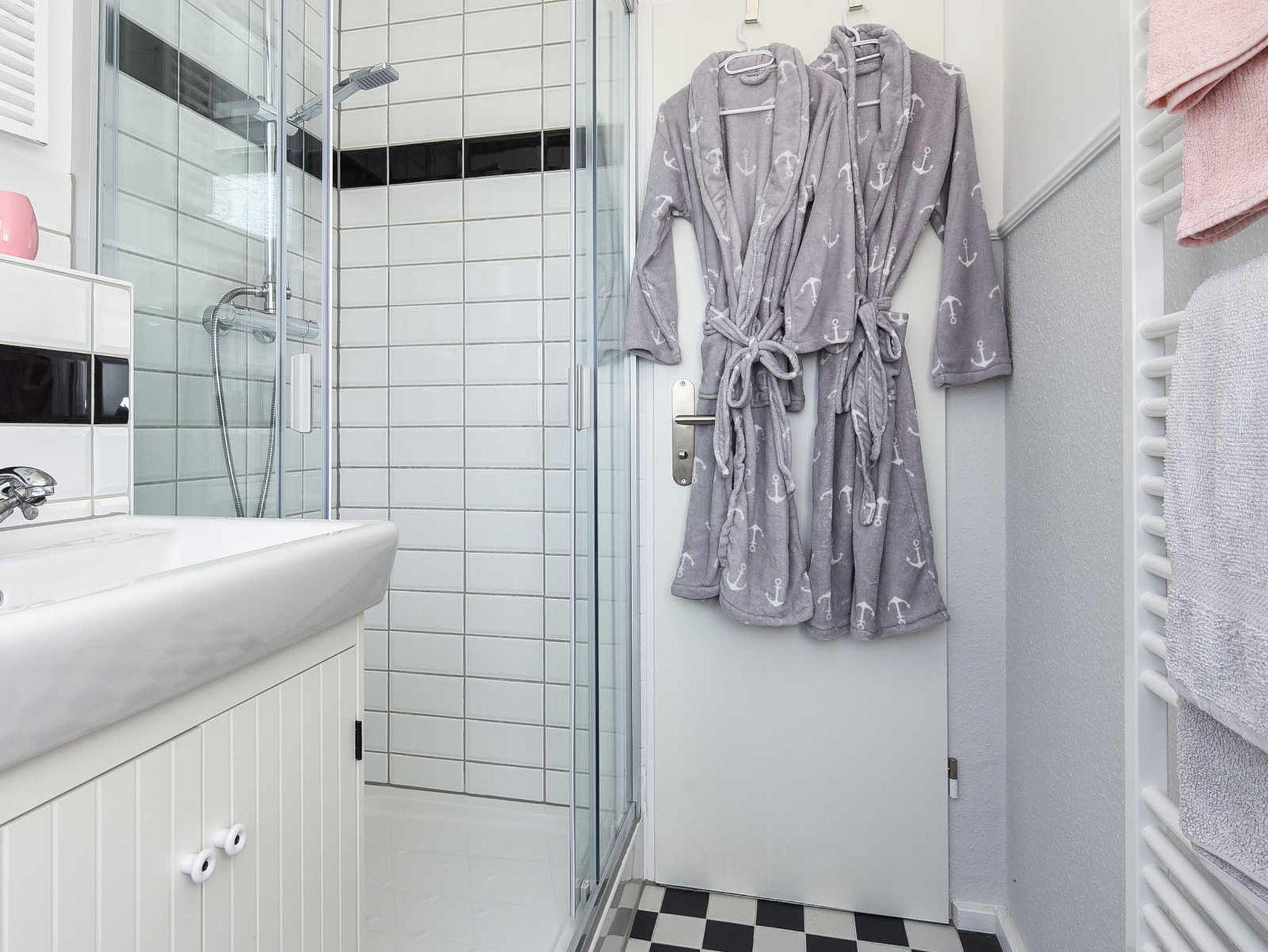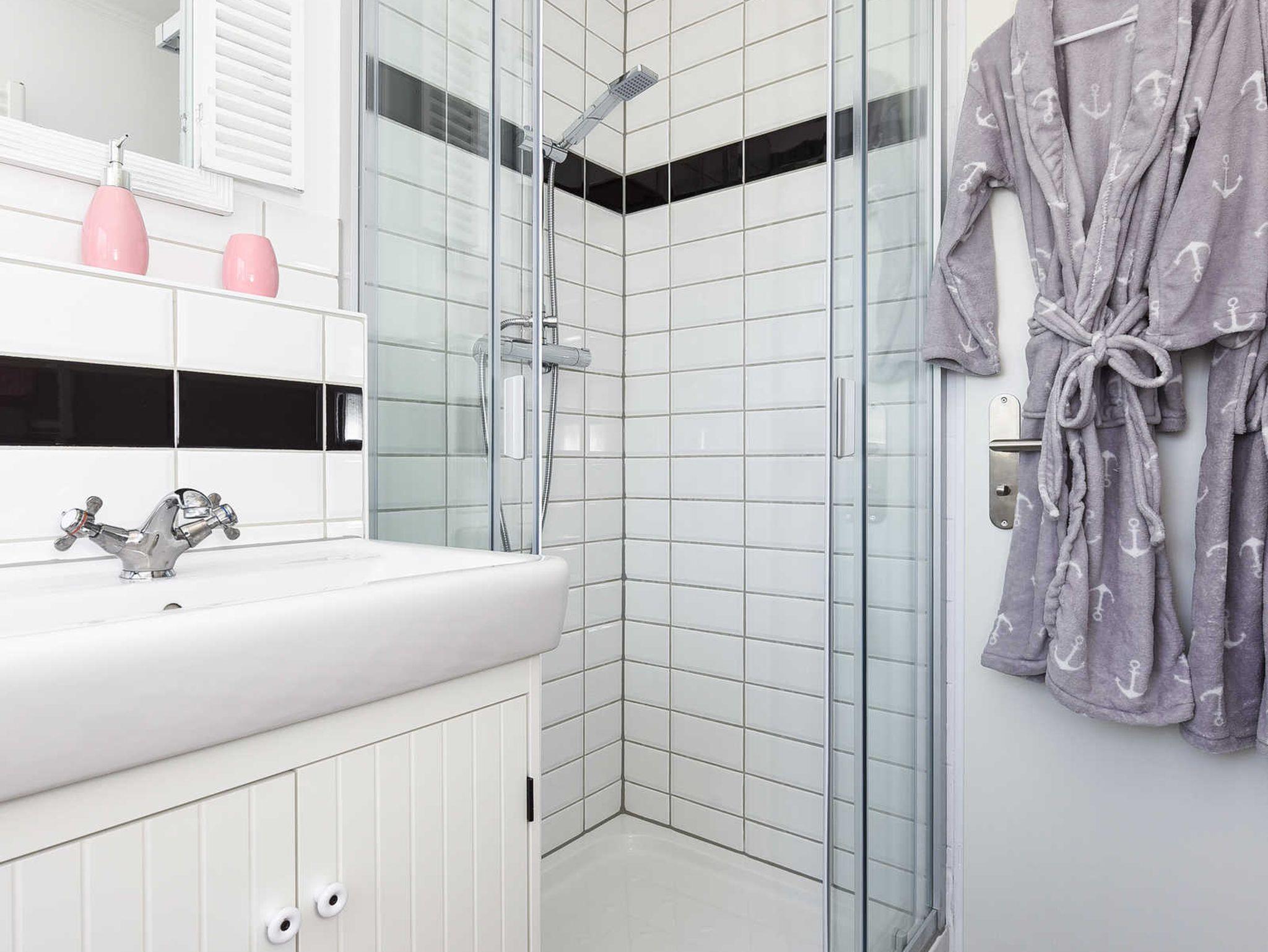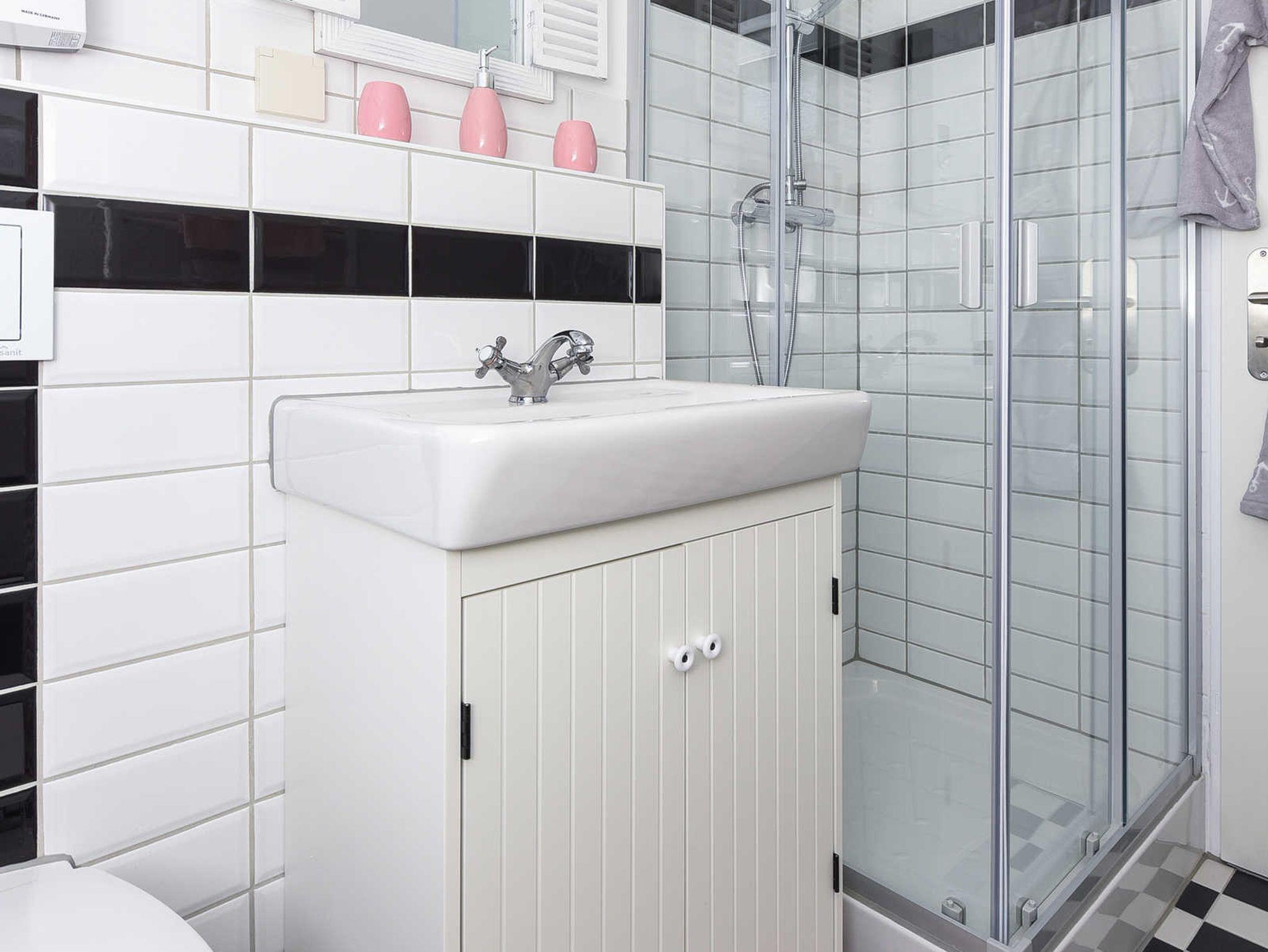 Badezimmer mit Dusche, Waschtisch und WC