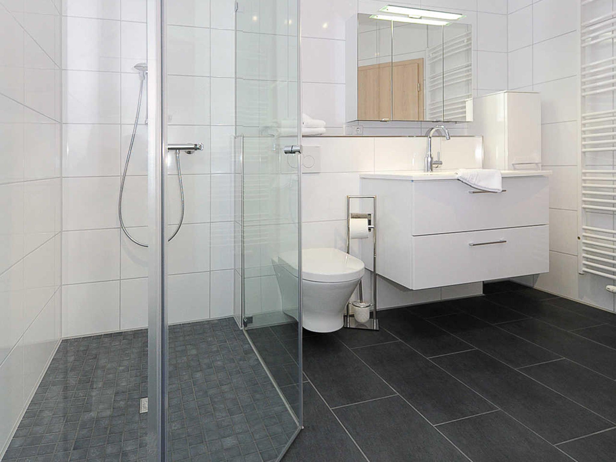 Badezimmer mit Dusche, Waschtisch und WC