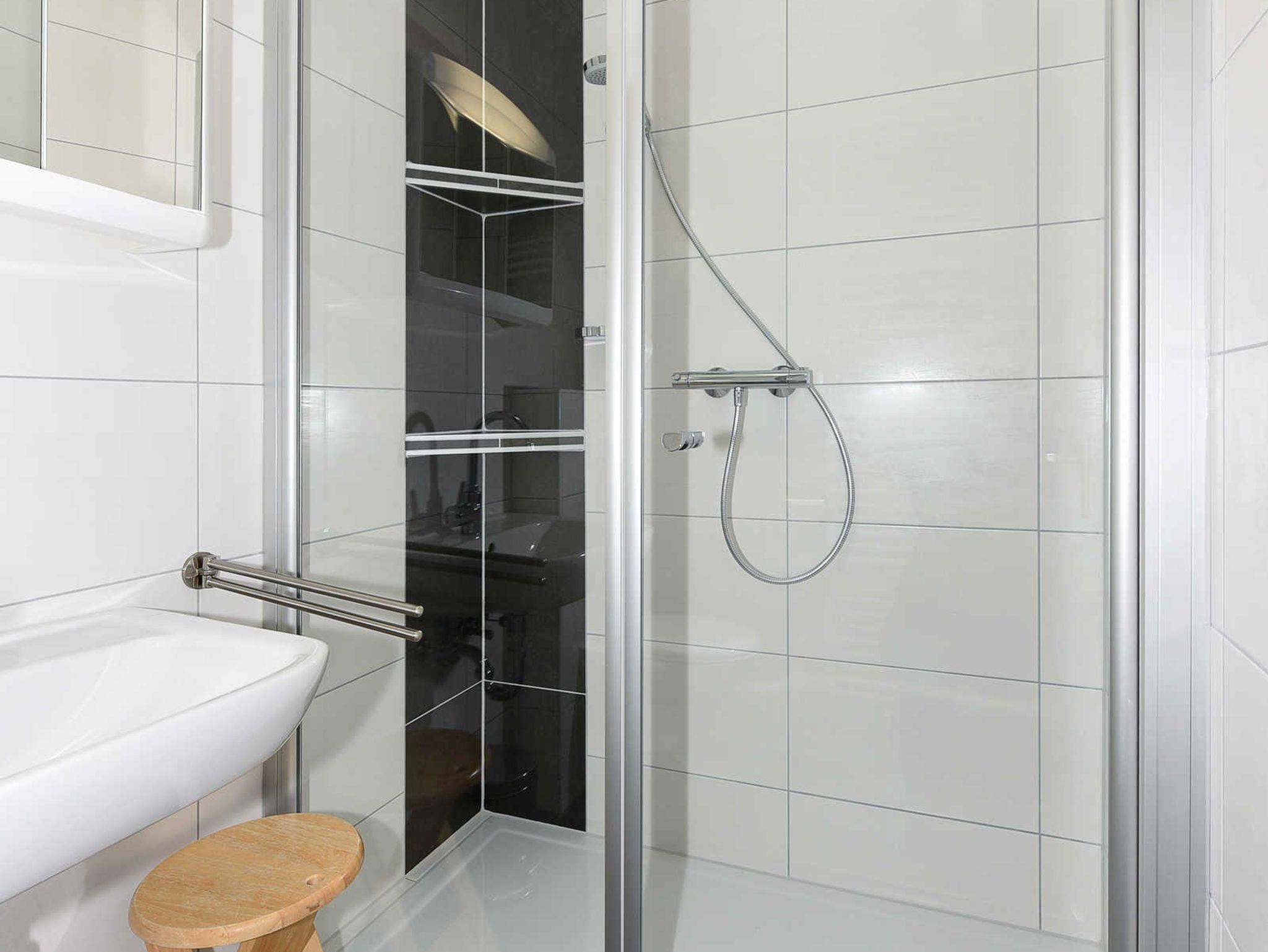 Badezimmer mit Dusche, Waschtisch und WC