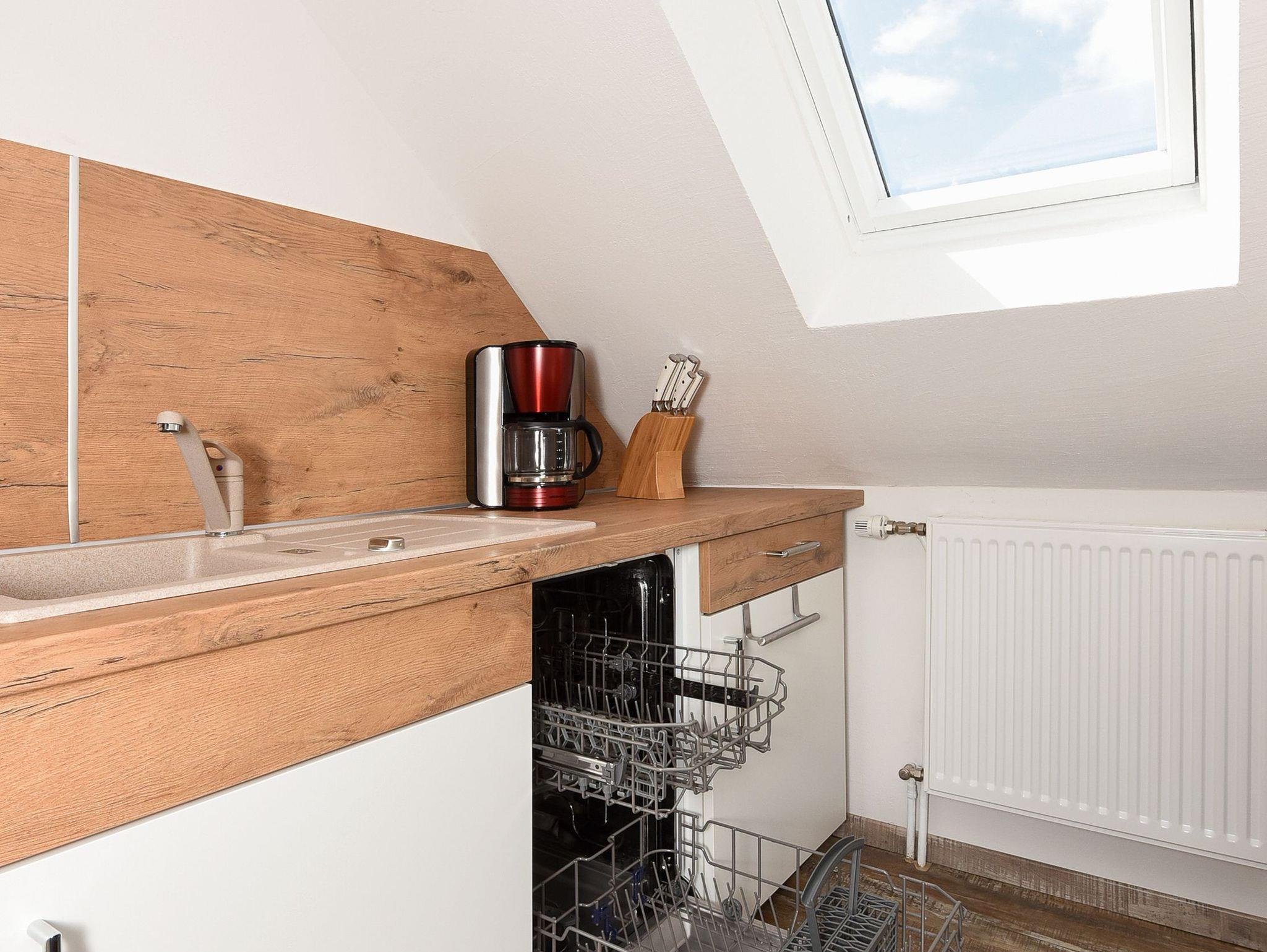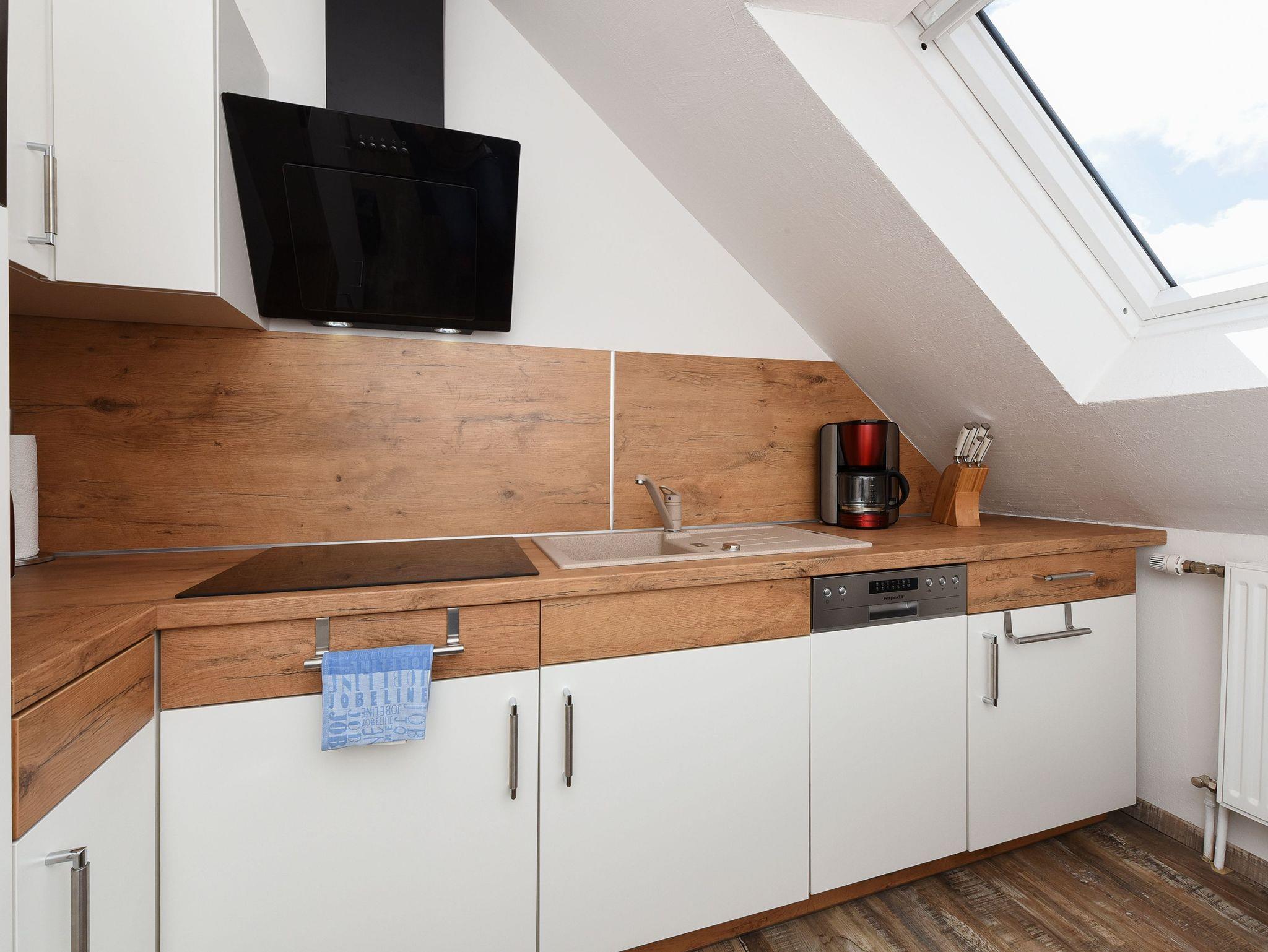 Wohnzimmer mit Schlafmöglichkeit, Küche, Schlafzimmer, Badezimmer mit Dusche, Waschtisch und WC, Obergeschoss, optimal für 2 bis 4 Personen und zusätzlich ein Kleinkind.
