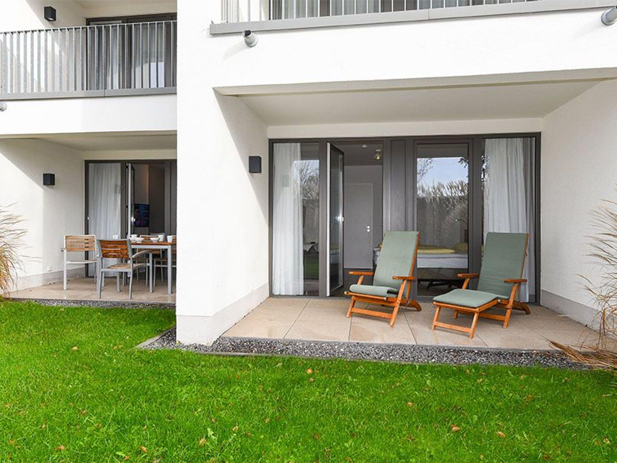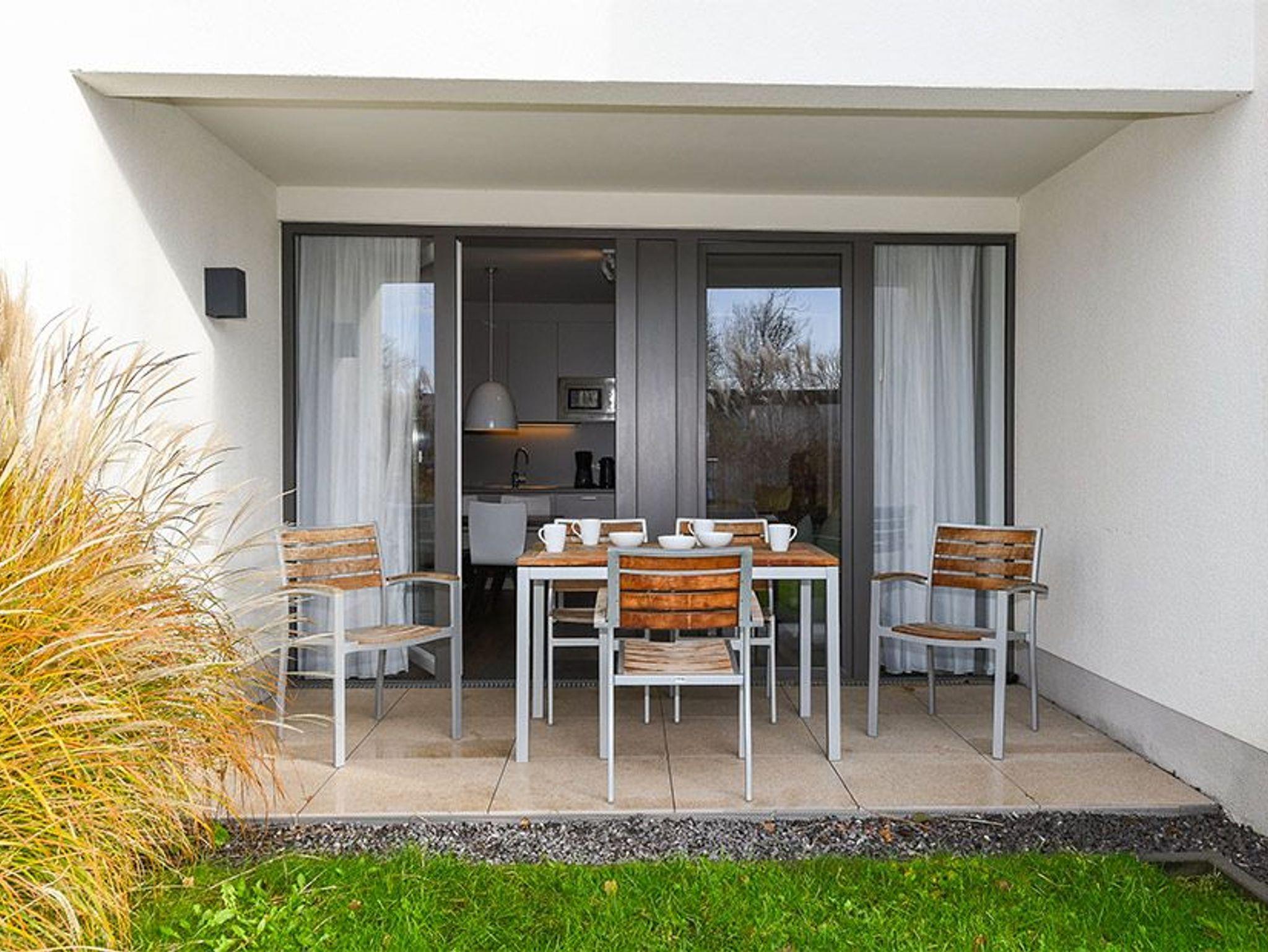 Die 61 m² große moderne 3-Zimmer Ferienwohnung ist für bis zu 5 Personen geeignet. Besonders hervorzuheben sind die zwei großzügigen und überdachten Terrassen in sonniger West-Lage mit eigener Grünfläche. Hier lässt sich den ganzen Tag das wohltuende Meeresklima des Nordseeheilbades genießen.