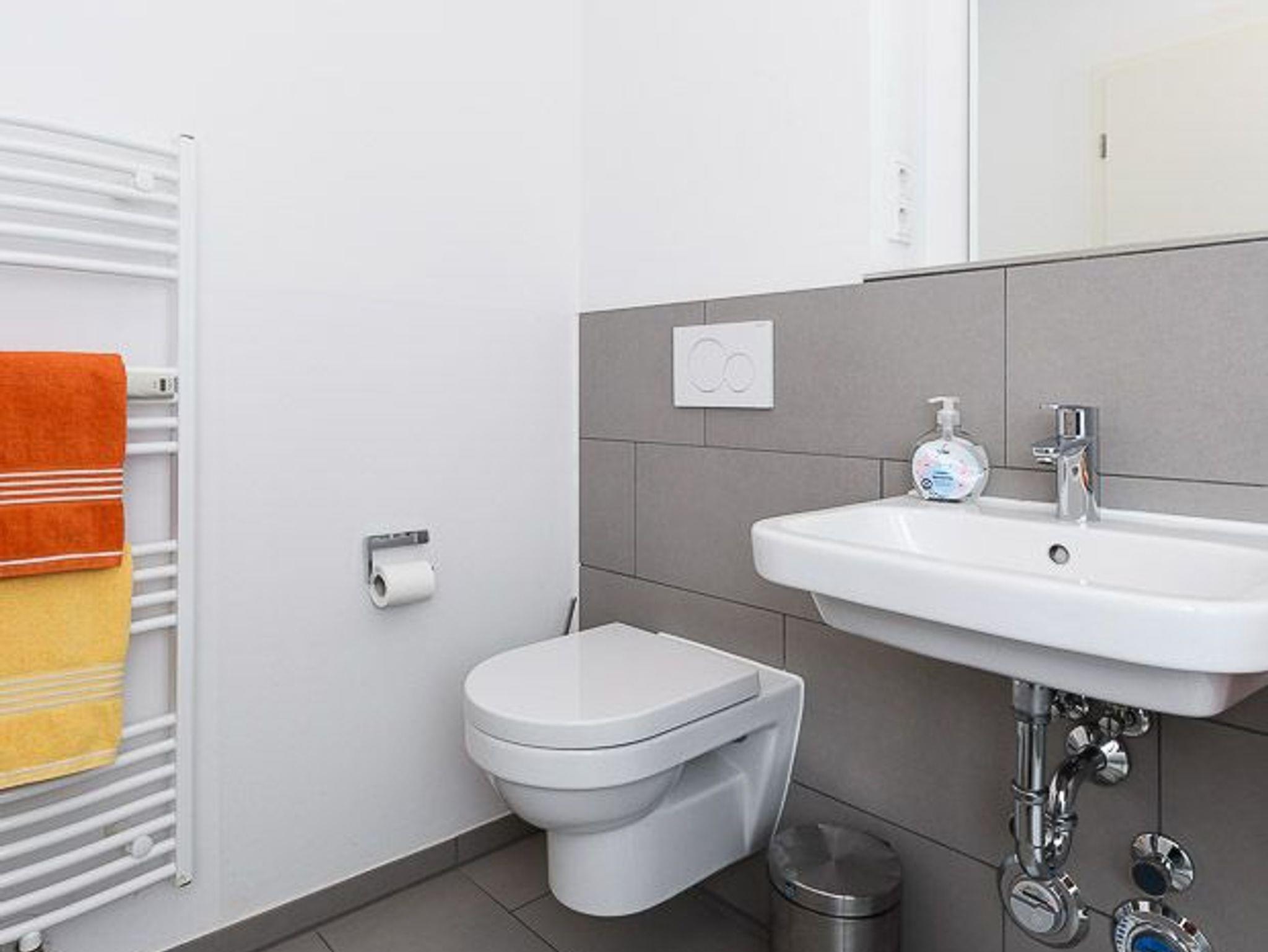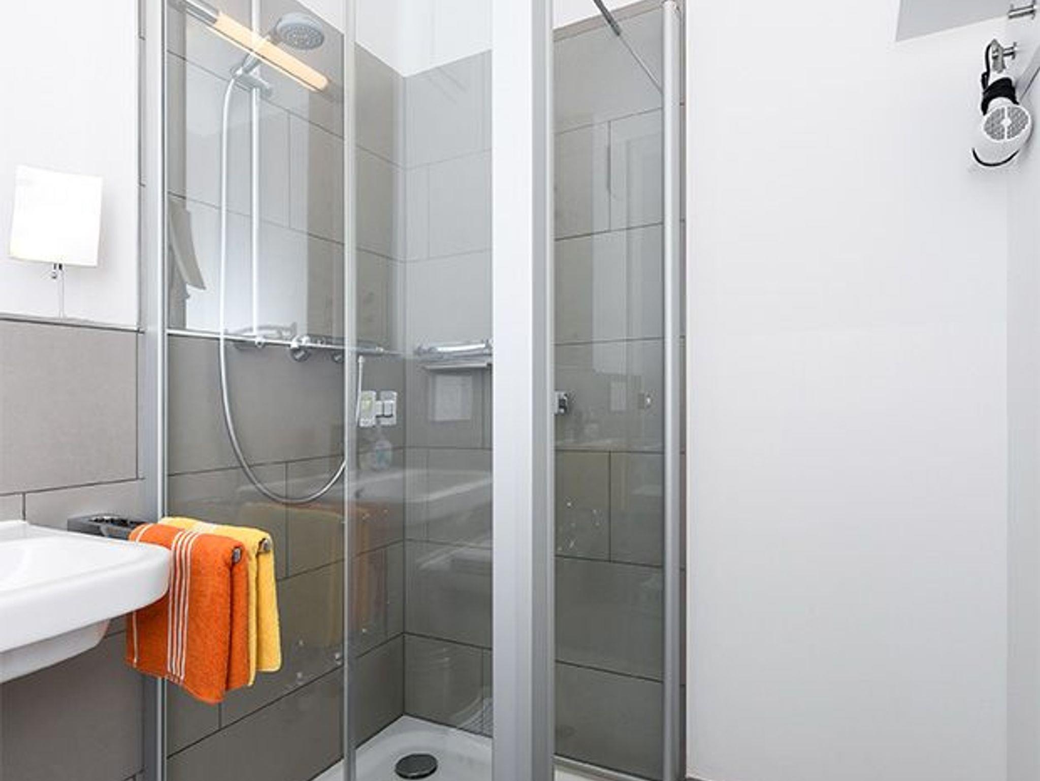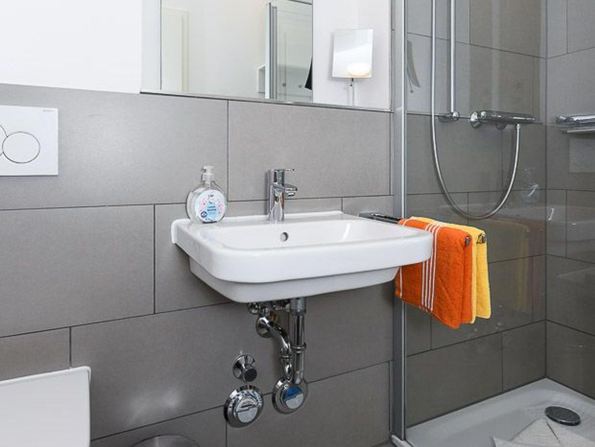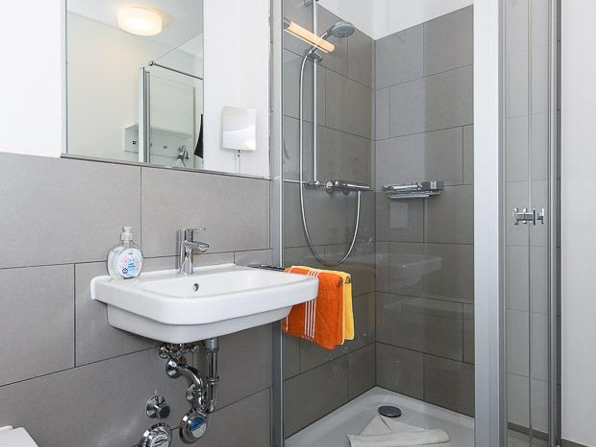 Badezimmer mit Dusche, Waschtisch und WC