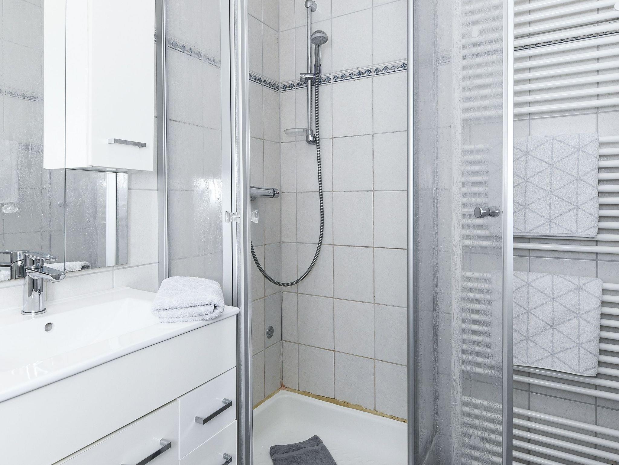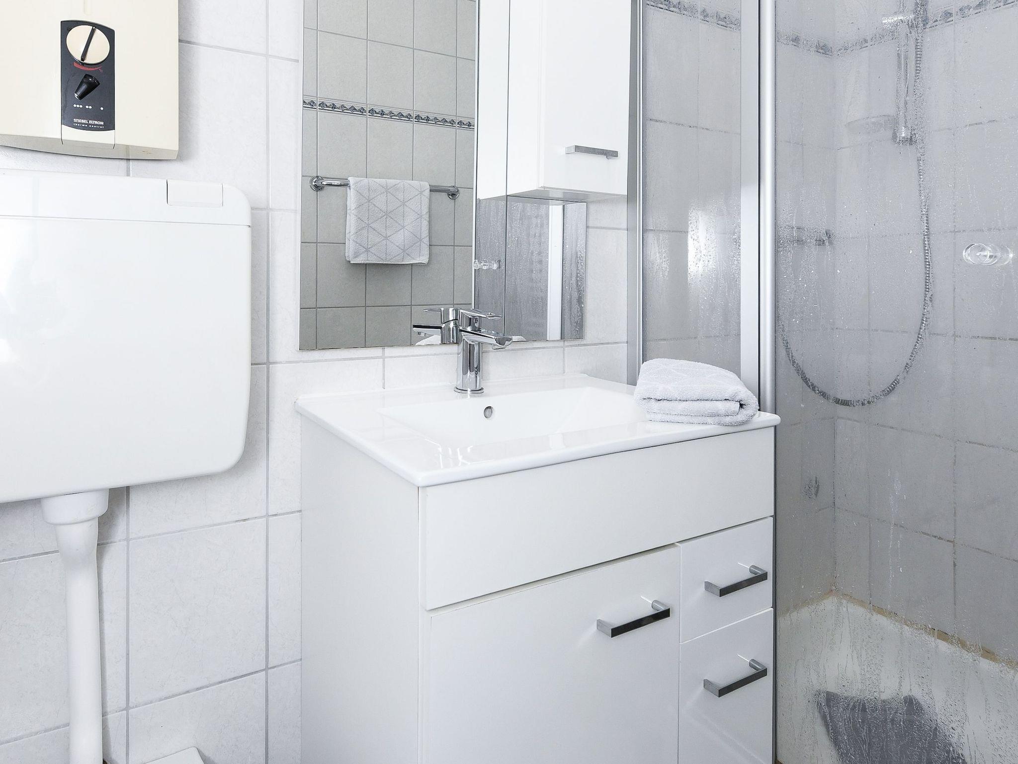 Badezimmer mit Dusche, Waschtisch und WC