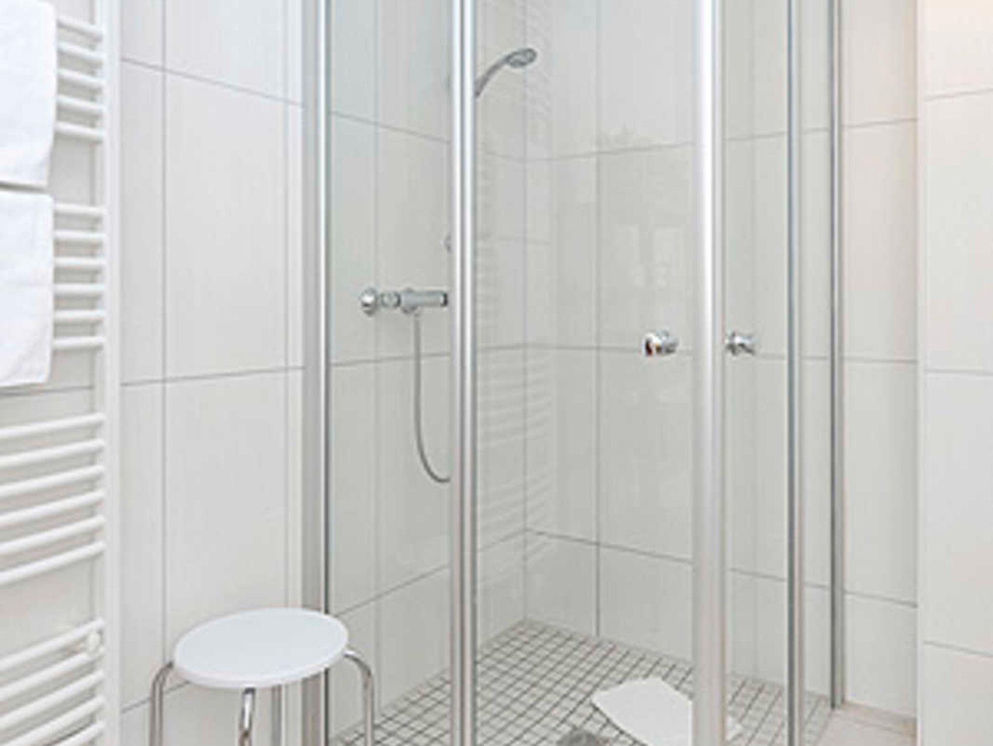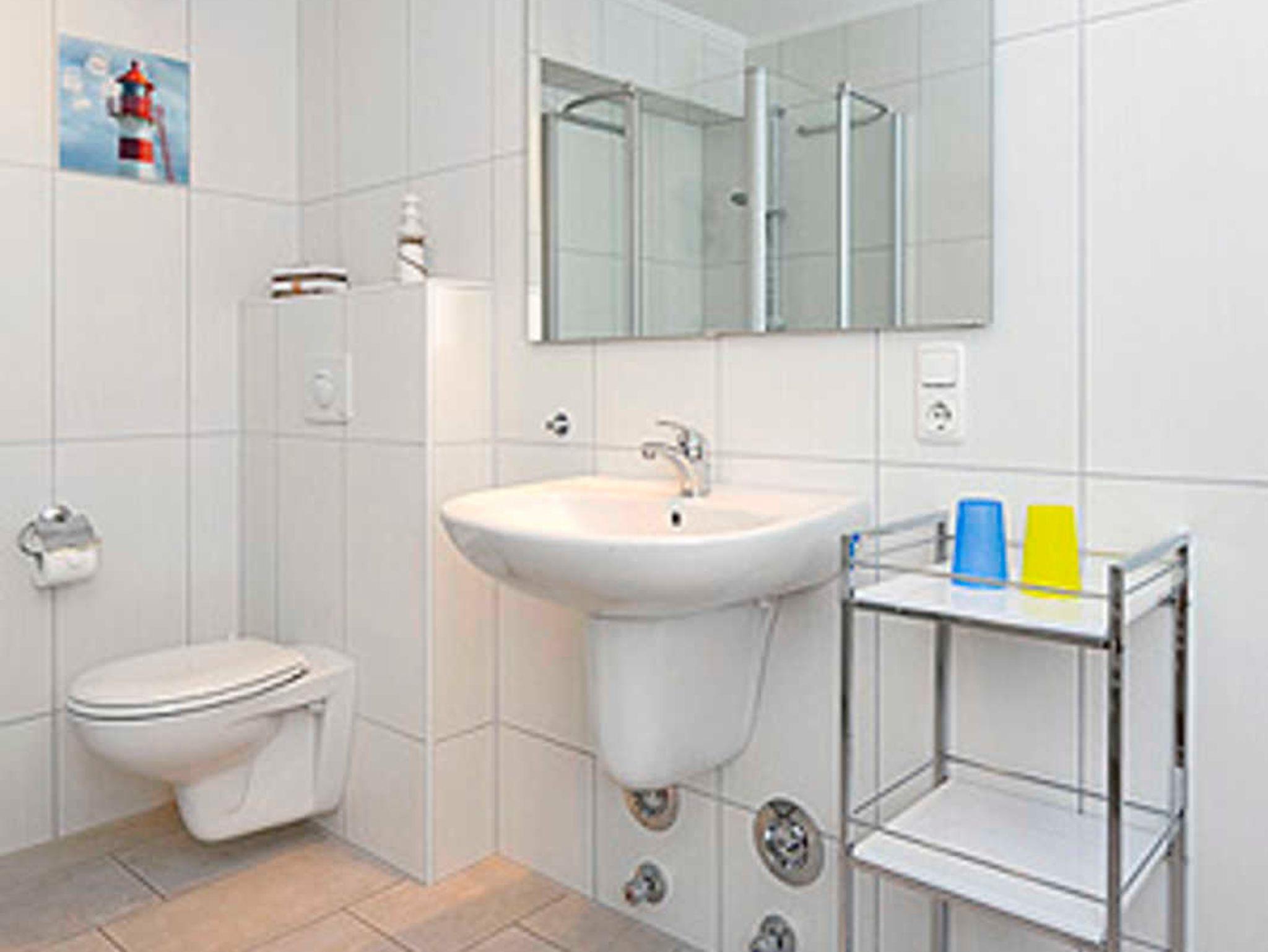Badezimmer mit Dusche, Waschtisch und WC