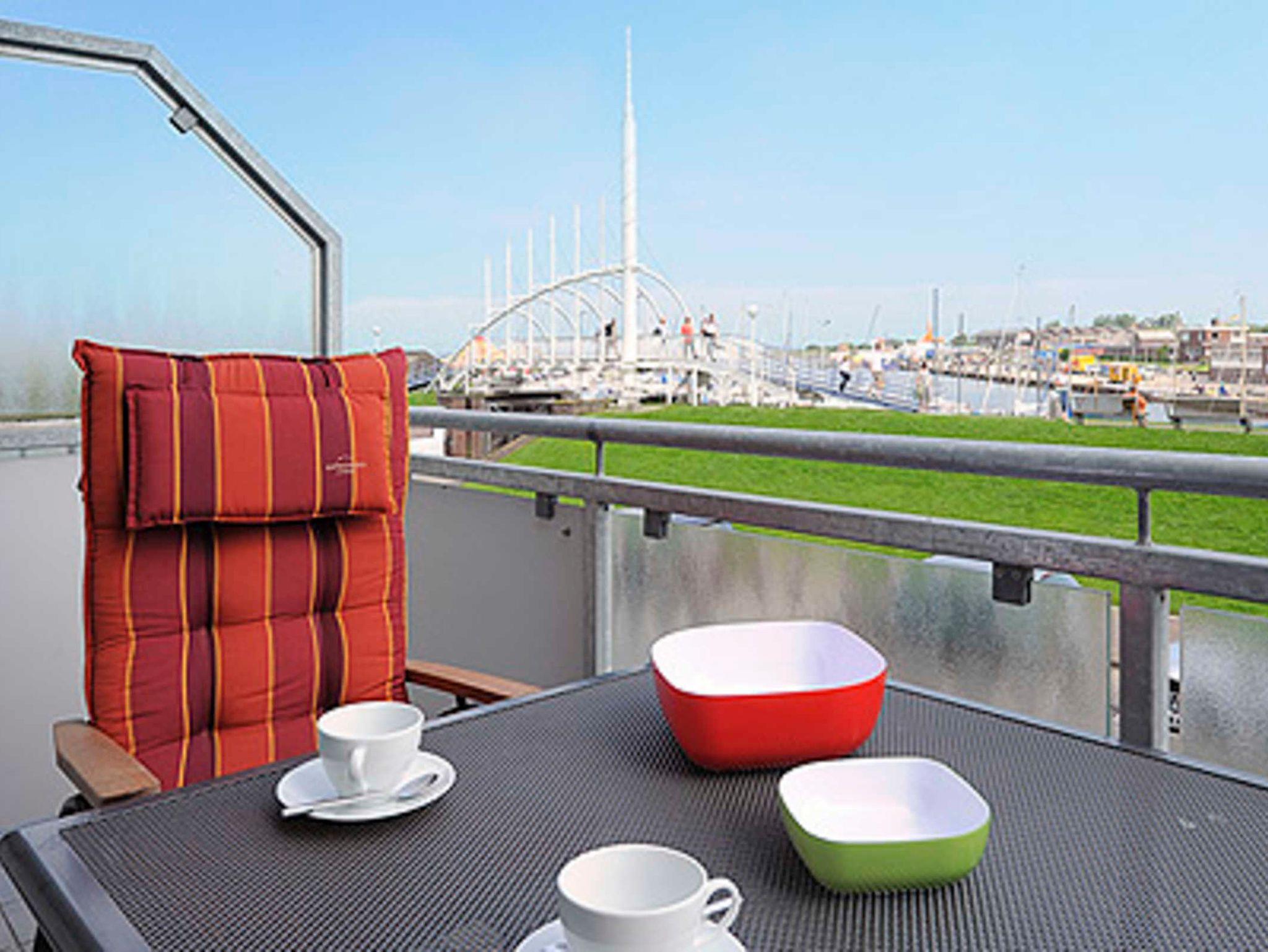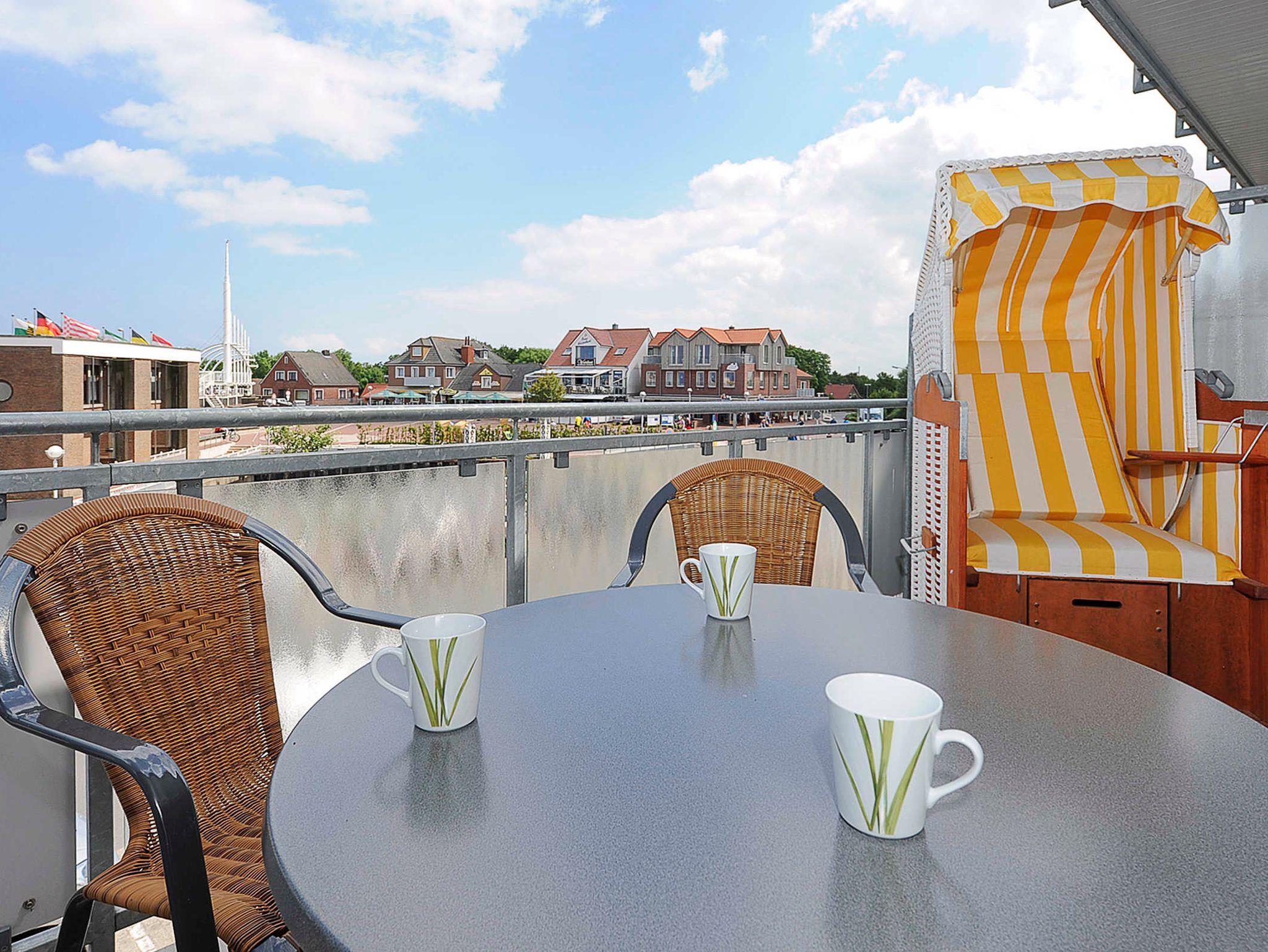Vom Balkon aus haben Sie einen herrlichen Blick über den Deich hinweg auf den Bensersieler Hafen, auf die Nordsee und auf mehrere Ostfriesischen Inseln! Ihre Ferienwohnung ist von der Tiefgarage und allen anderen Eingängen des Hauses aus mit Fahrstühlen und völlig ohne Treppen erreichbar.