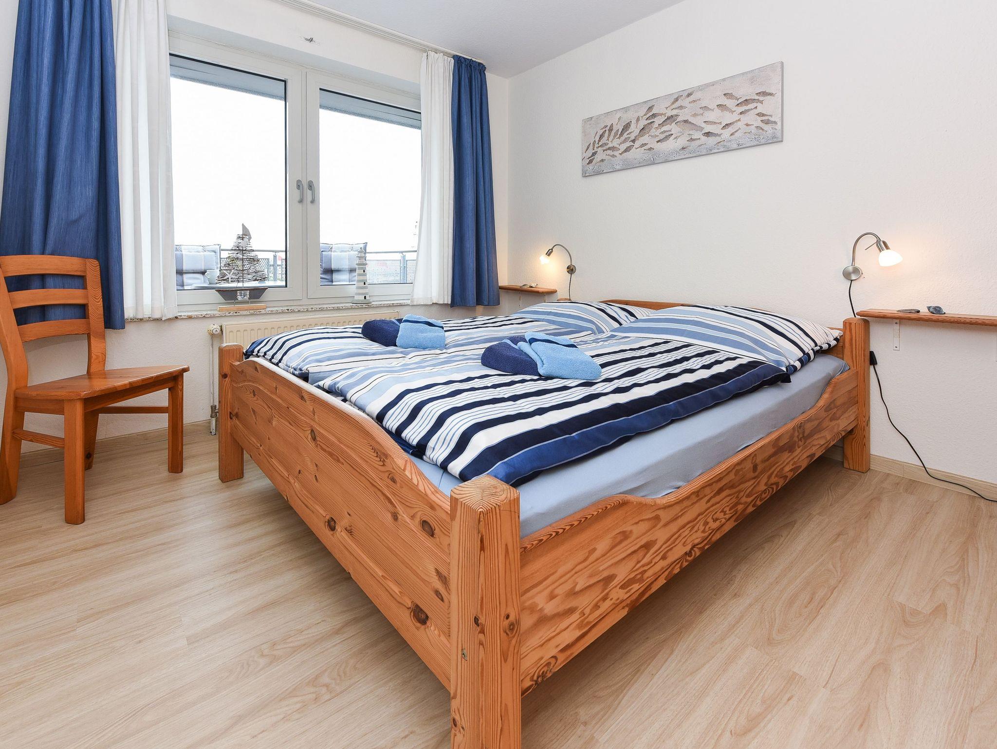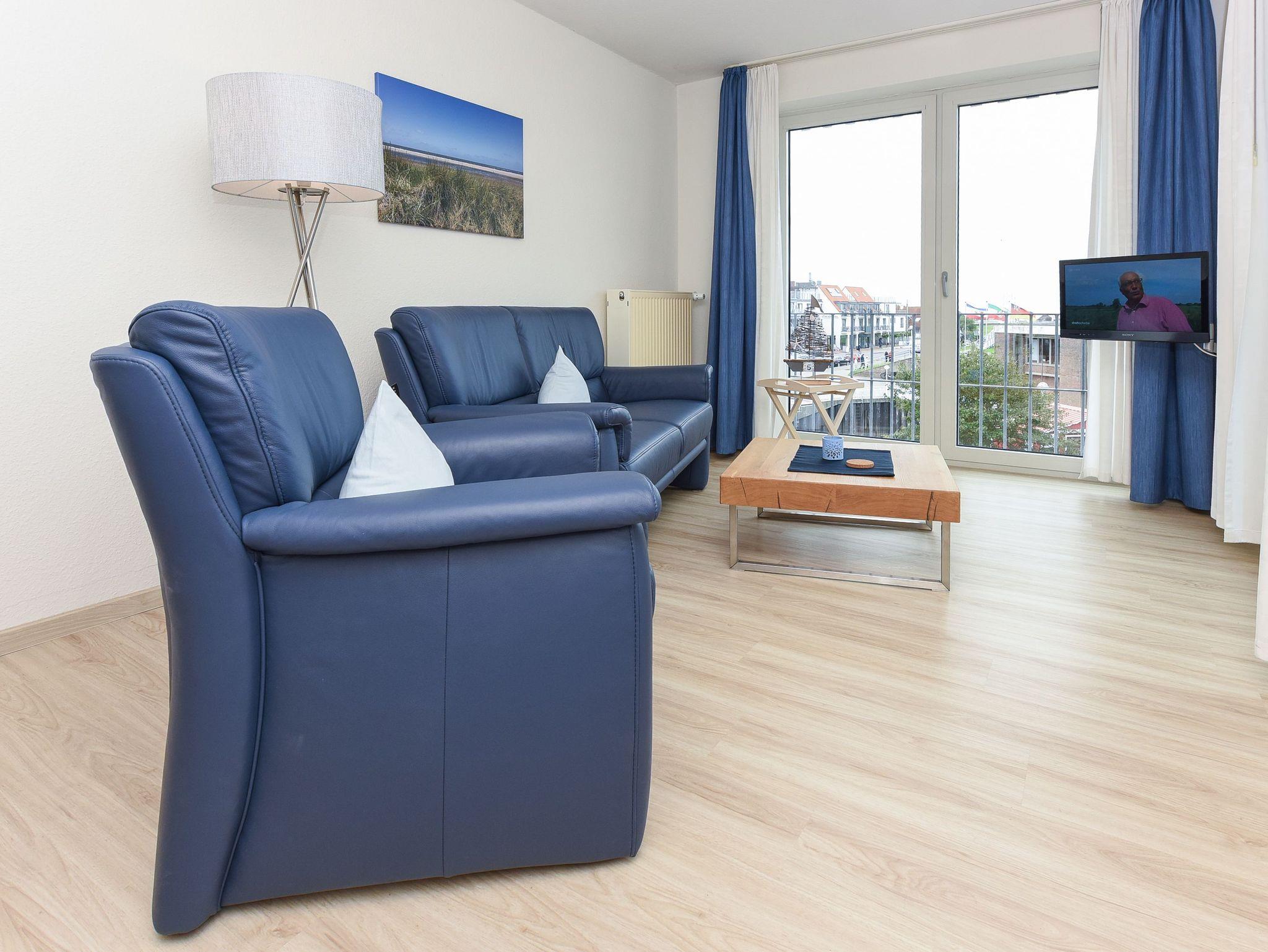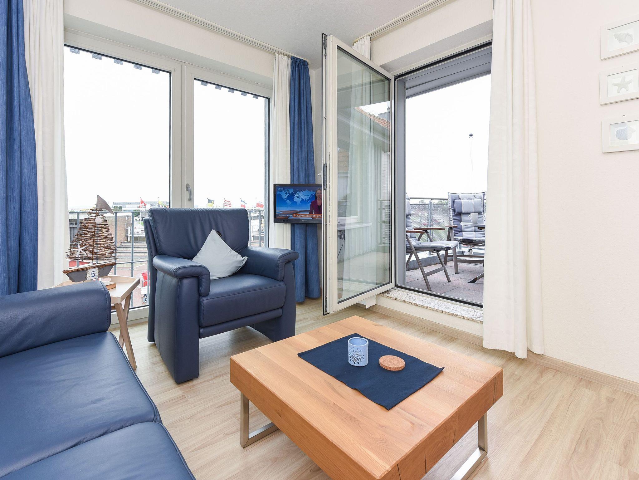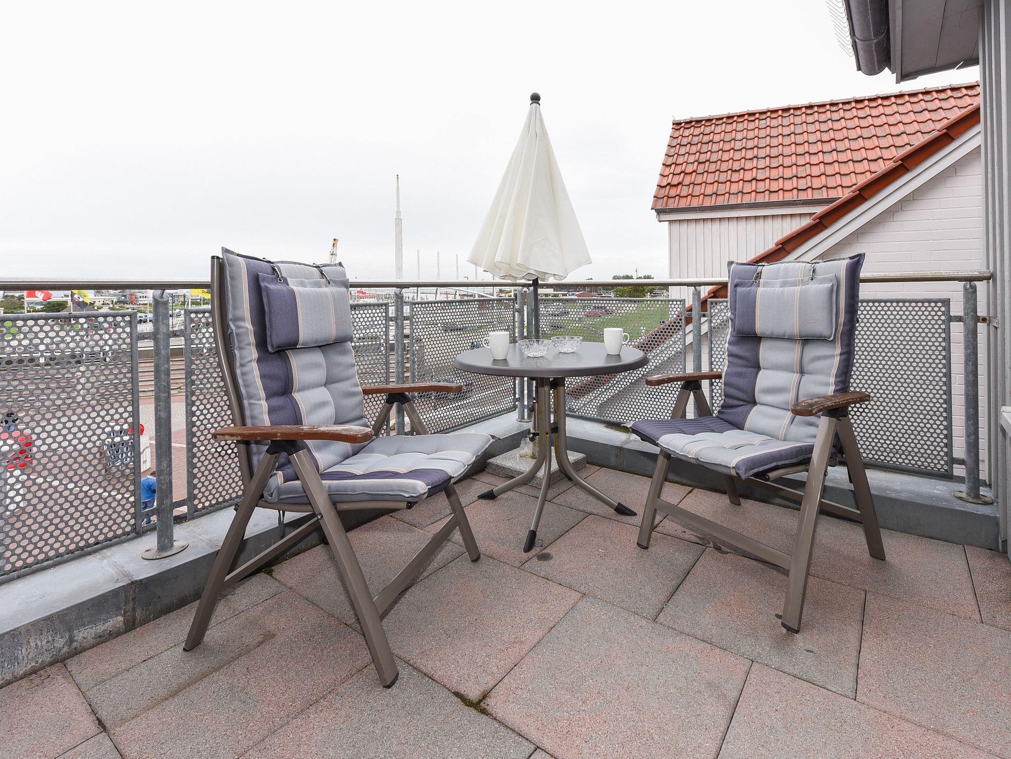 Die Wohnung „Luv“ verfügt über einen Balkon Richtung Westen mit Blick auf den Hafen und die Nordsee.