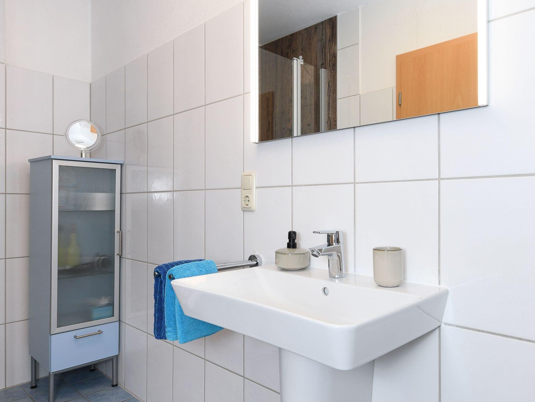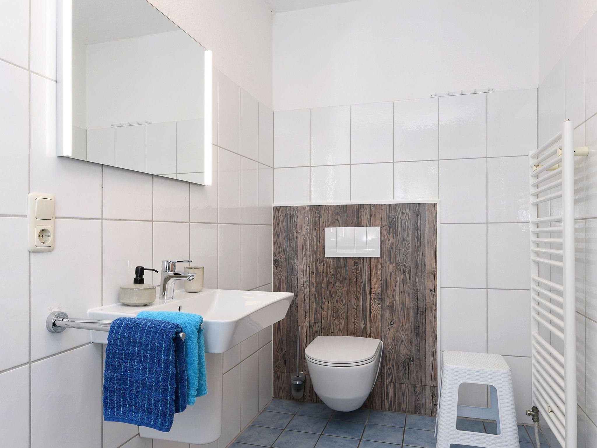 Badezimmer mit Dusche, Waschtisch und WC