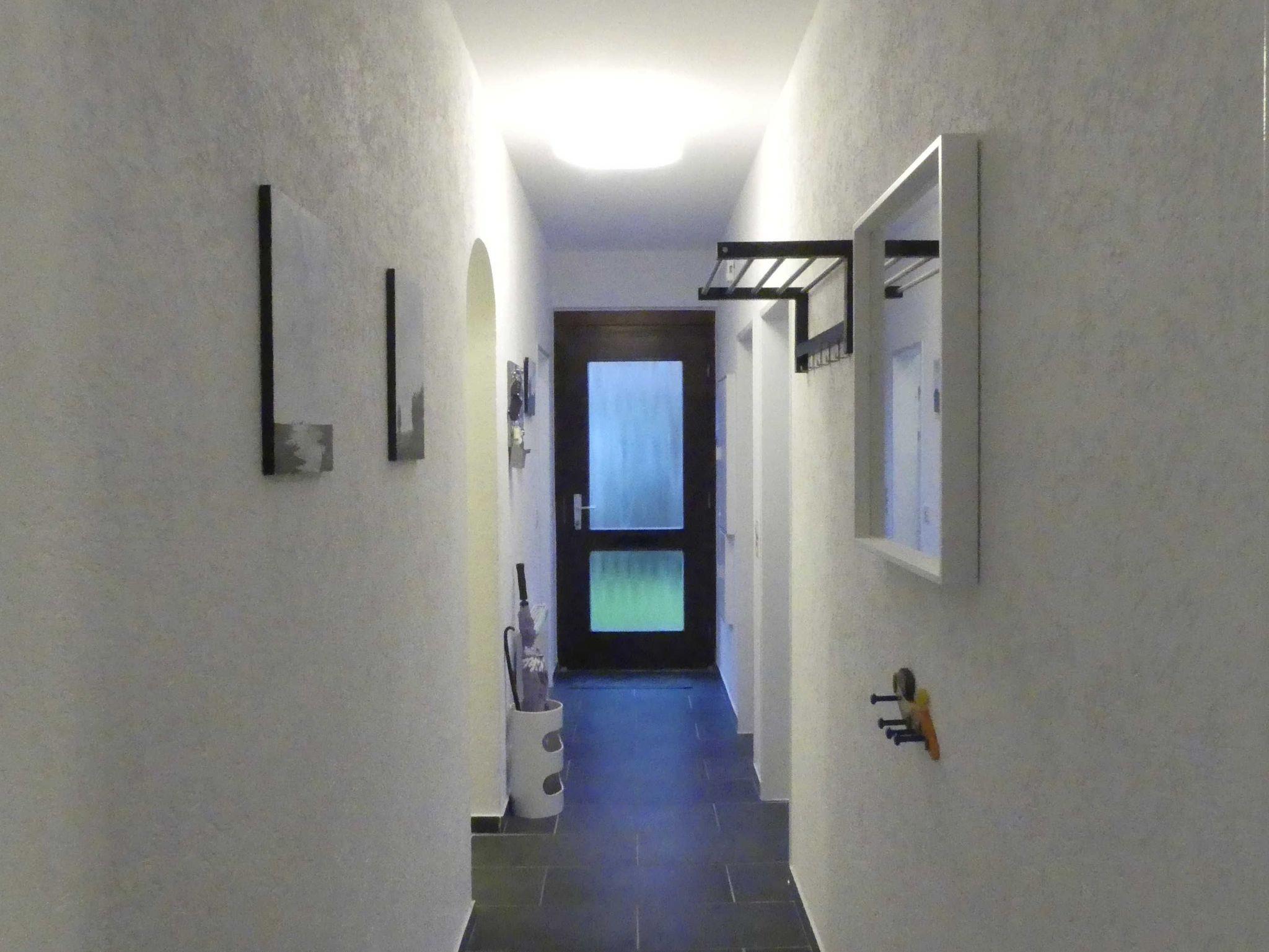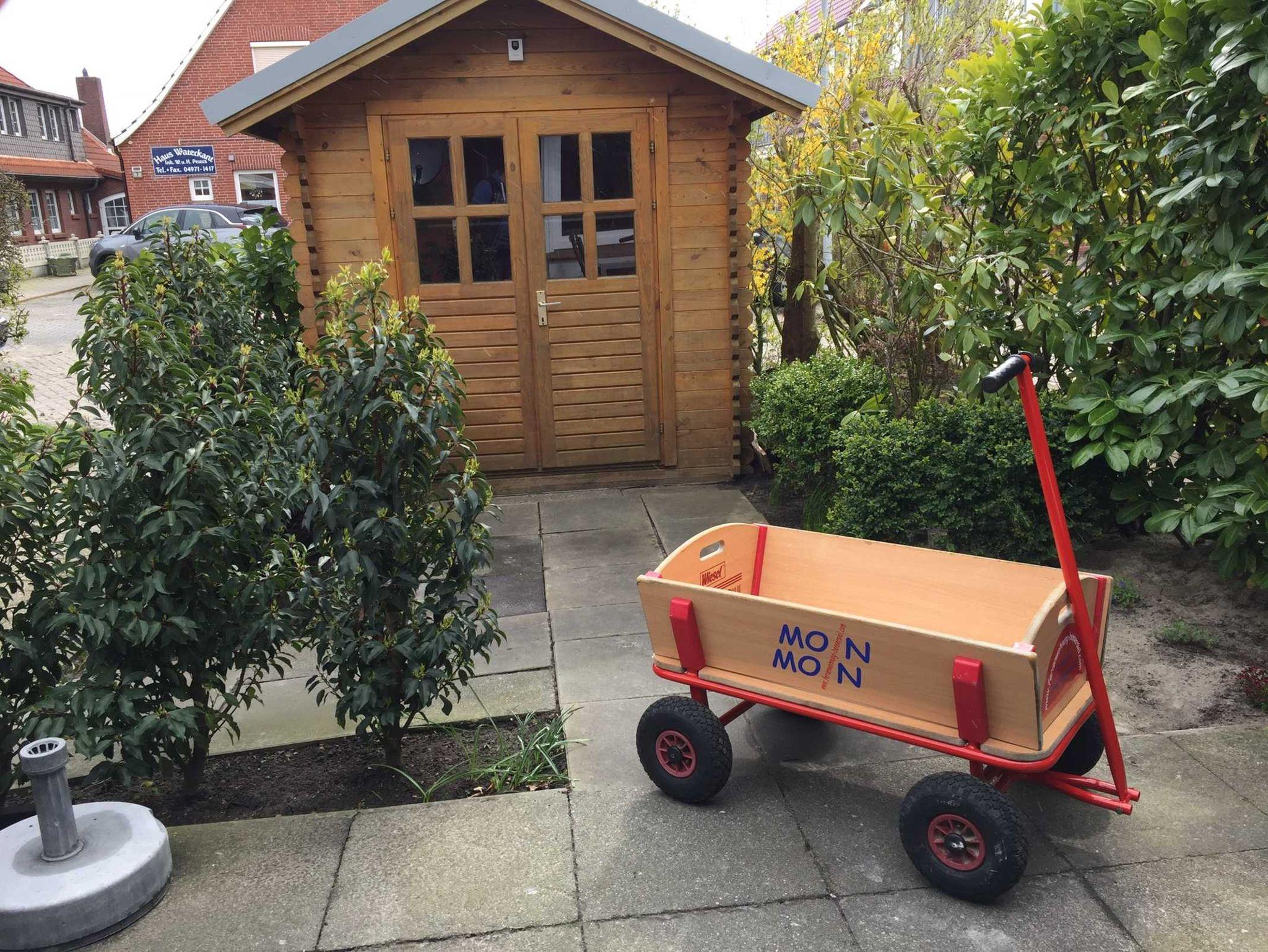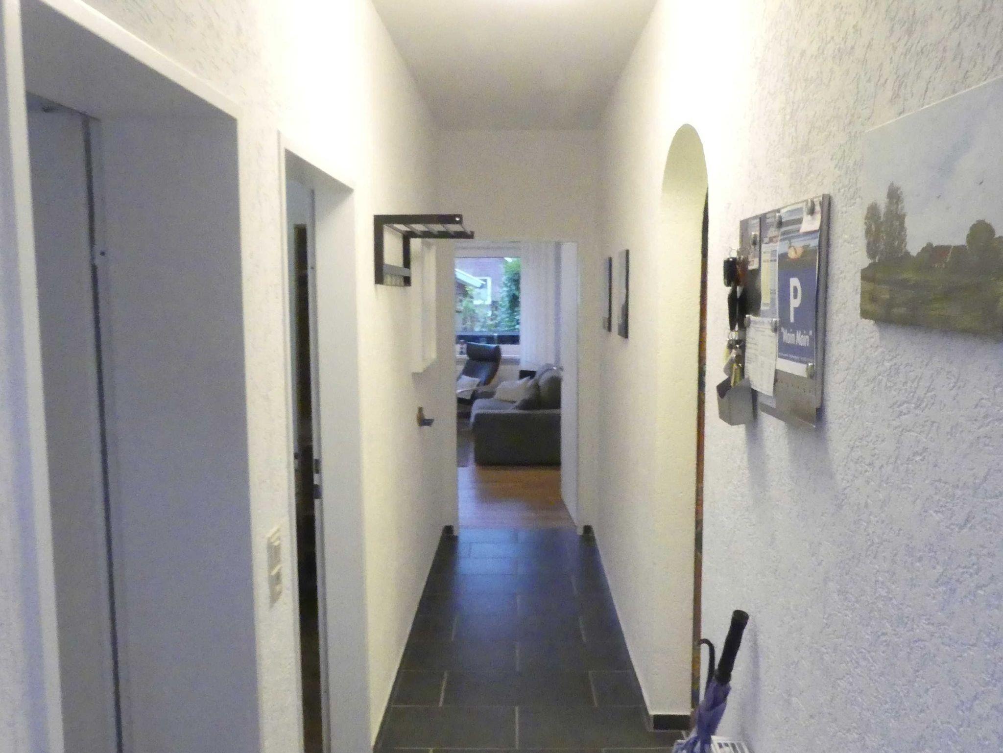 Unsere 51 qm große ebenerdige Ferienwohnung verfügt über 2 separate Schlafräume und einen Wohnbereich mit Küchenzeile. Es handelt sich um eine Erdgeschosswohnung mit Terrasse (Südausrichtung). Ein Schlafzimmer verfügt über ein Doppelbett (1,80 x 2,00 m), der zweite Schlafraum hat ein Etagenbett (0,90 x 2,00 m). Es gibt einen separaten kleinen Raum mit einem Kinderbett (0,70 x 1,20 m). Von der Terasse aus, gelangt man zum Gartenhaus, wo die Fahrräder, der Bollerwagen, der Grill usw. steht.