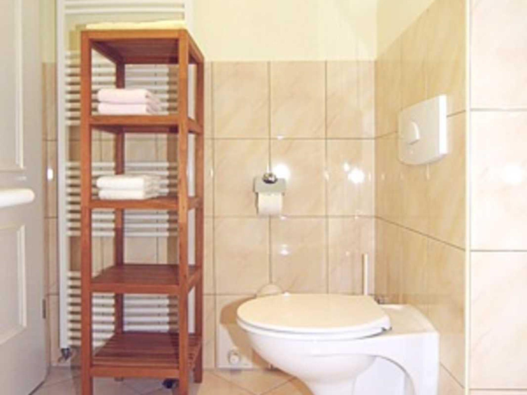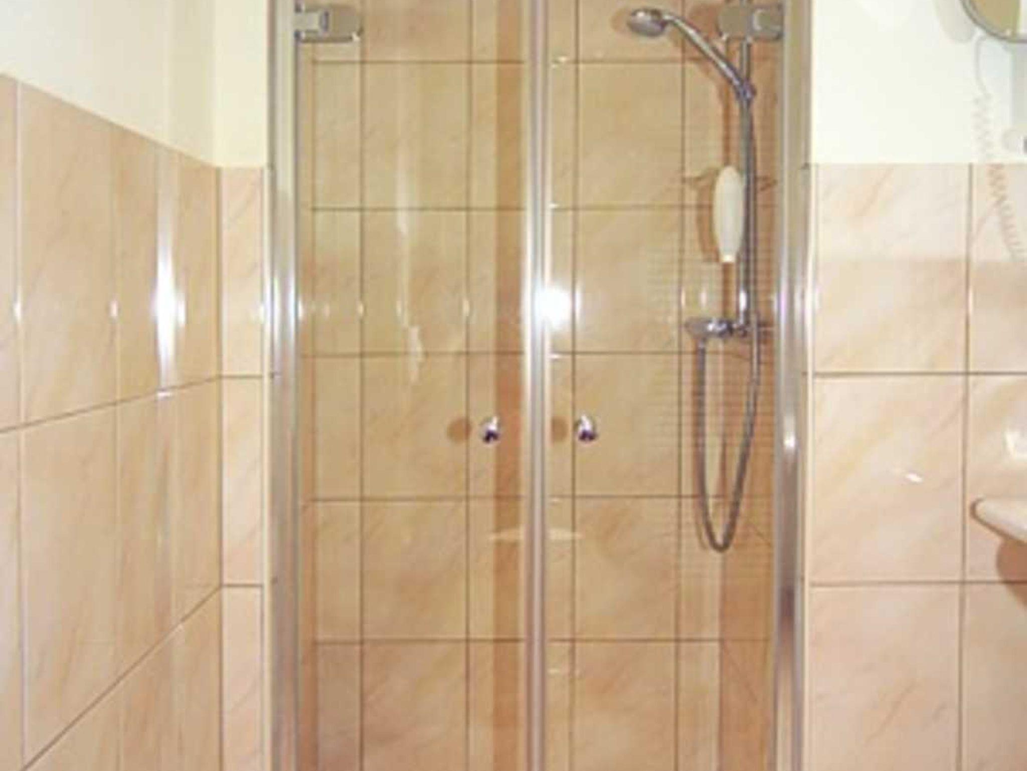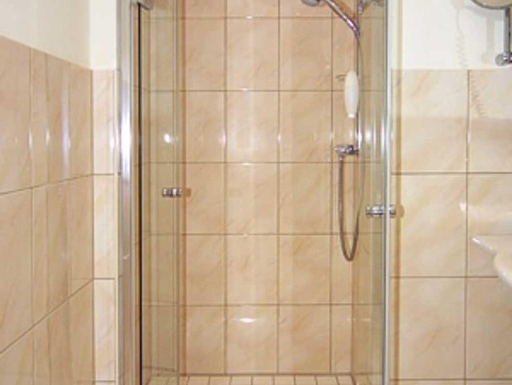 Badezimmer mit Dusche, Waschtisch und WC
