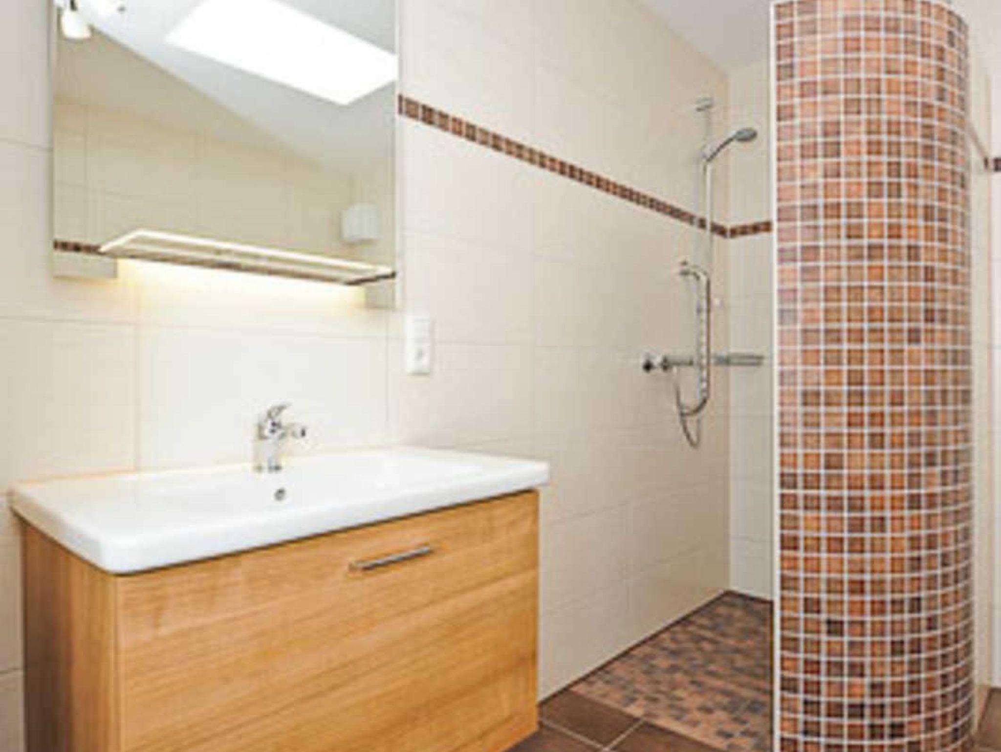 Badezimmer mit Dusche, Waschtisch und WC