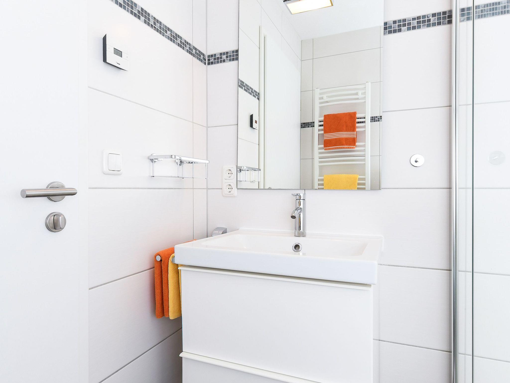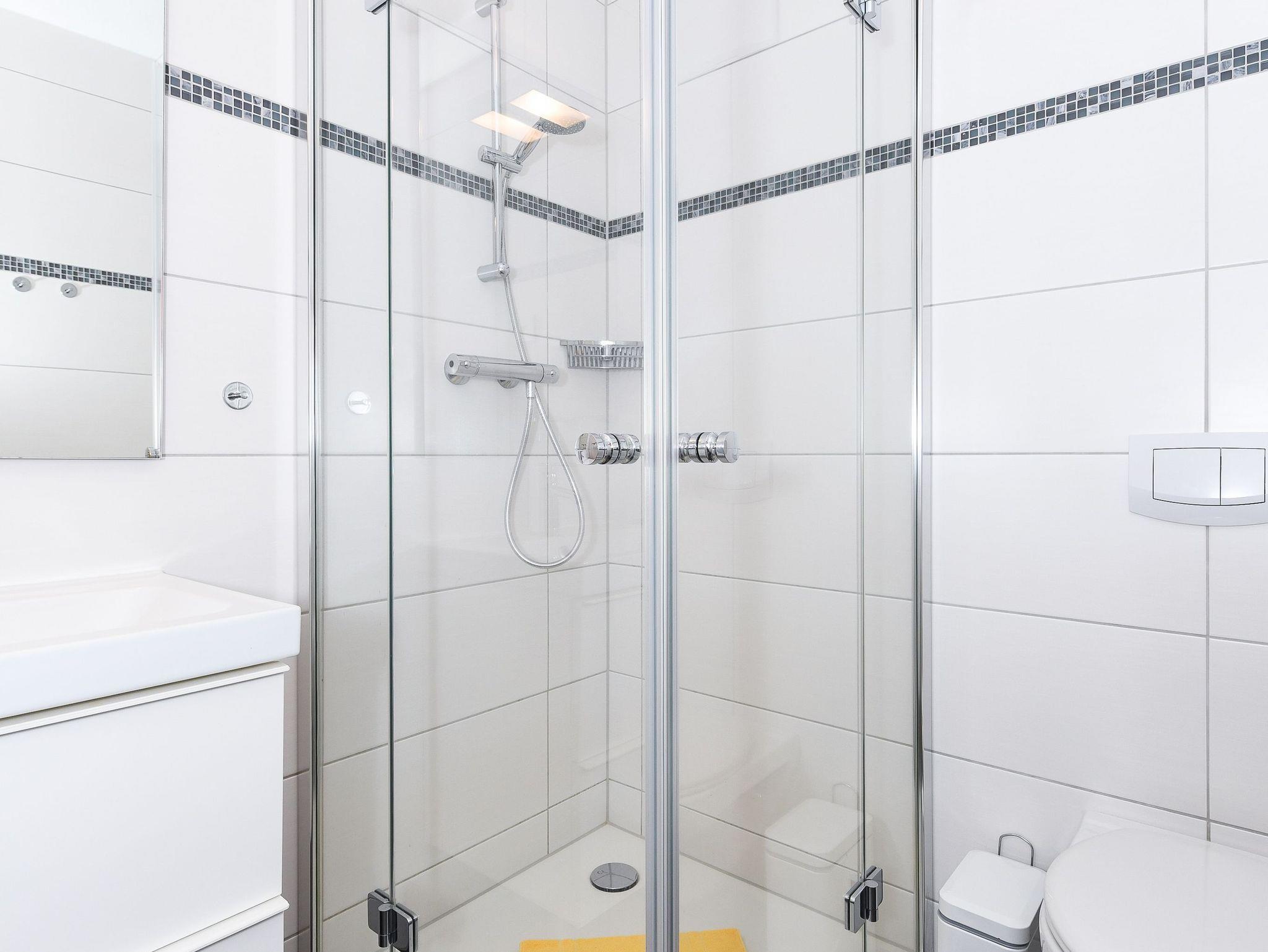 Badezimmer mit Dusche, Waschtisch und WC
