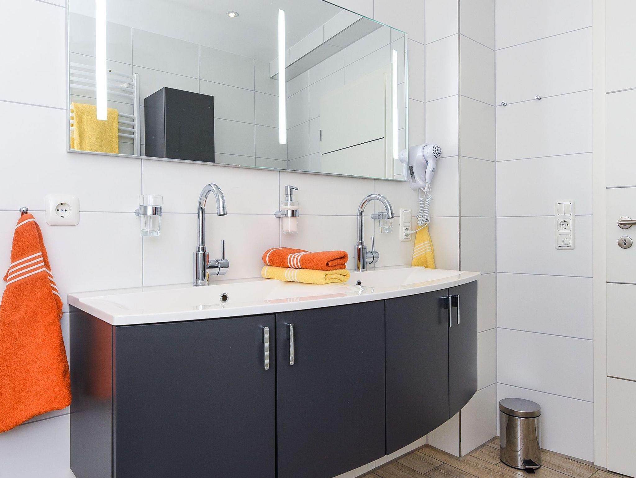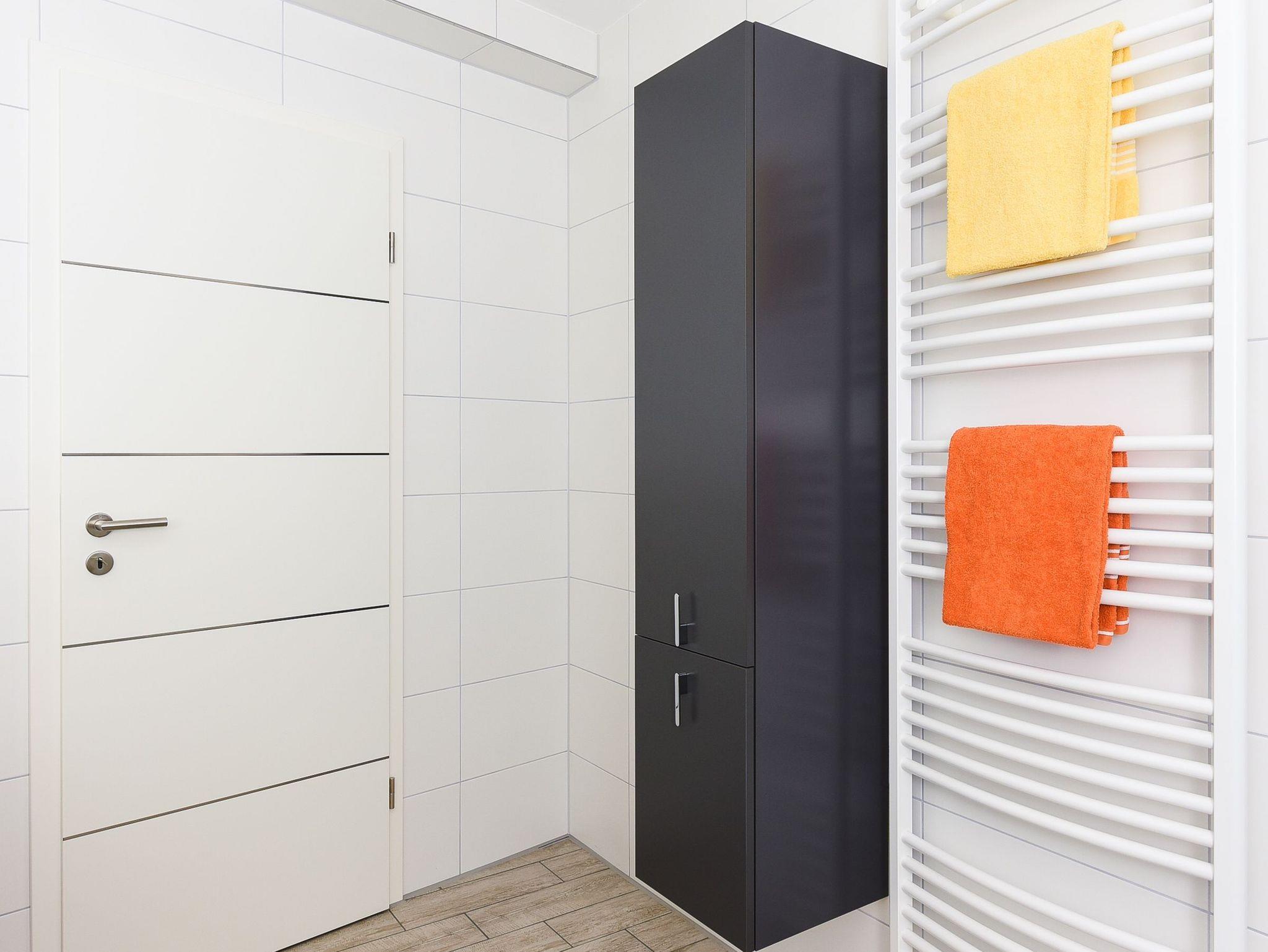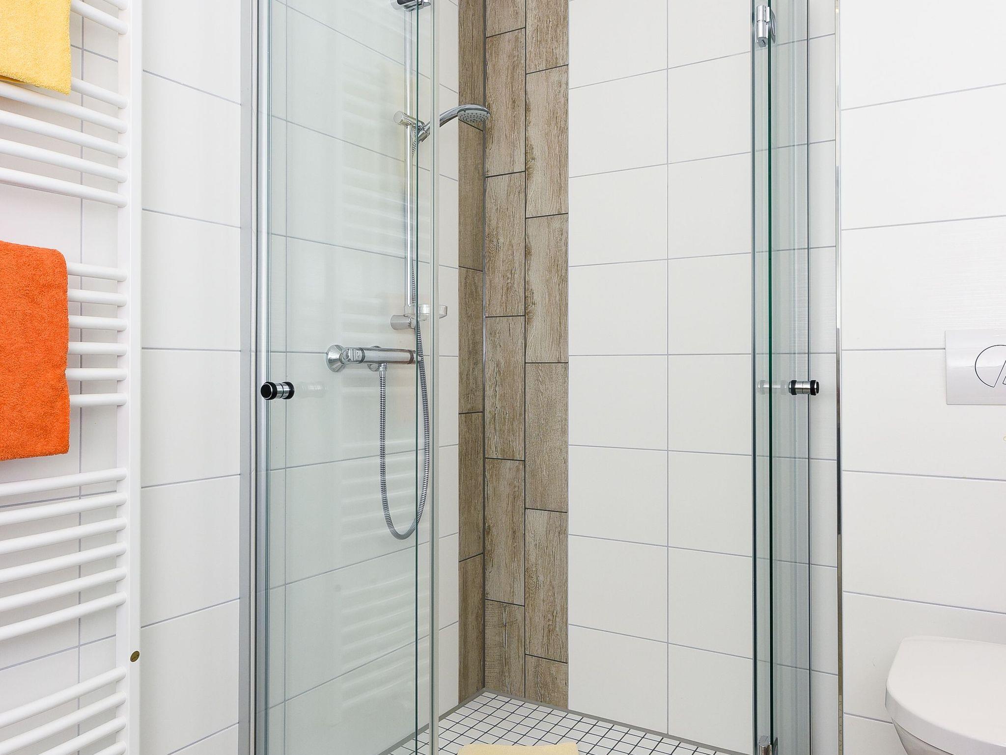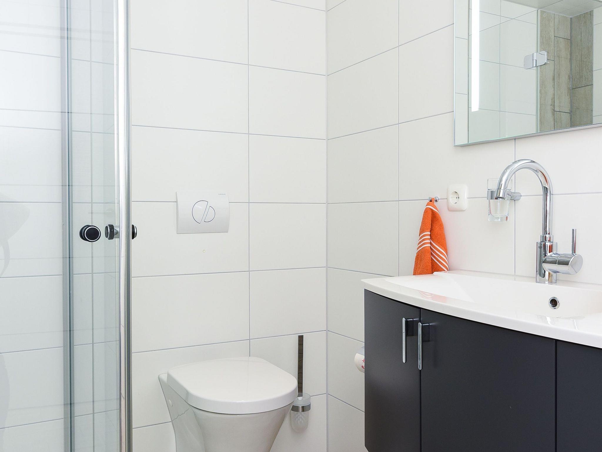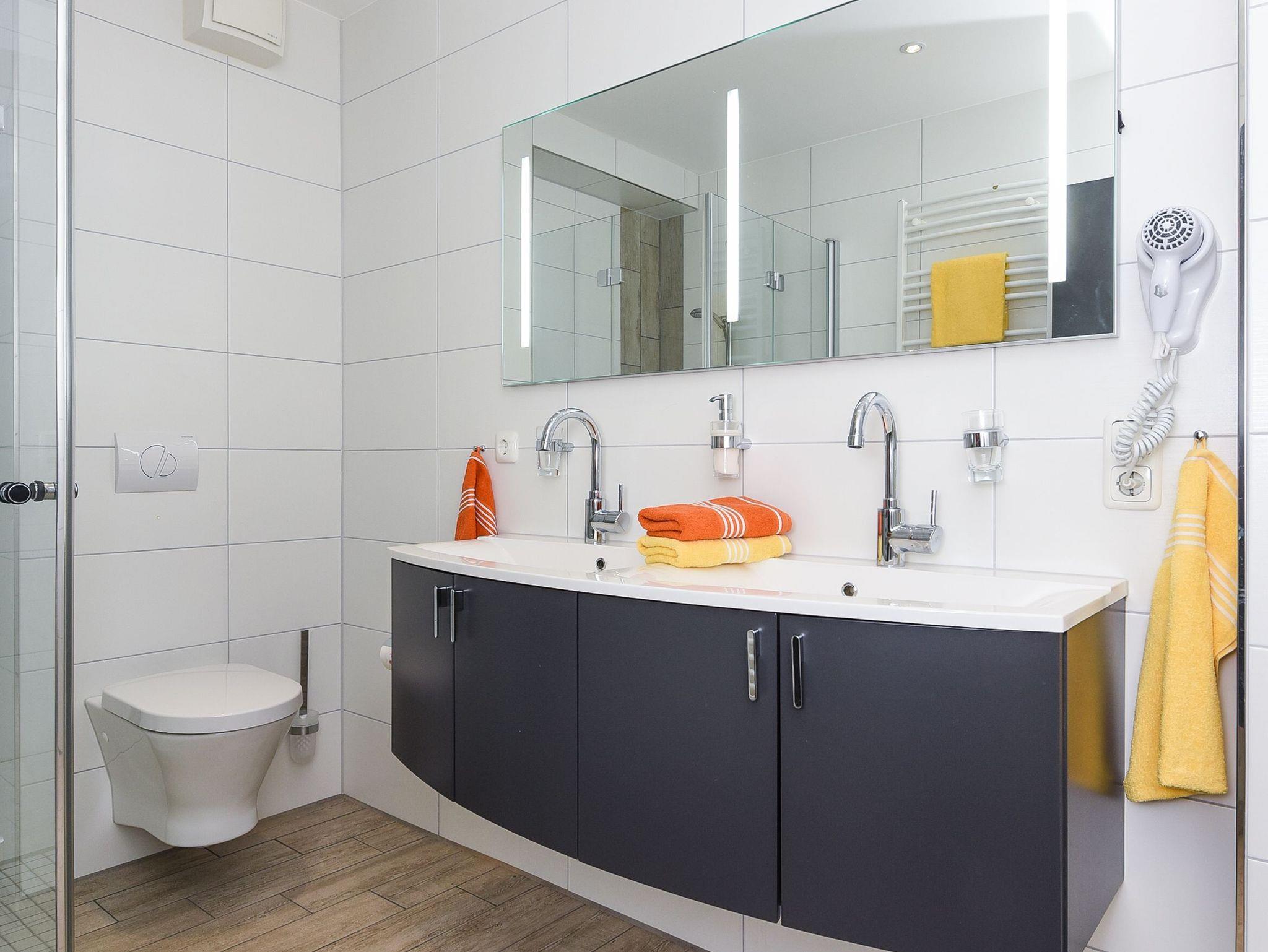 Badezimmer mit Dusche, Waschtisch und WC