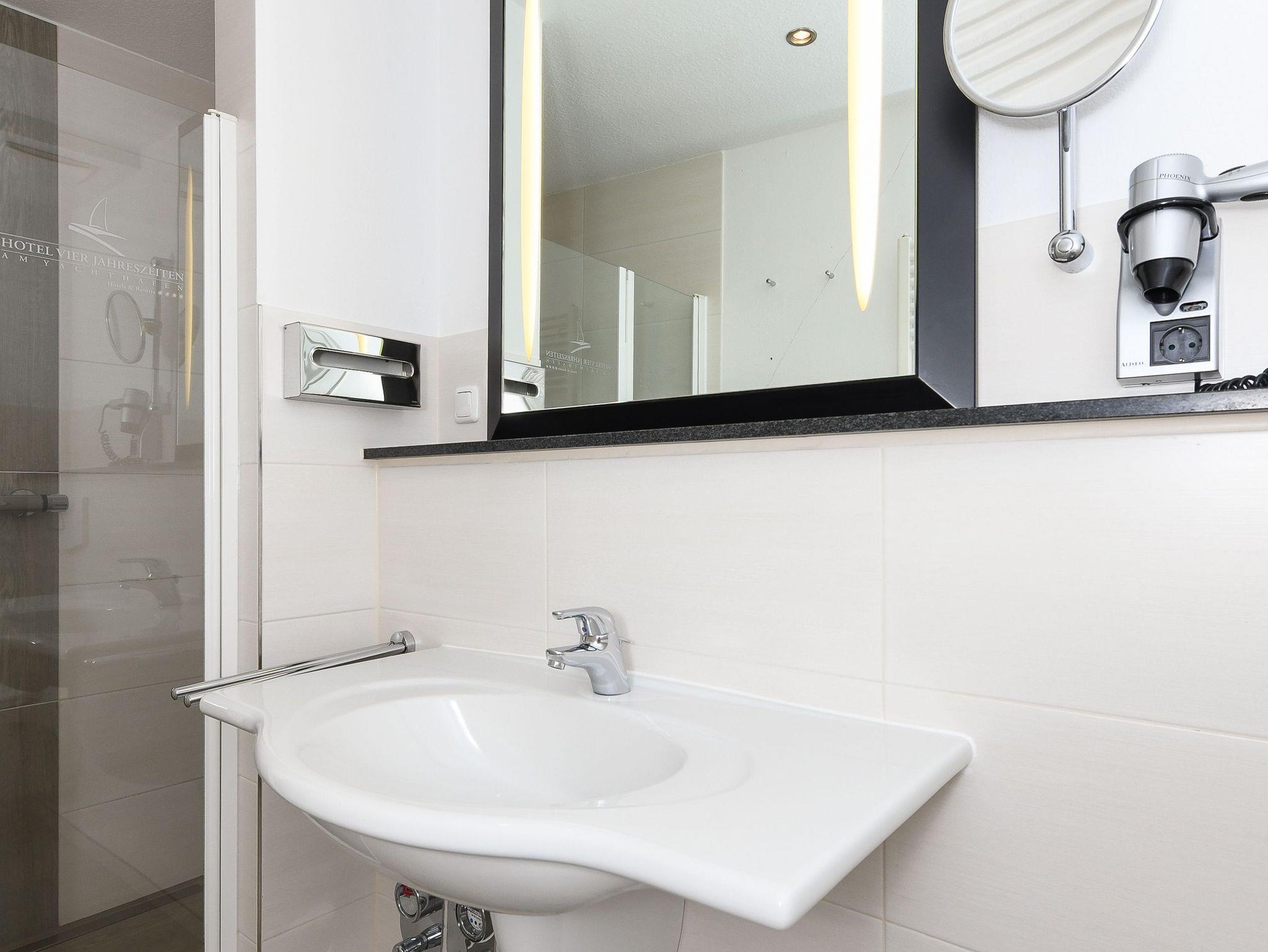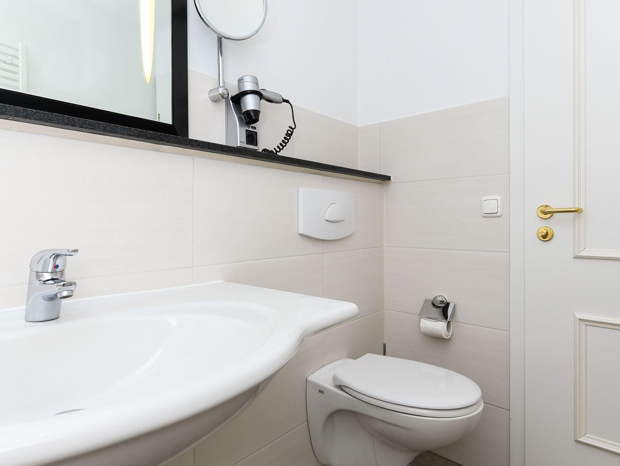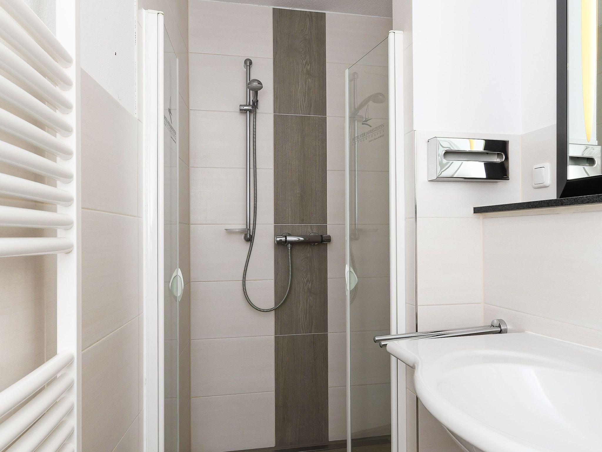 Badezimmer mit Dusche, Waschtisch und WC