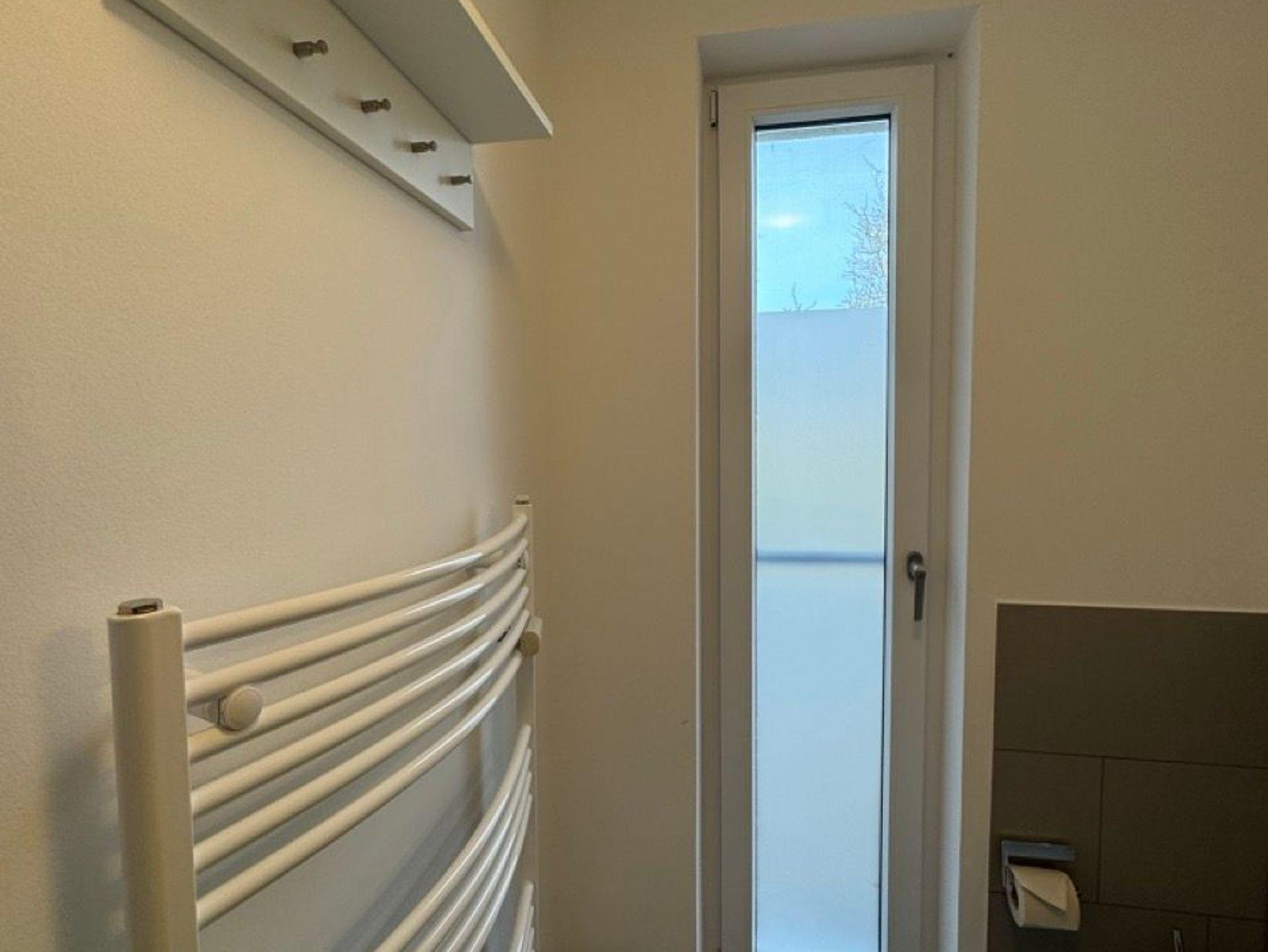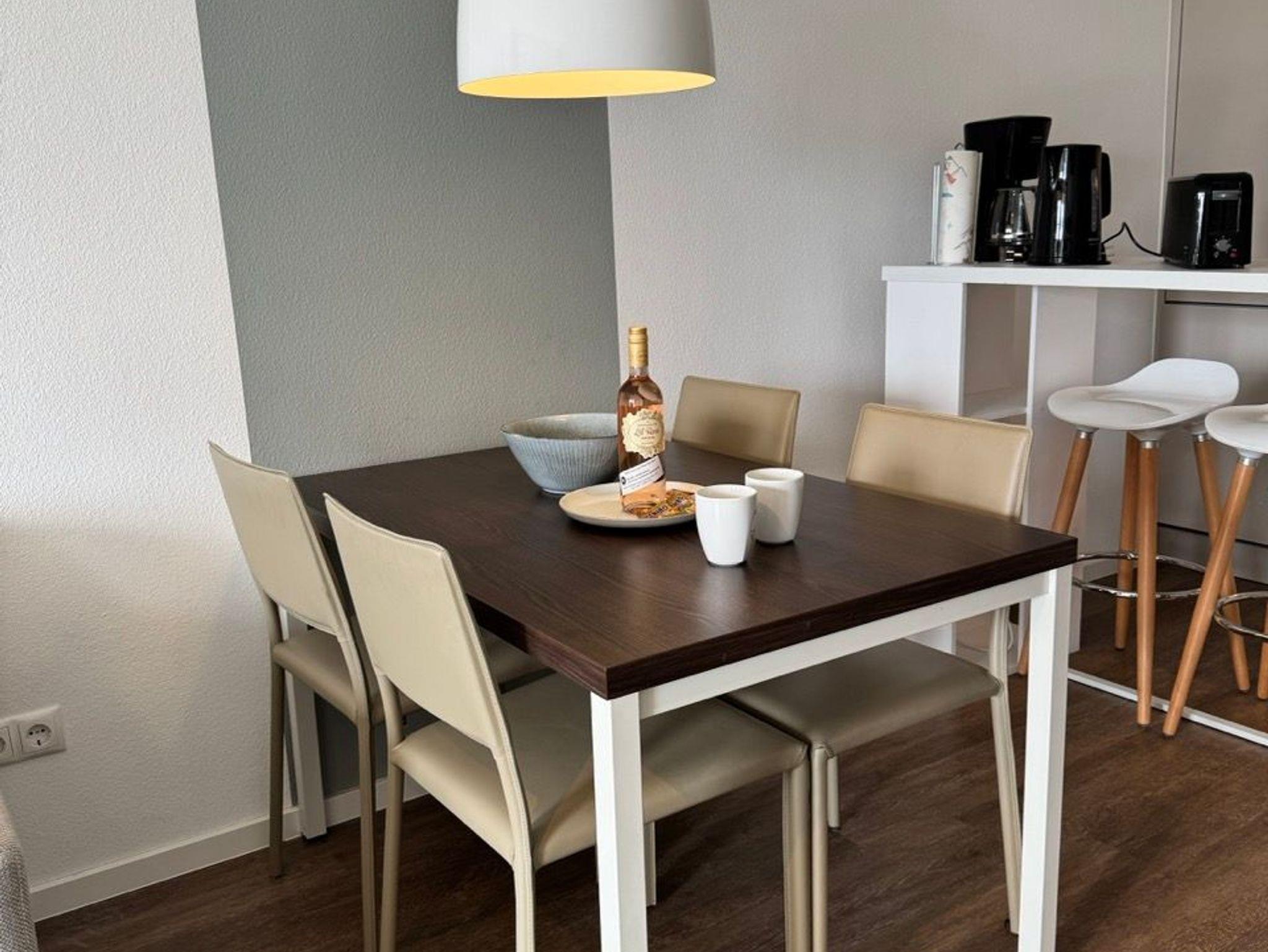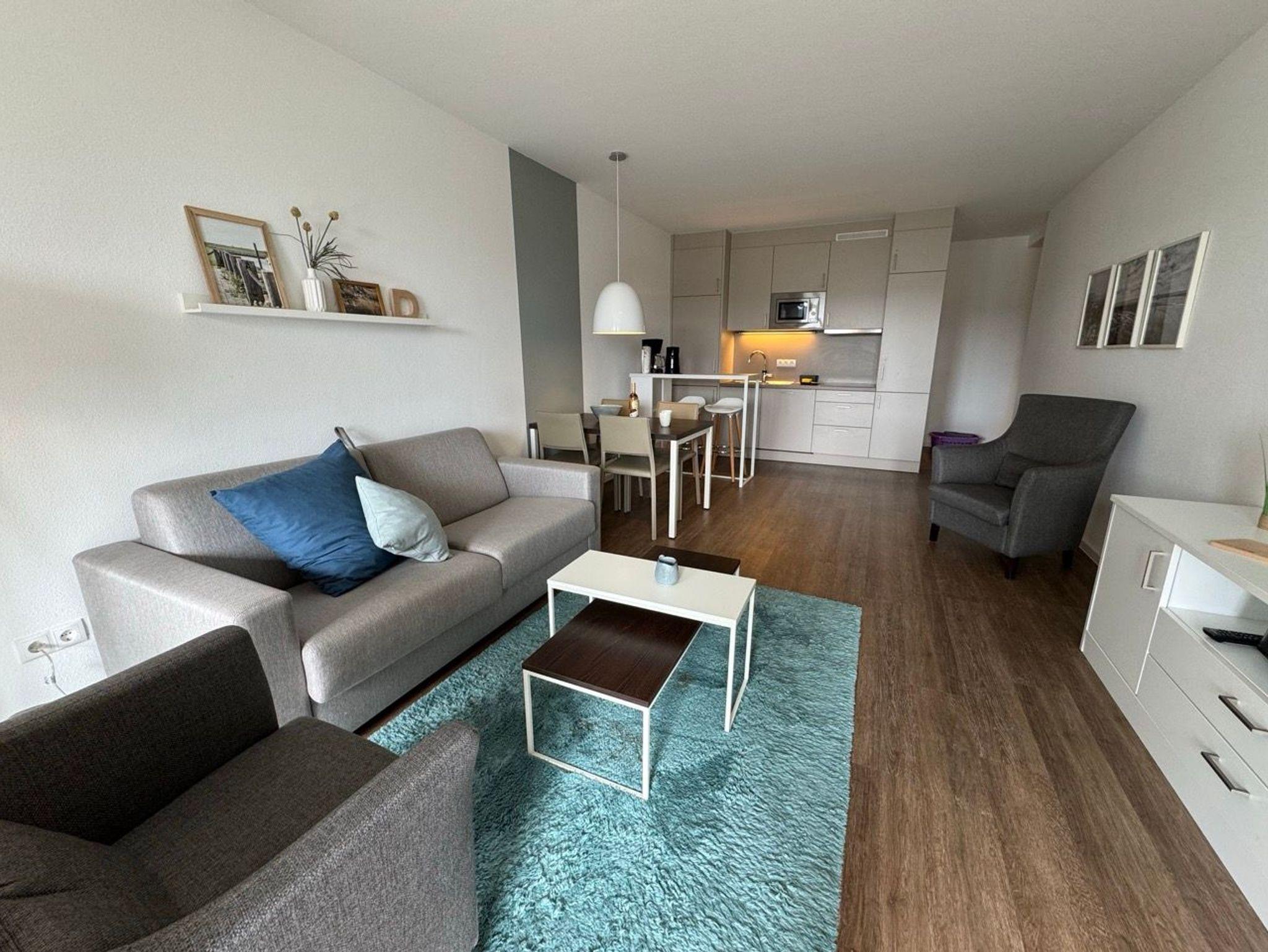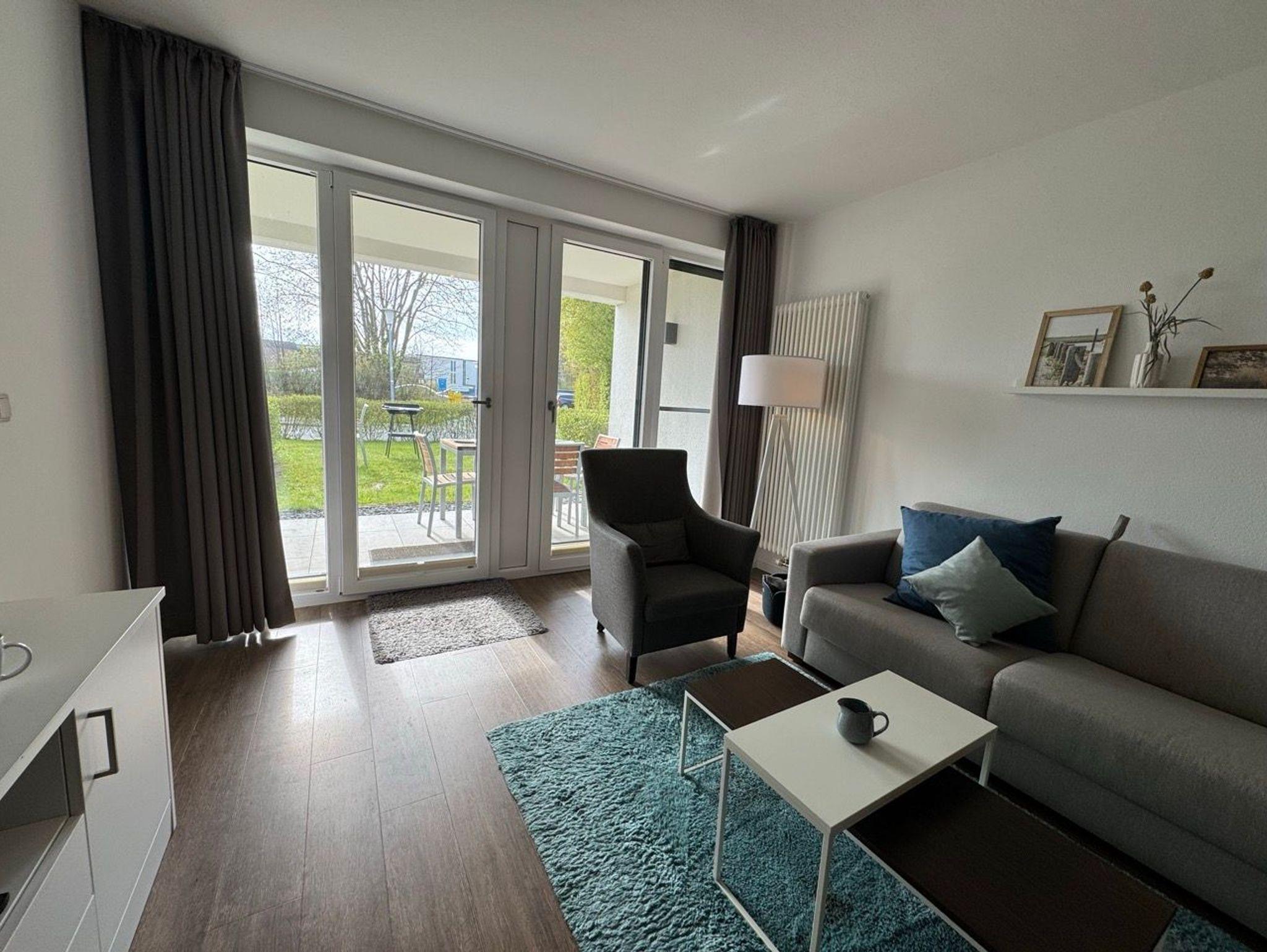 Große Fenster sorgen für viel Tageslicht. Die Möblierung ist schlicht, modern und funktional ideal für Gäste, die eine gepflegte und aufgeräumte Atmosphäre schätzen.