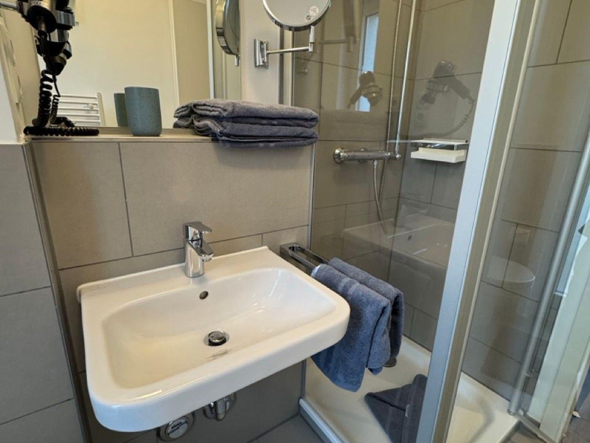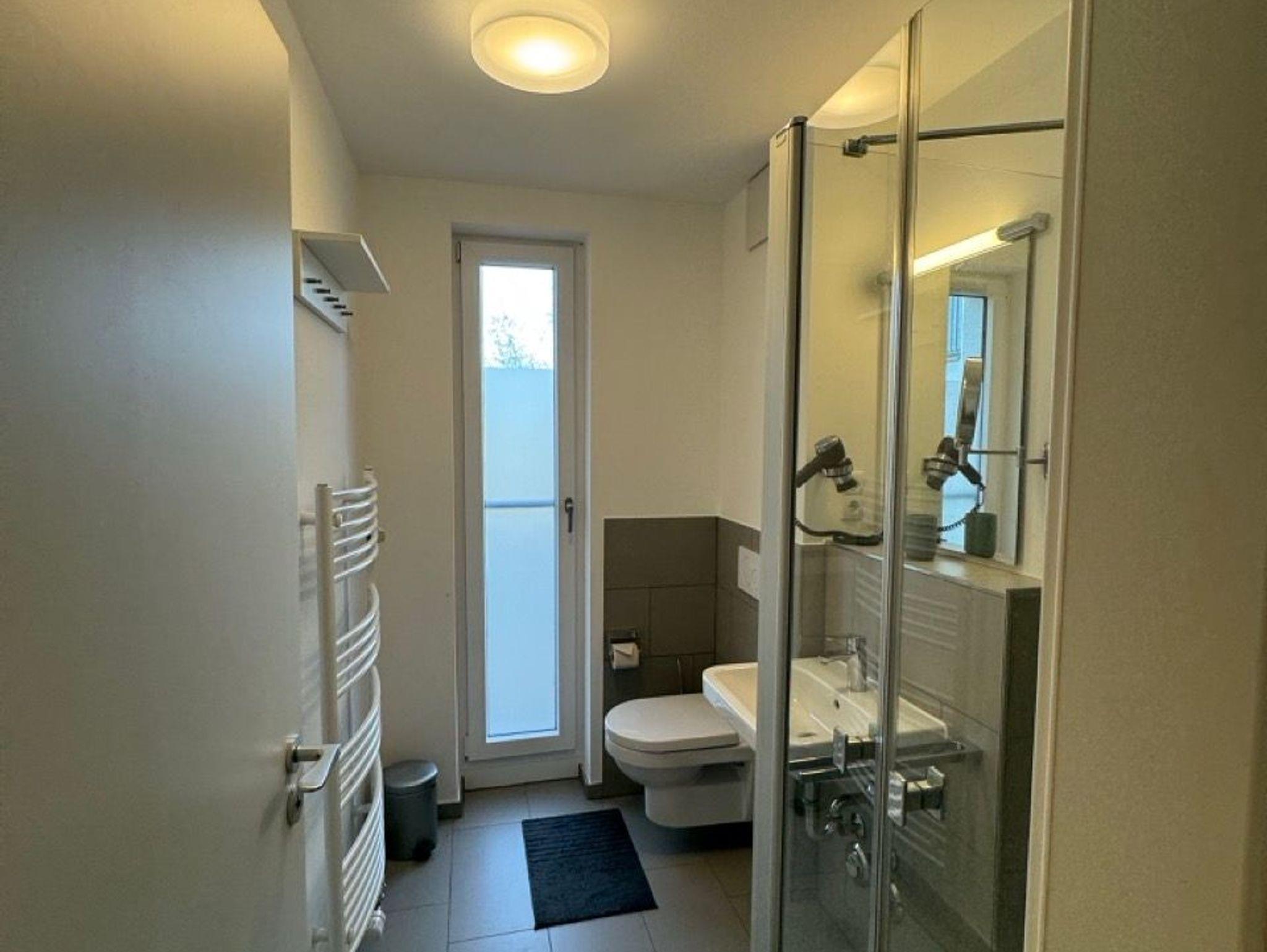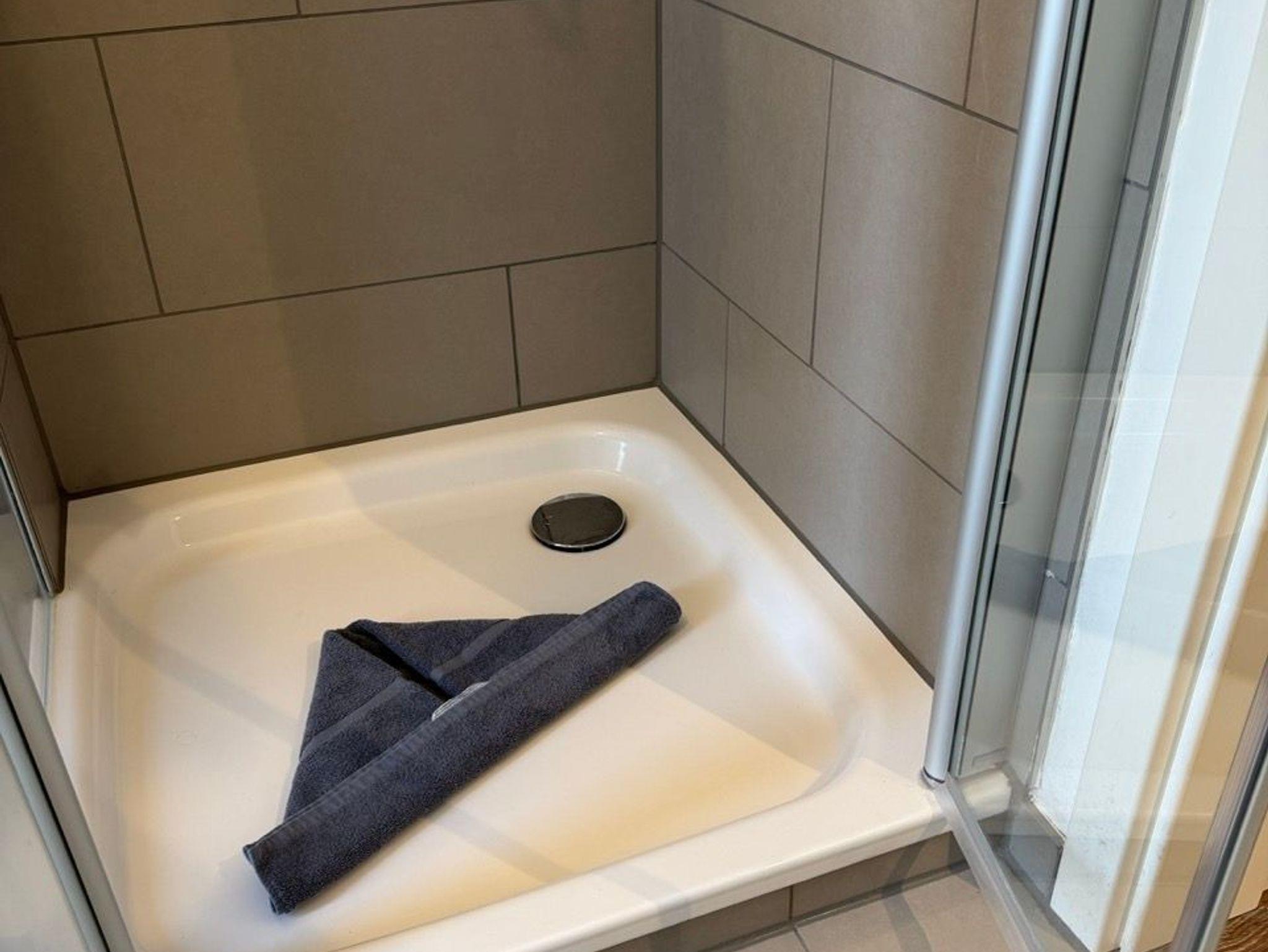 Badezimmer Funktional, modern und gepflegtDas Badezimmer ist mit einer großen Dusche, einem Waschbecken mit Spiegel, einem Föhn und ausreichend Ablagemöglichkeiten ausgestattet. Die Gestaltung ist hell und freundlich, die Ausstattung modern und praktisch.