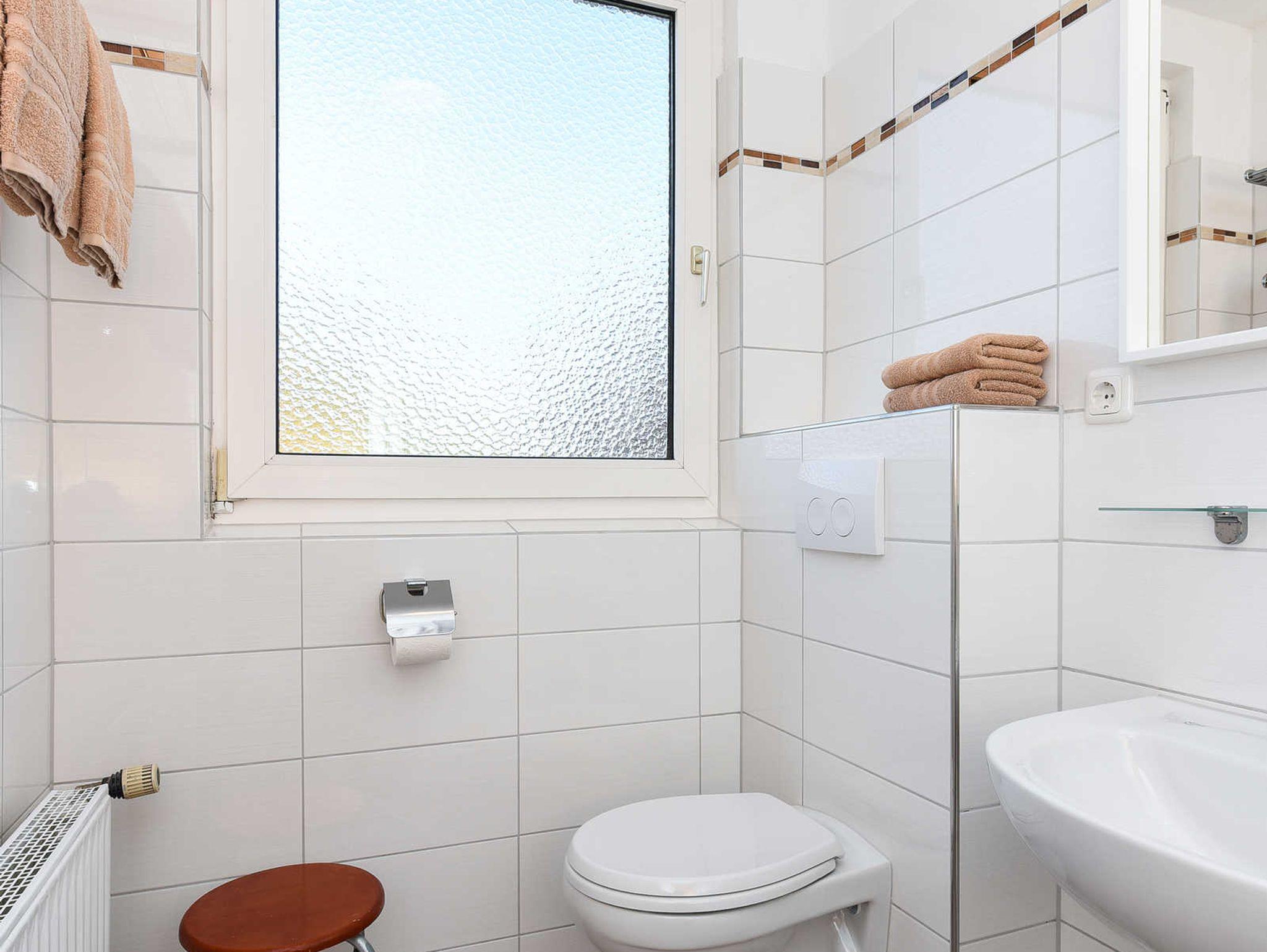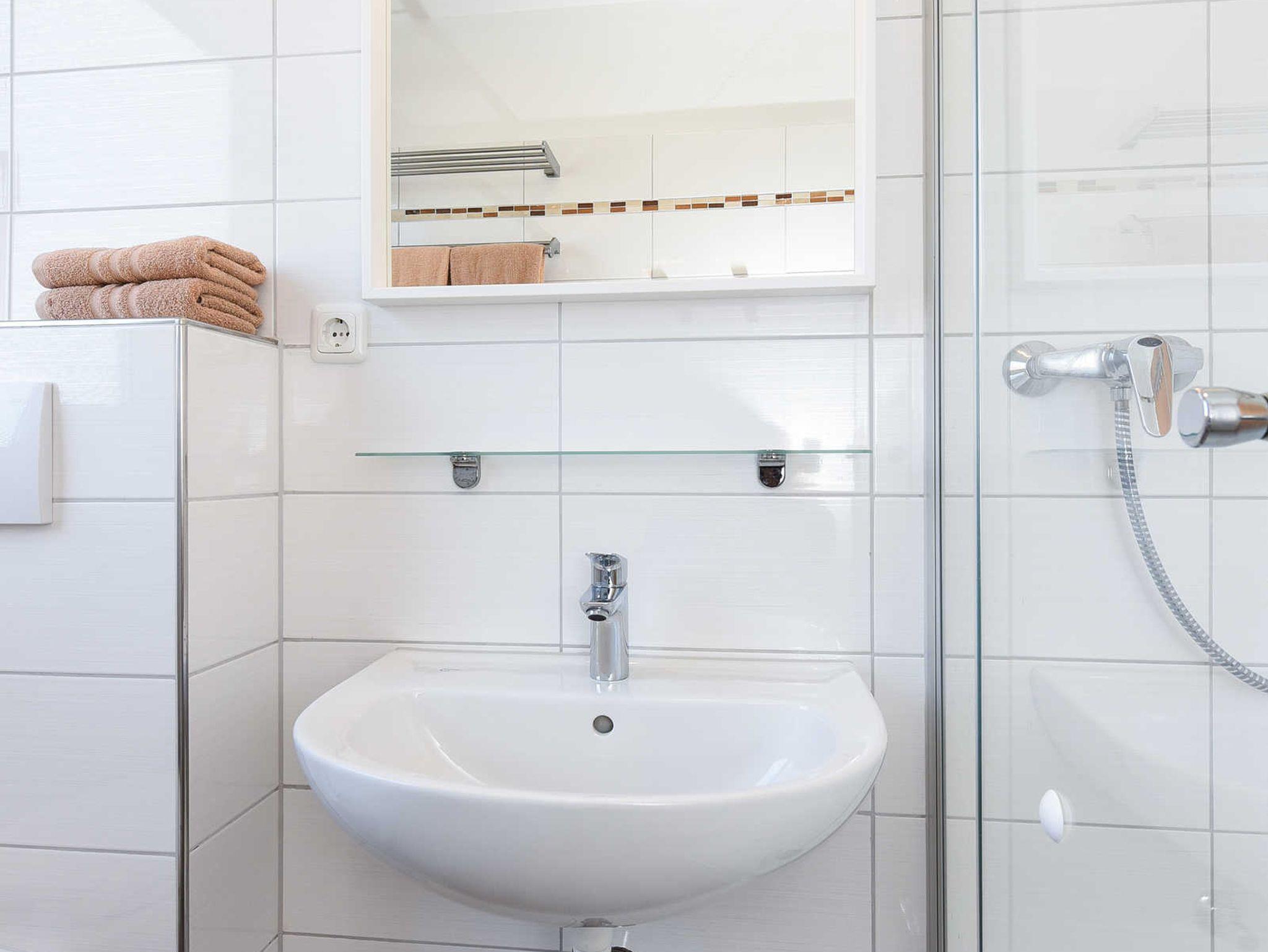 Badezimmer mit Dusche, Waschtisch und WC