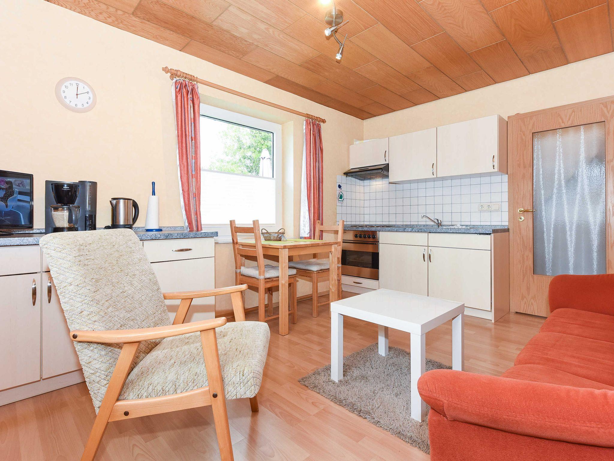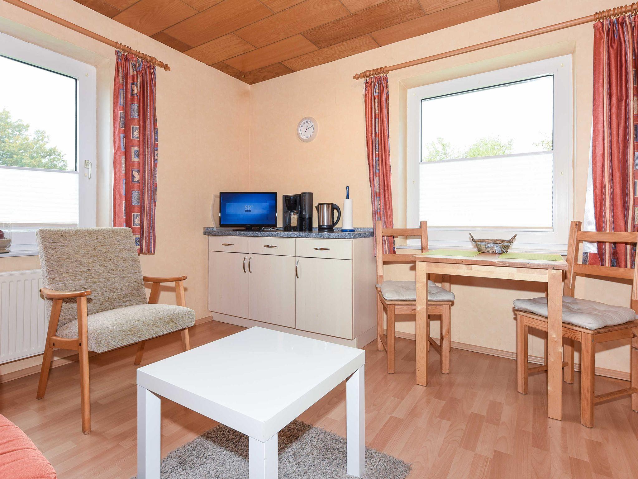 Größe ca. 40 Quadratmeter, Wohnküche mit Essgruppe und Wohnzimmer-Garnitur, Schlafzimmer, Badezimmer mit Dusche, Waschtisch und WC, Erdgeschoss, optimal für 2 Personen.
