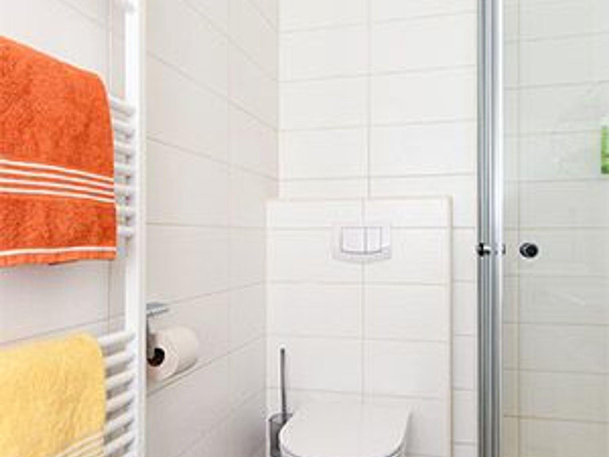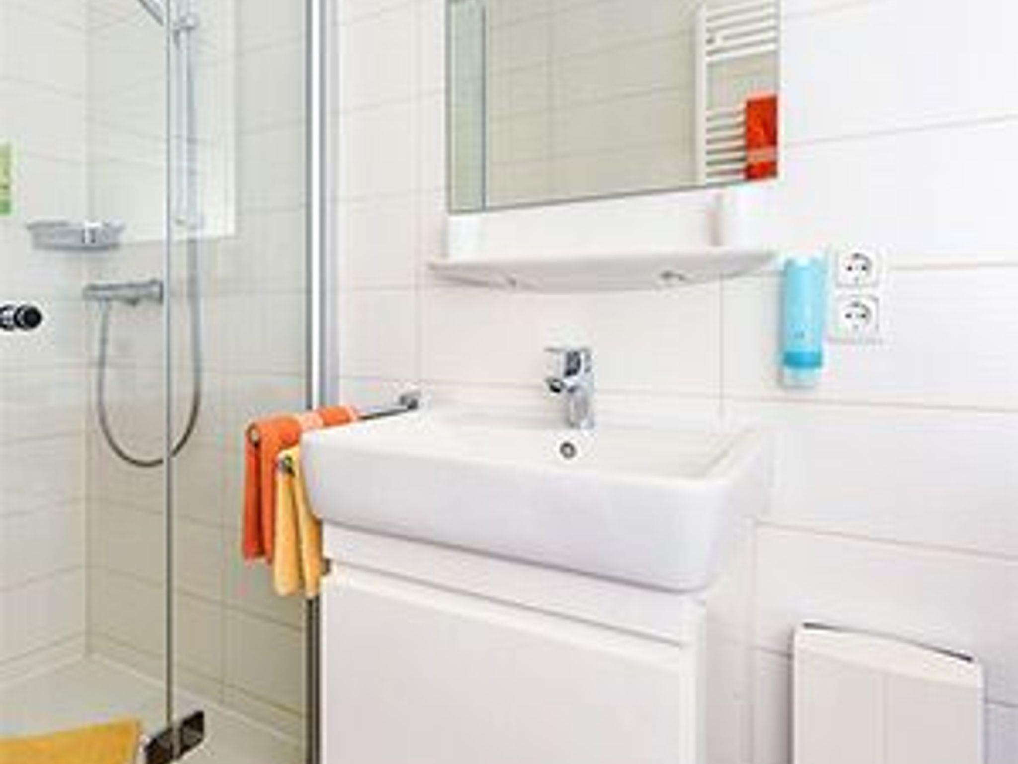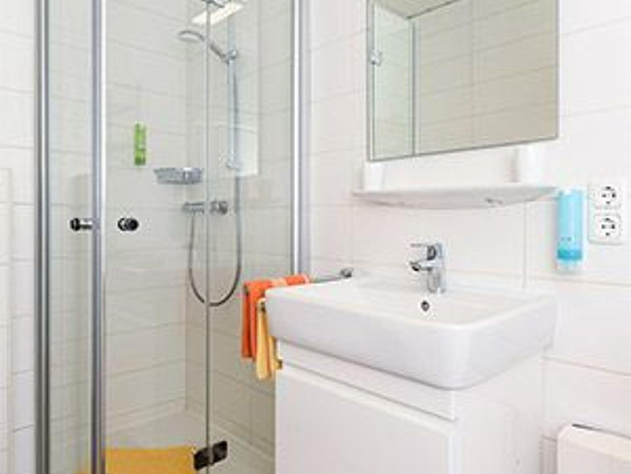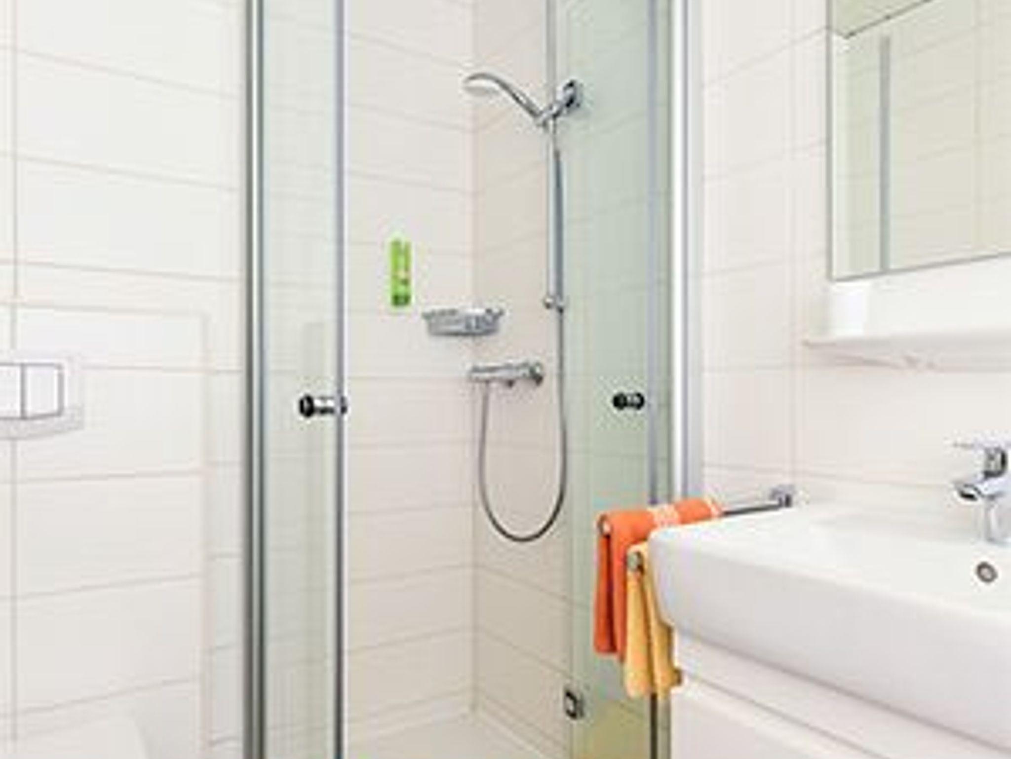 Badezimmer mit Dusche, Waschtisch und WC