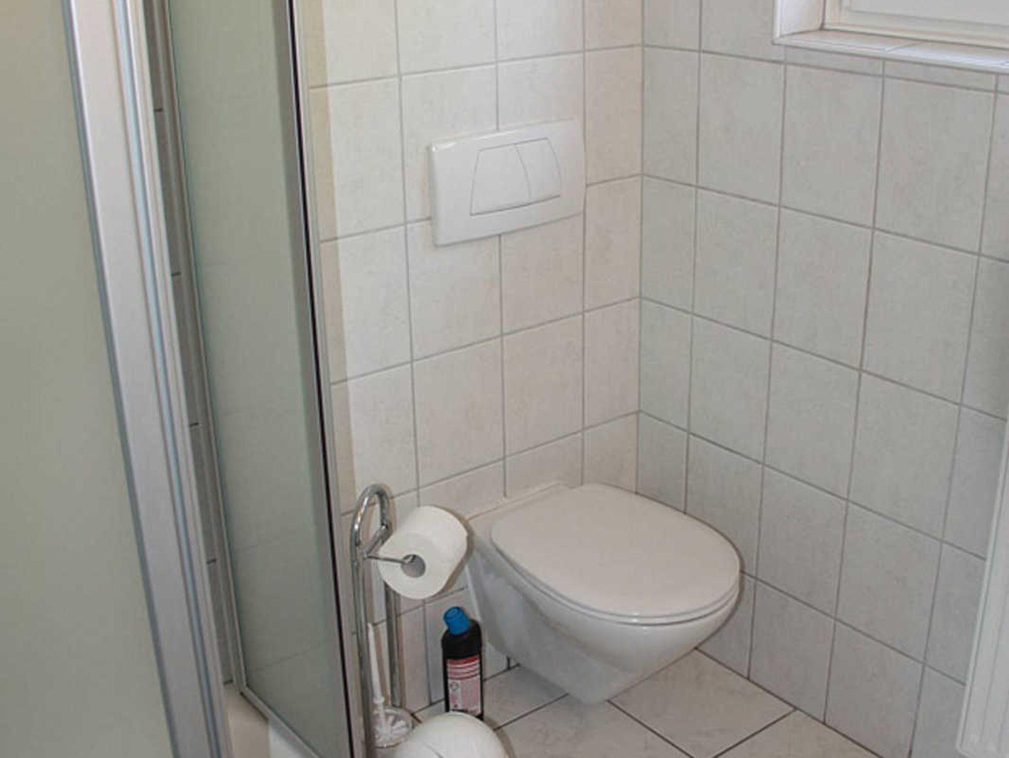 Badezimmer mit Dusche, Waschtisch und WC