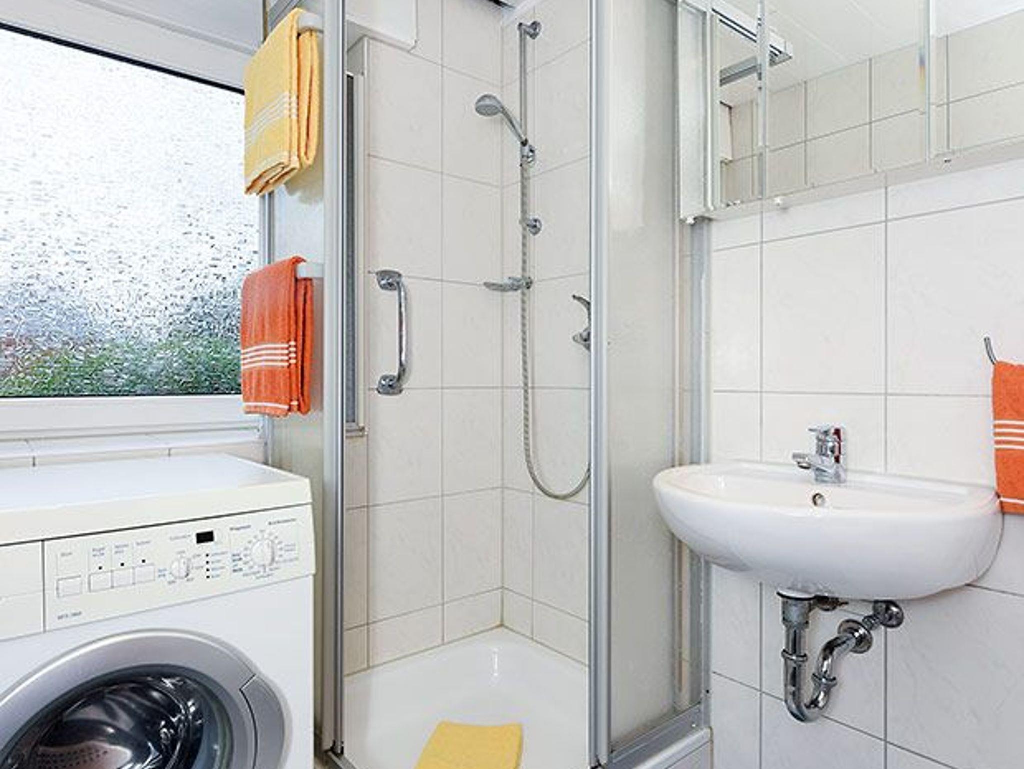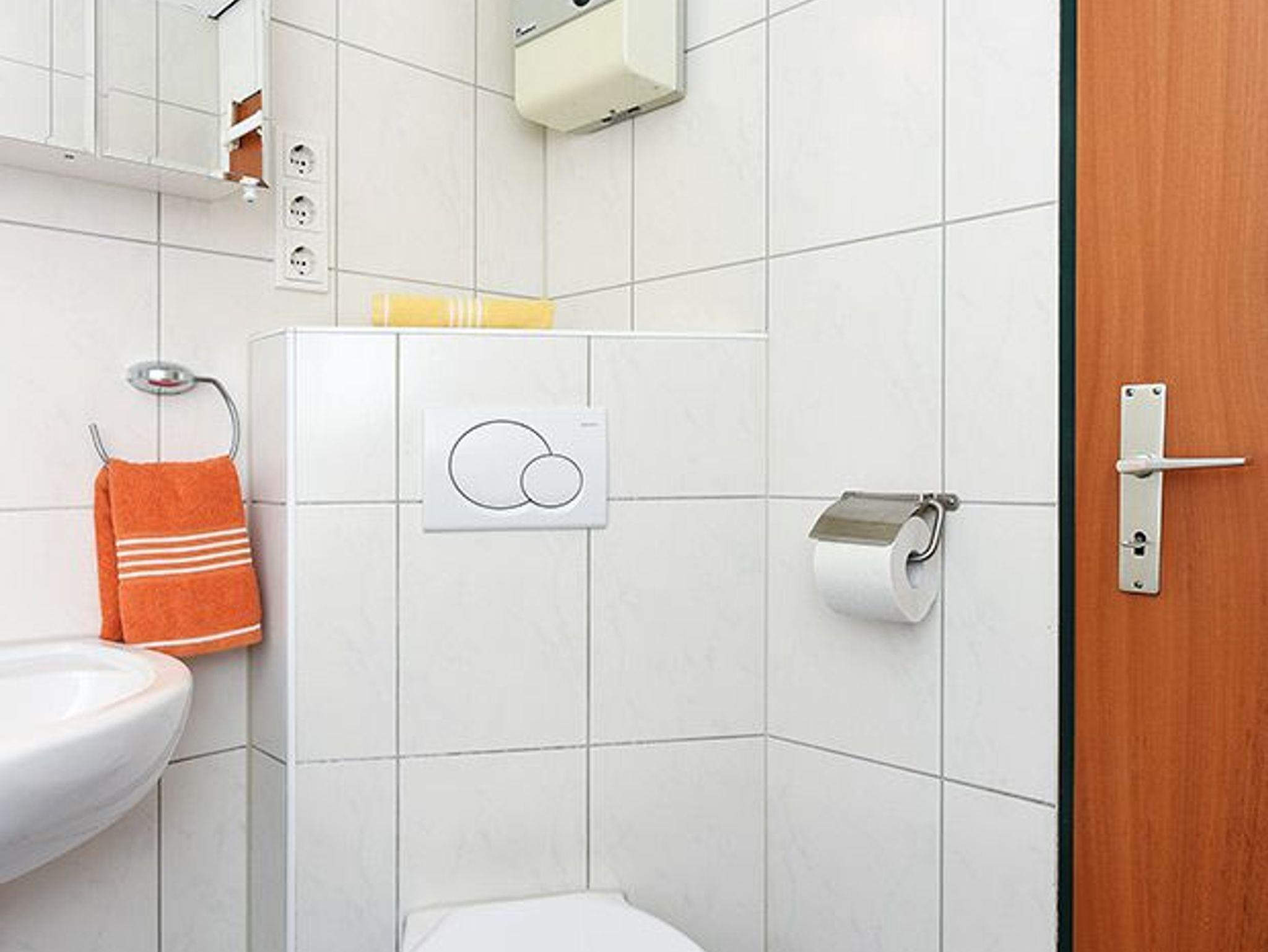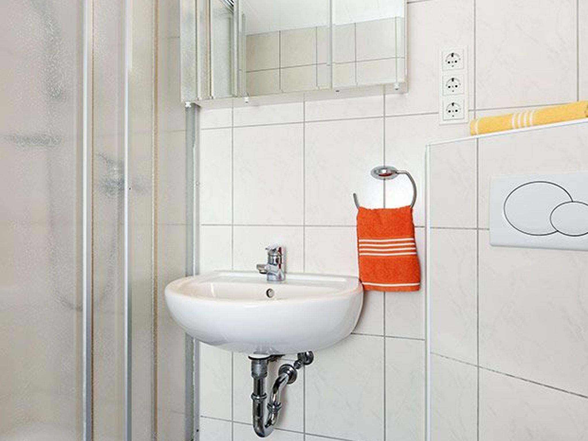 Badezimmer mit Dusche, Waschtisch und WC