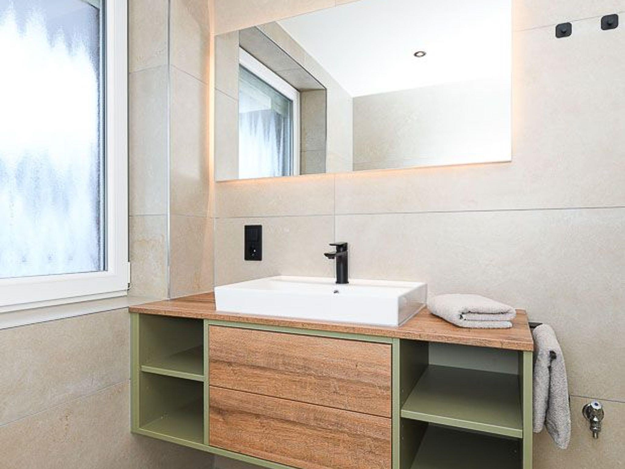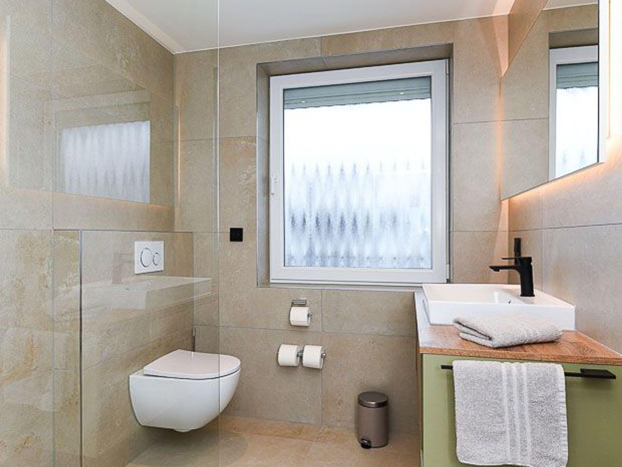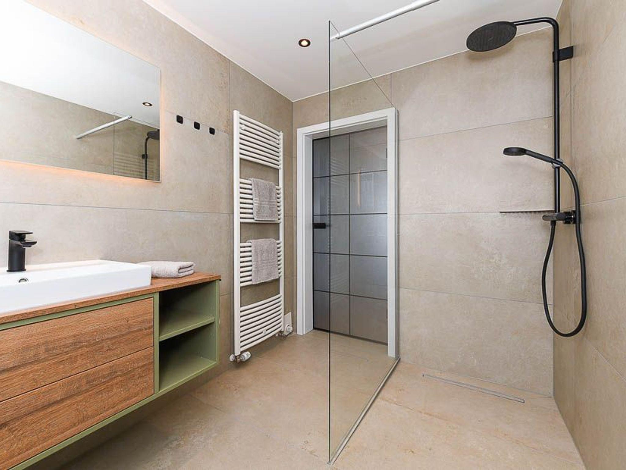 Badezimmer mit Dusche, Waschtisch und WC