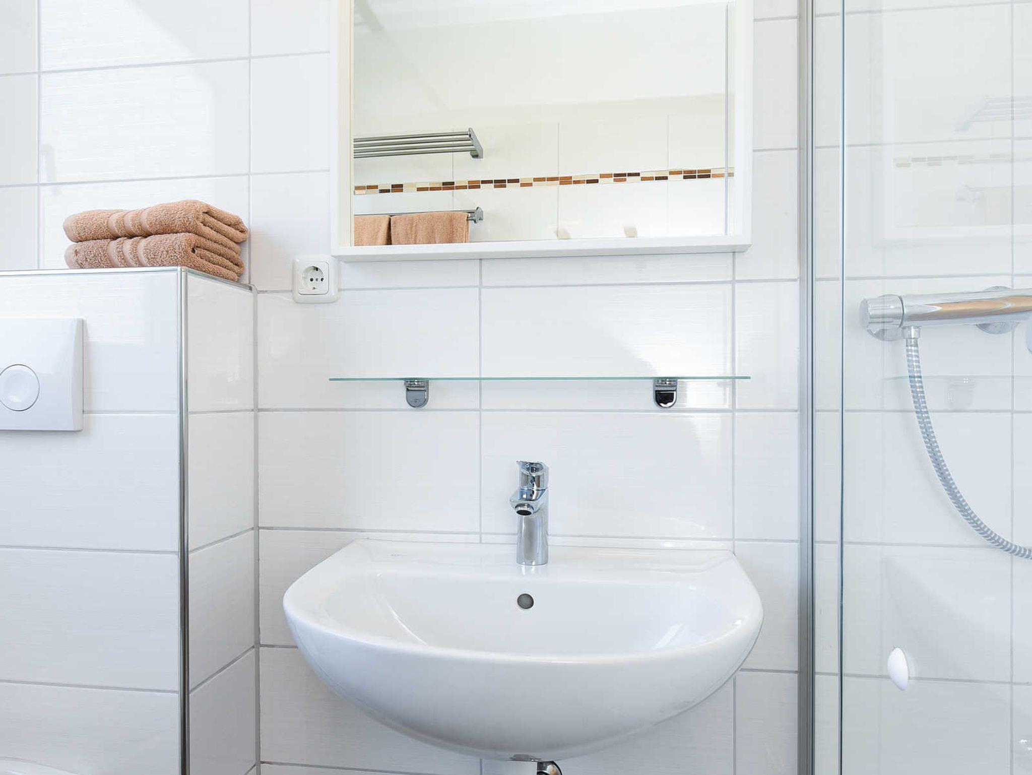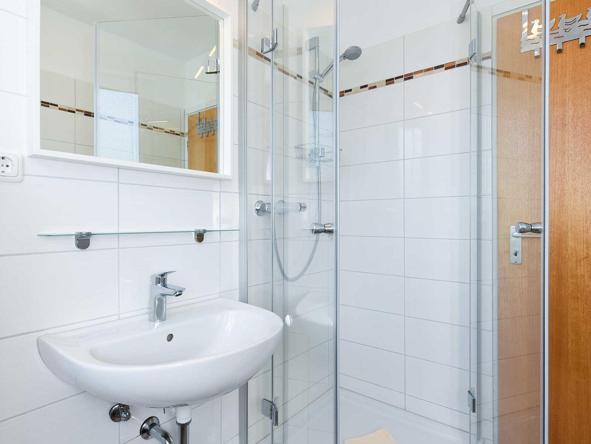Badezimmer mit Dusche, Waschtisch und WC